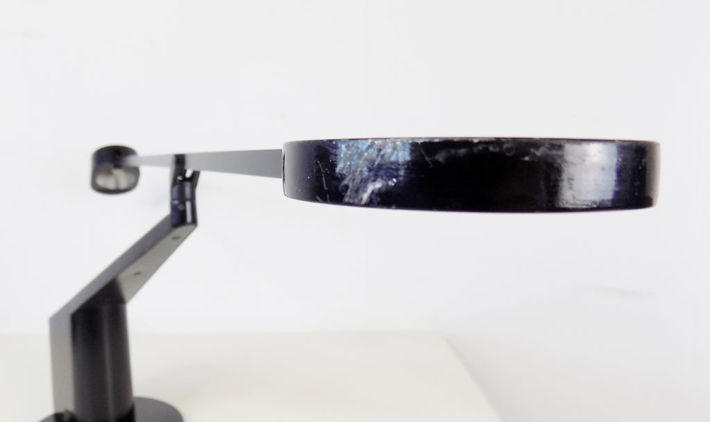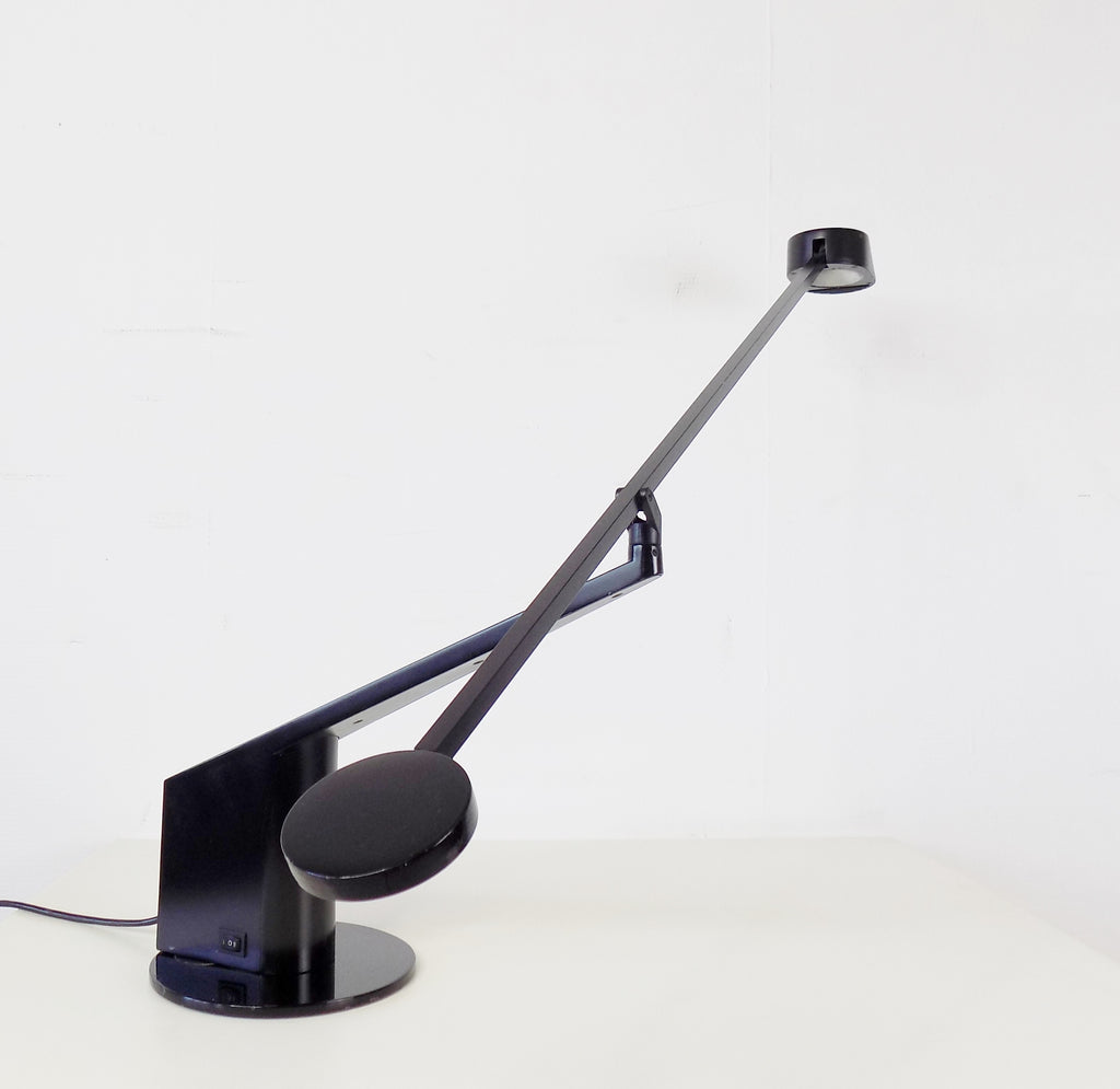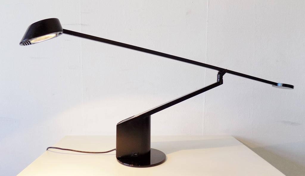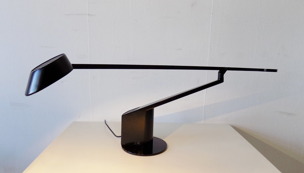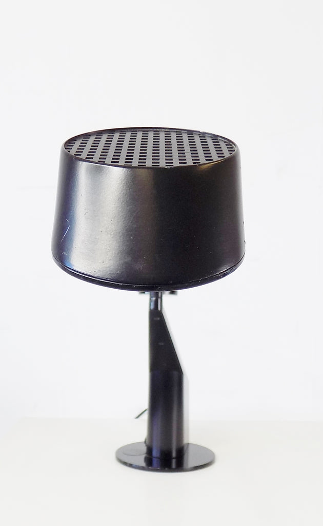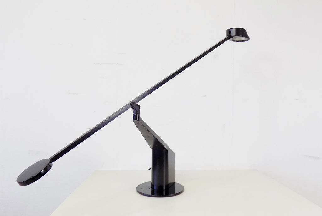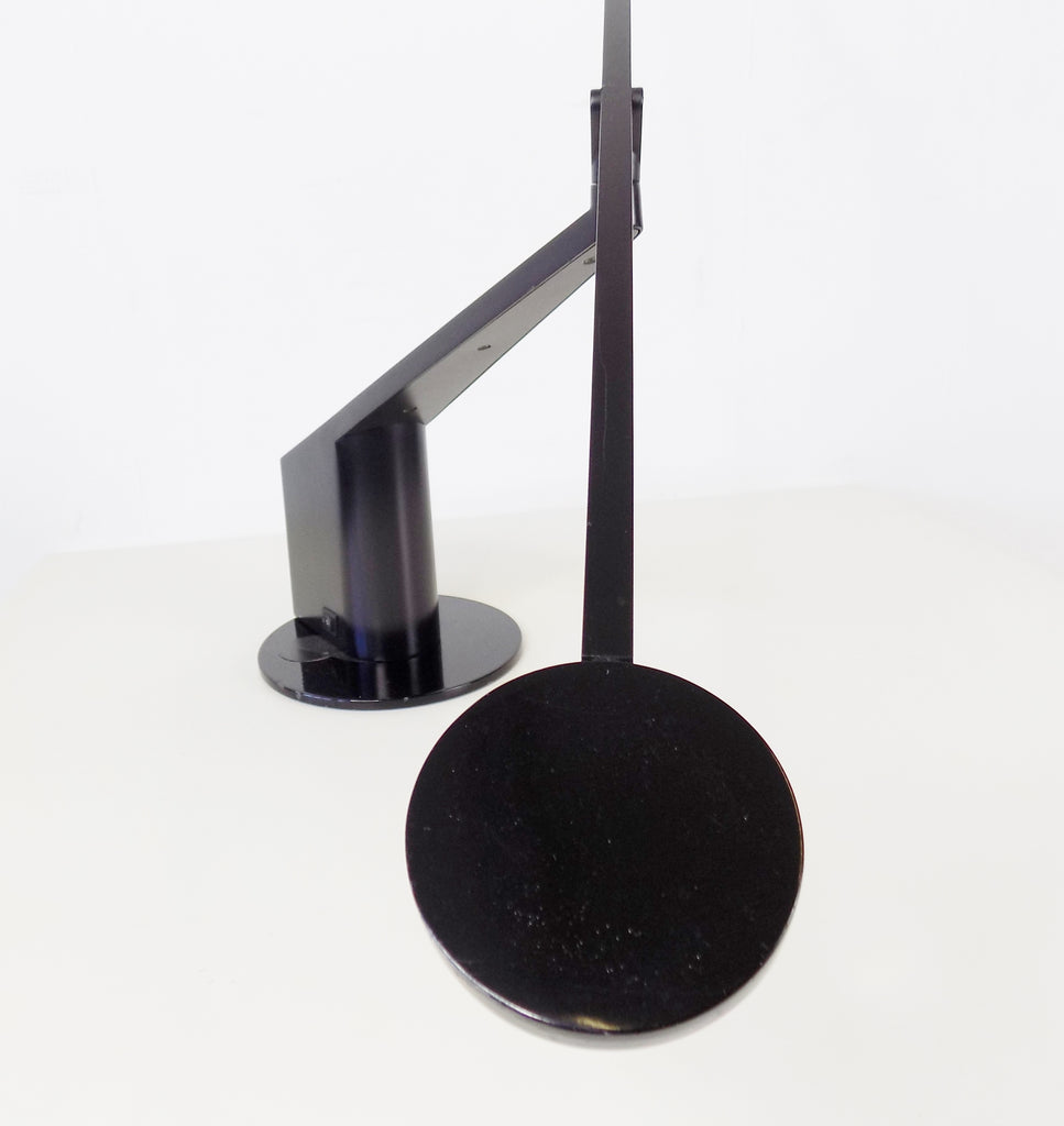 블랙코팅 알루미늄으로 제작된 알라 테이블램프는 사용감이 좋은 상태입니다. 코팅이 잘 보존되어 있으며 무게 측면에만 약간의 마모가 있습니다. 램프는 베이스와 암의 조인트에서 회전할 수 있어 엄청난 가변성을 제공합니다. 2단계의 조명 강도가 있습니다. Rodolfo Bonetto는 1959년부터 혁신적인 조명으로 유명한 이탈리아 Manufactory Guzzini를 위해 1983년에 이 램프를 디자인했습니다.