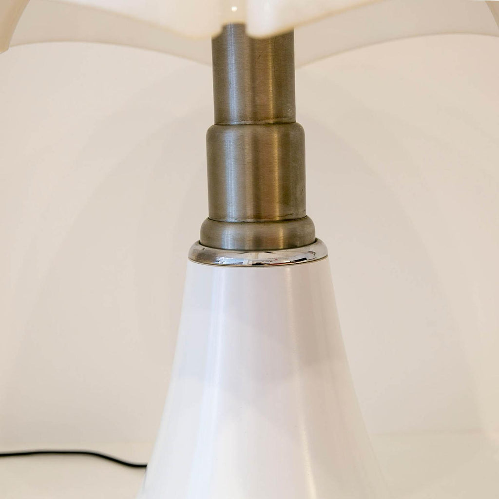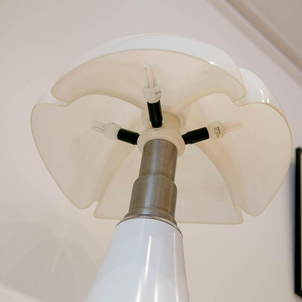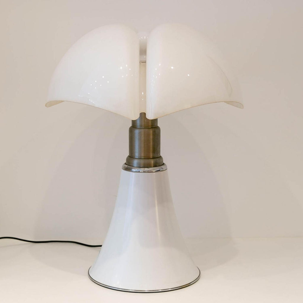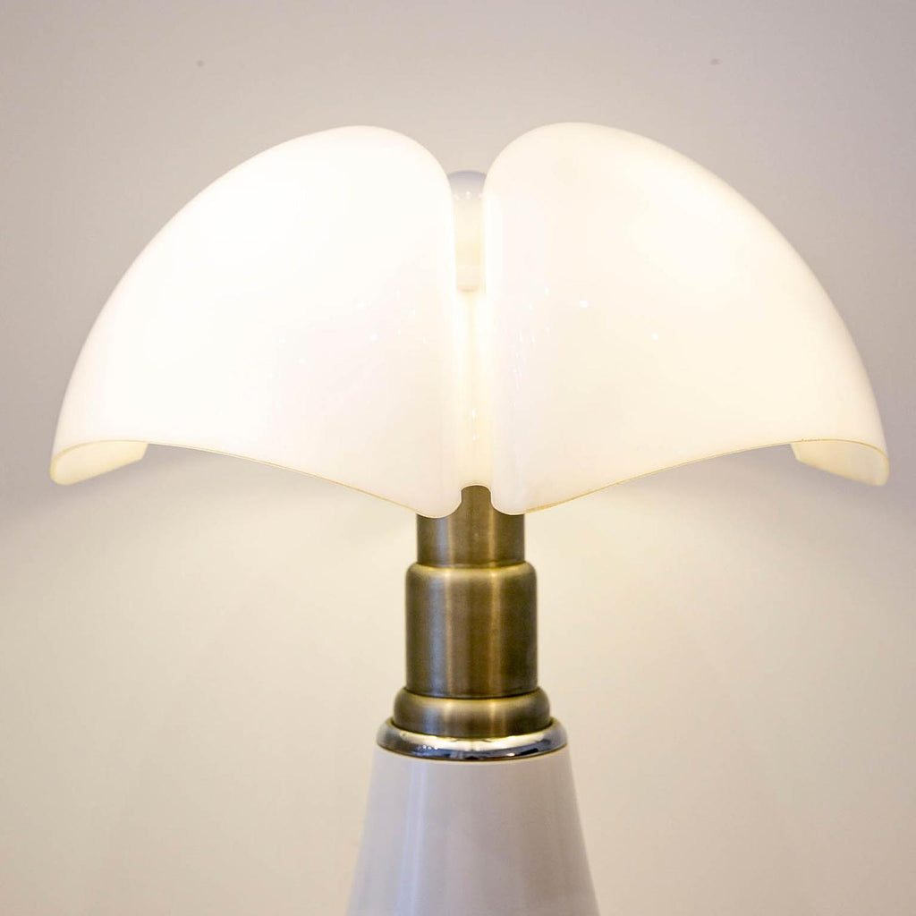 Pipistrello라는 이름은 디자이너 Gae Aulenti의 기원이기도 한 이탈리아어에서 유래했으며 박쥐의 날개를 닮은 전등갓에서 영감을 받았습니다. 램프는 높이 조절이 가능합니다( 66 -86 cm ). 최대 20cm에 달하는 텔레스코픽 넥 덕분에 실제로 늘어날 수 있습니다. 새틴 스테인리스 스틸 망원경과 화이트 오팔 메타크릴레이트 디퓨저. 이 램프의 생산은 초기에 몇 가지 장애물을 발견했습니다. 사실 당시에는 텔레스코픽 로드와 디퓨저 플랩에 적합한 금형이 없었습니다. Elio Martinelli는 많은 테스트를 거친 끝에 마침내 생산을 위한 금형과 기계를 만들 수 있었습니다.