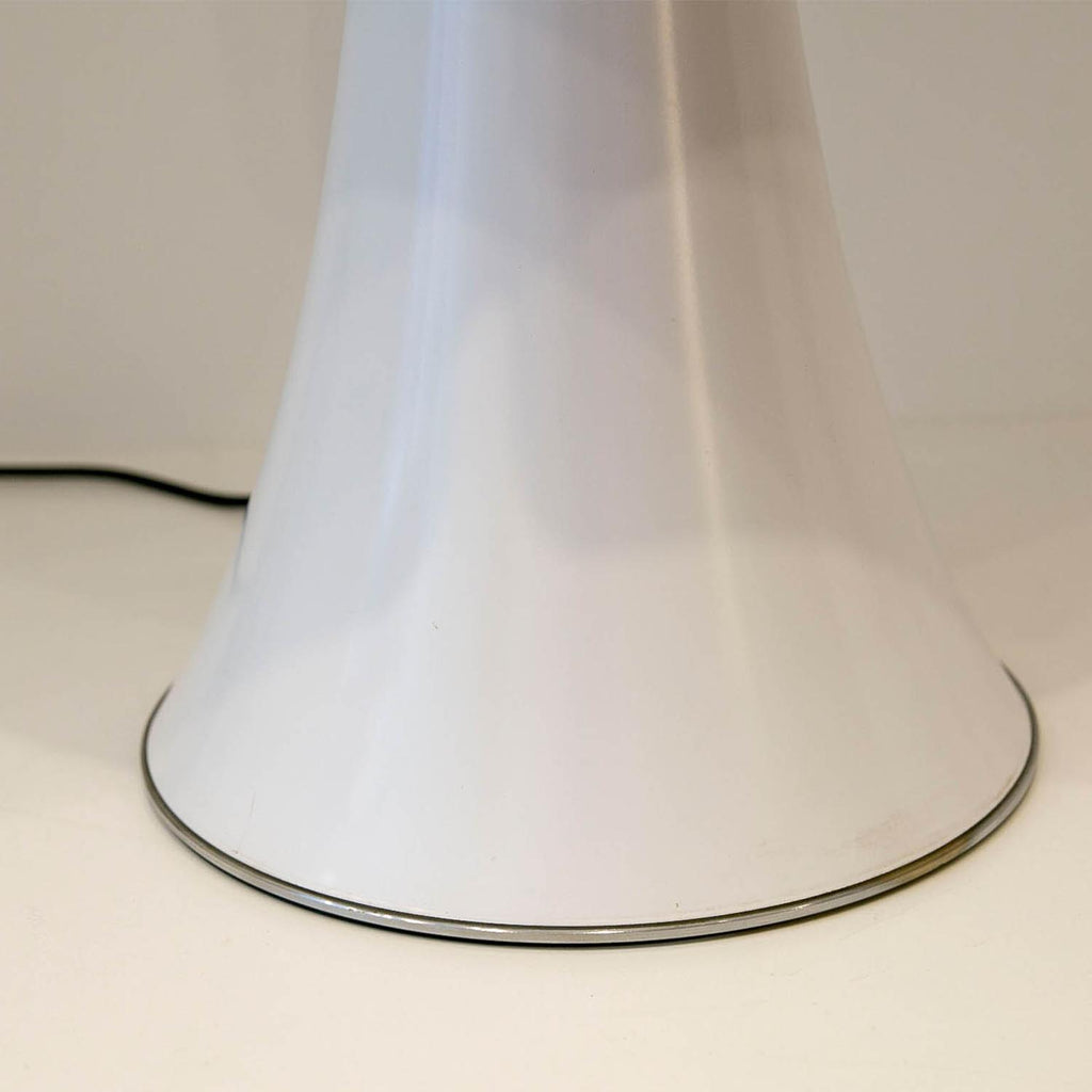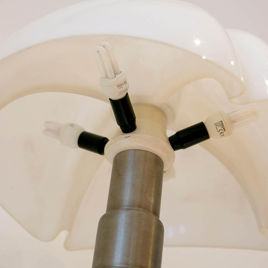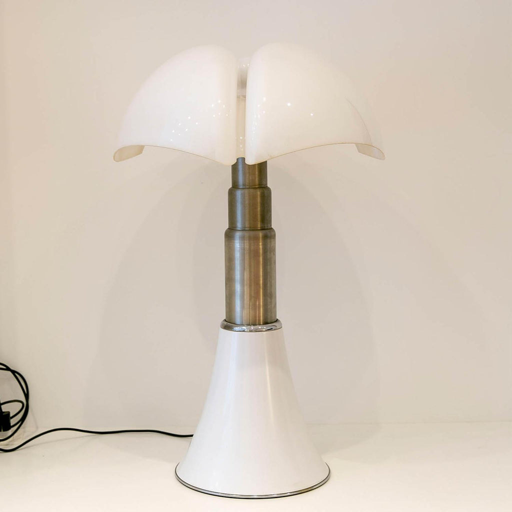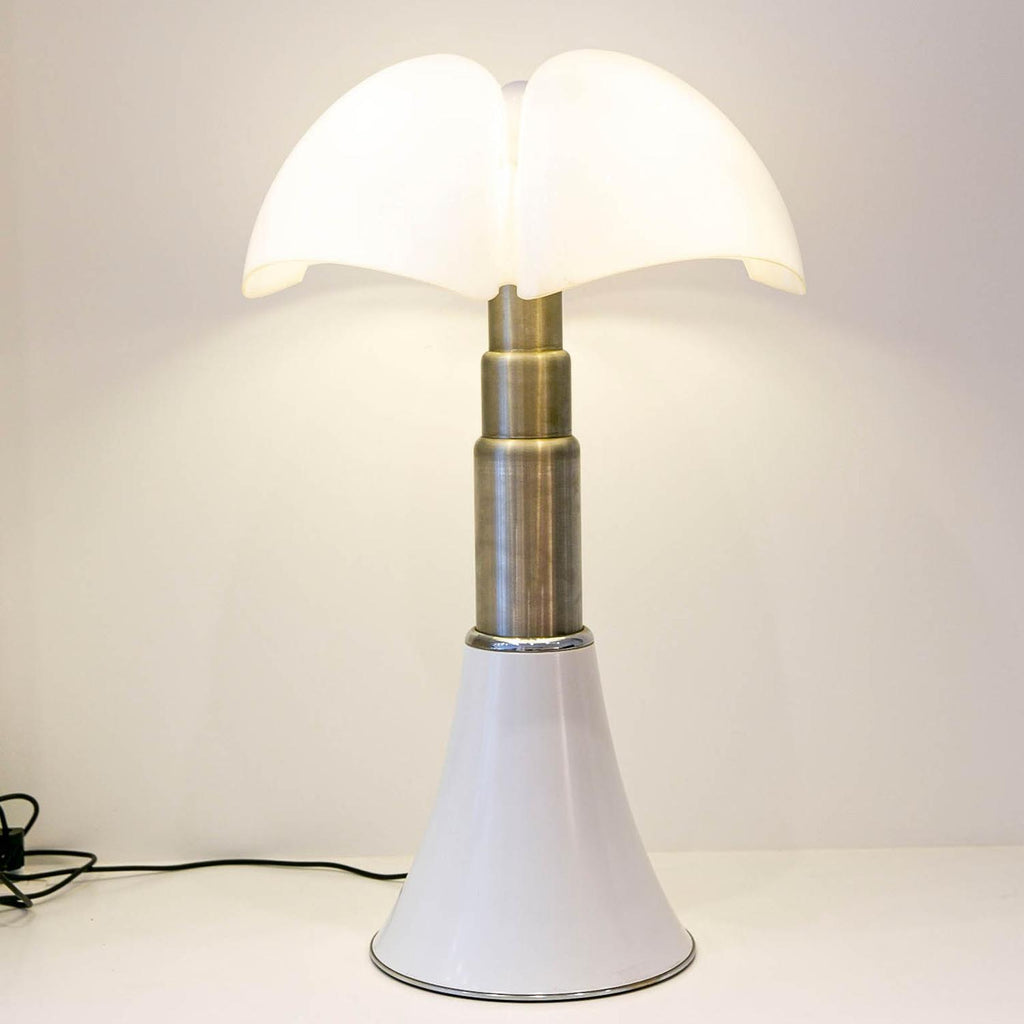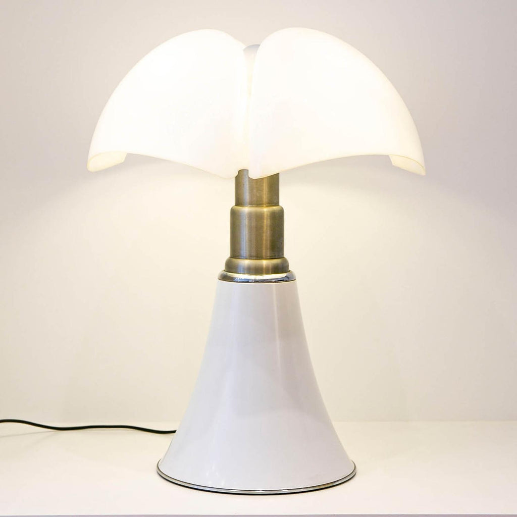 Pipistrello라는 이름은 디자이너 Gae Aulenti의 기원이기도 한 이탈리아어에서 유래했으며 박쥐의 날개를 닮은 전등갓에서 영감을 받았습니다. 램프는 높이 조절이 가능합니다( 66 -86 cm ). 최대 20cm에 달하는 텔레스코픽 넥 덕분에 실제로 늘어날 수 있습니다. 새틴 스테인리스 스틸 망원경과 화이트 오팔 메타크릴레이트 디퓨저. 이 램프의 생산은 초기에 몇 가지 장애물을 발견했습니다. 사실 당시에는 텔레스코픽 로드와 디퓨저 플랩에 적합한 금형이 없었습니다. Elio Martinelli는 많은 테스트를 거친 끝에 마침내 생산을 위한 금형과 기계를 만들 수 있었습니다.