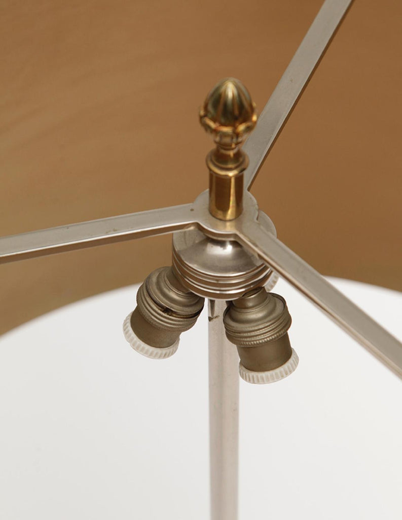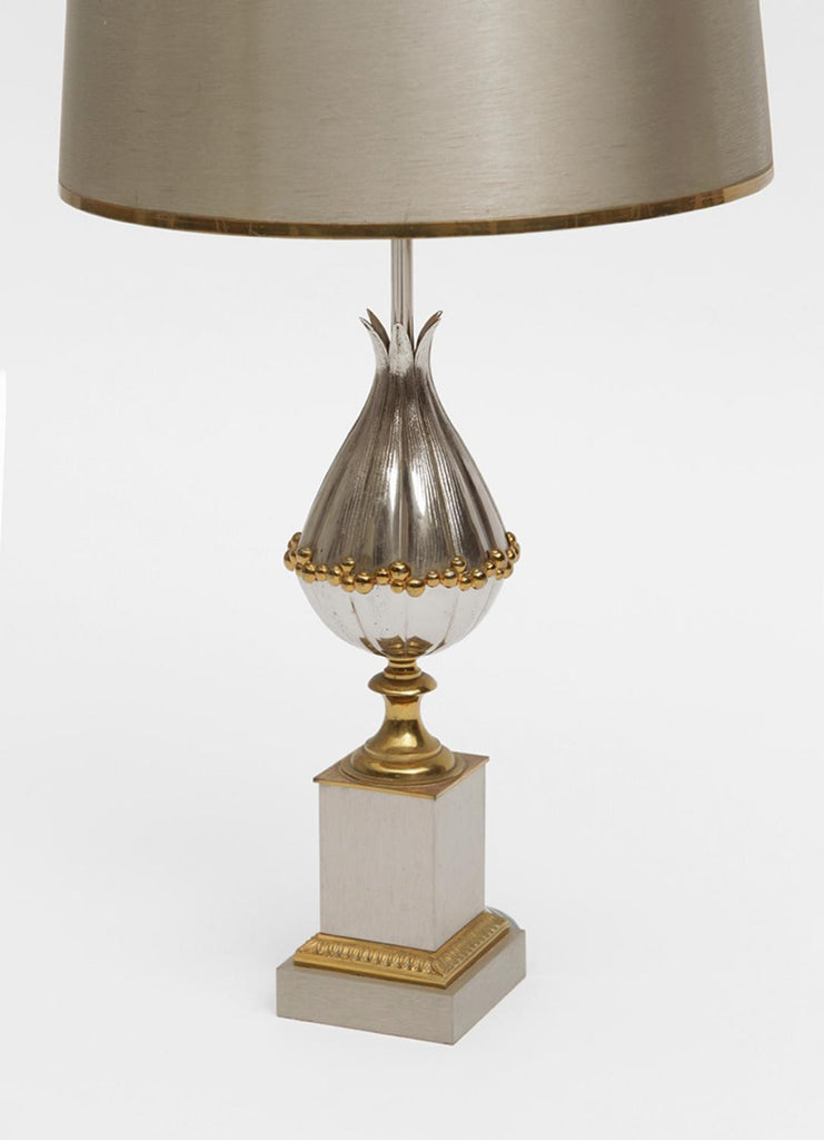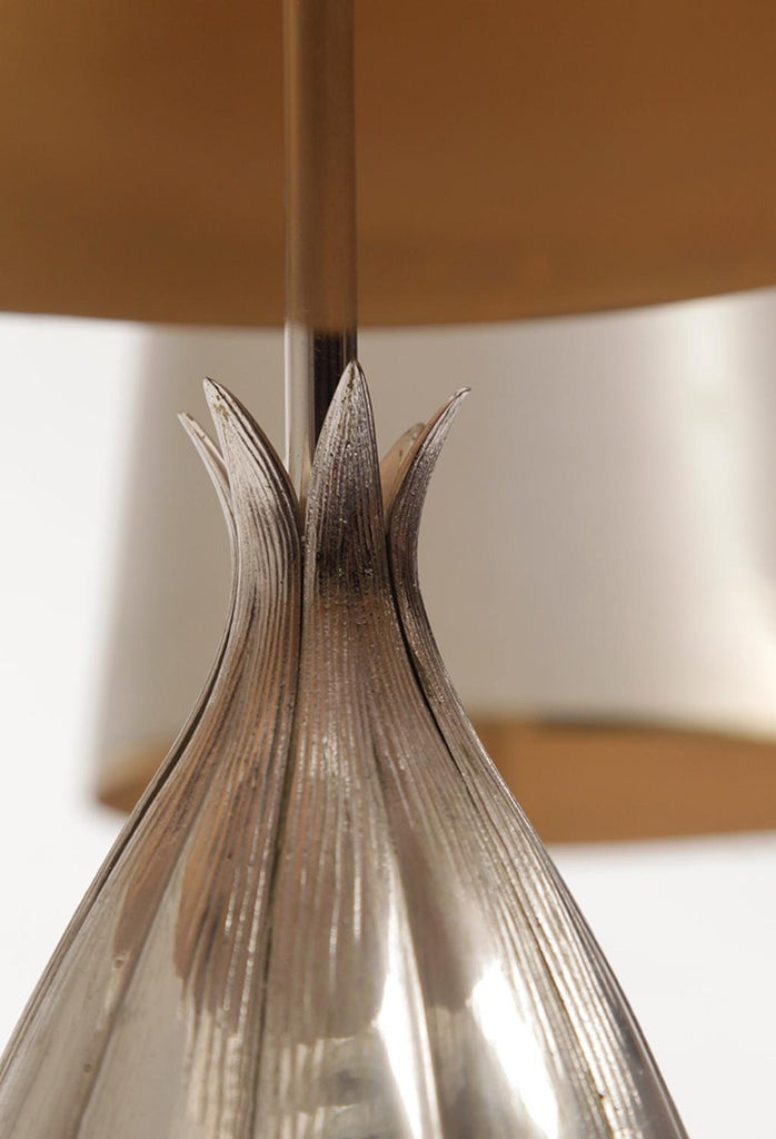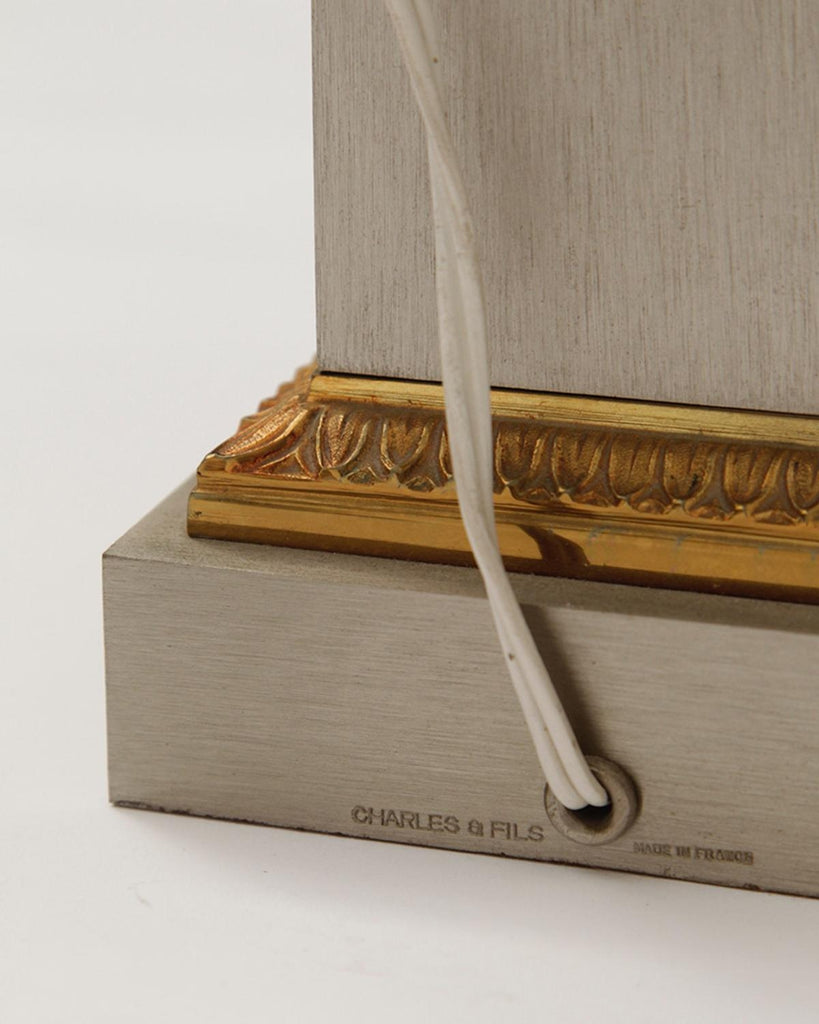 현대 신고전주의 양식을 수용하는 Maison Charles의 우아한 프랑스 Mid-Century Patinated 청동 테이블 램프. 이 쌍은 2차 세계 대전 직후 Charles가 주목한 최고 품질의 디자인과 수공예품으로 구성됩니다. 청동 주각은 곧 열리려는 청동 연꽃 봉오리(전쟁 후 새로운 삶의 시작을 상징함)를 지지하고 작품은 단단한 청동 색조로 완성됩니다.
