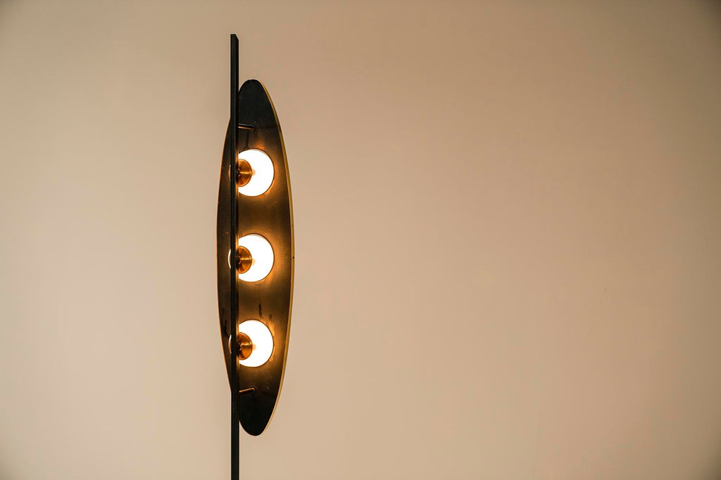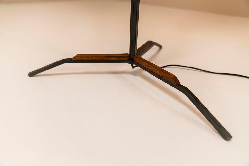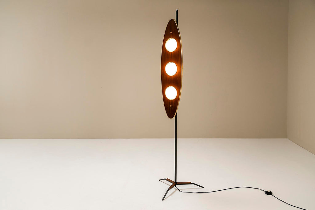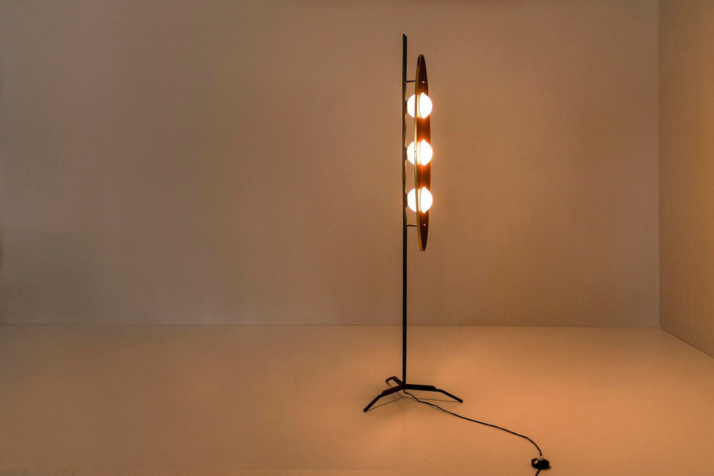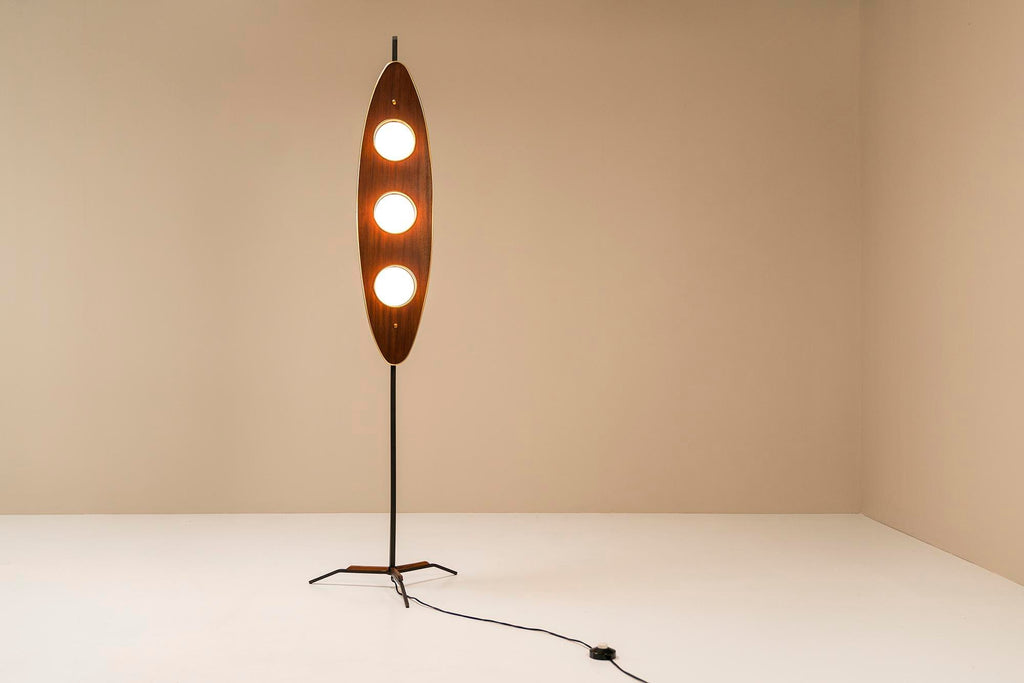 1970년대의 매우 세련되고 눈길을 끄는 플로어 램프는 이탈리아 디자이너 Goffredo Reggiani의 스타일을 연상시킵니다. 3개의 다리는 베이스가 바닥에서 몇 센티미터 들어올려지도록 합니다. 심미적으로도 좋지만 그 아래로 전선이 매끄럽게 연결되어 있어 매우 실용적입니다. 섬세한 티크 슬랫 형태의 장식 요소가 각 다리에 적용되었습니다. 시선을 위쪽으로 움직이면 황동 트림으로 둘러싸인 아름다운 나무 패널에 도달합니다. 우리는 이 형태를 보트 또는 서핑보드 모양으로 가장 잘 설명할 수 있습니다. 두 개의 황동 커버 캡이 패널이 장착된 곳에 가지런히 놓여 있습니다. 전구가 그대로 튀어 나온 세 개의 구멍도 황동 트림으로 마감되었습니다. 광원은 로드에 부착되며 황동 고정물도 있습니다. 구체는 젖빛 유리로 만들어졌으며 너무 크지 않아 쾌적한 비율이 그대로 유지됩니다. 주목할 만한 관찰은 램프를 측면에서 볼 때 전면의 방으로 여과되지 않고 빛나 후면에서 일종의 빛을 발산하는 빛의 진정한 역동성을 볼 수 있다는 것입니다. 앞, 뒤, 밝음, 어두움. 장난스러운 대조가 모두 이 아름다운 램프에 모입니다. 상태는 매우 양호하며 세월에 비해 사용감이 적습니다.