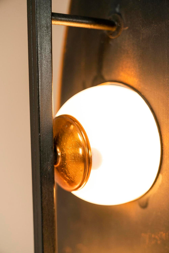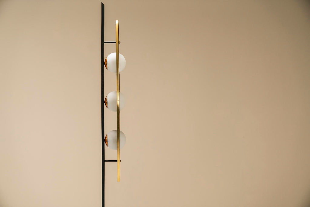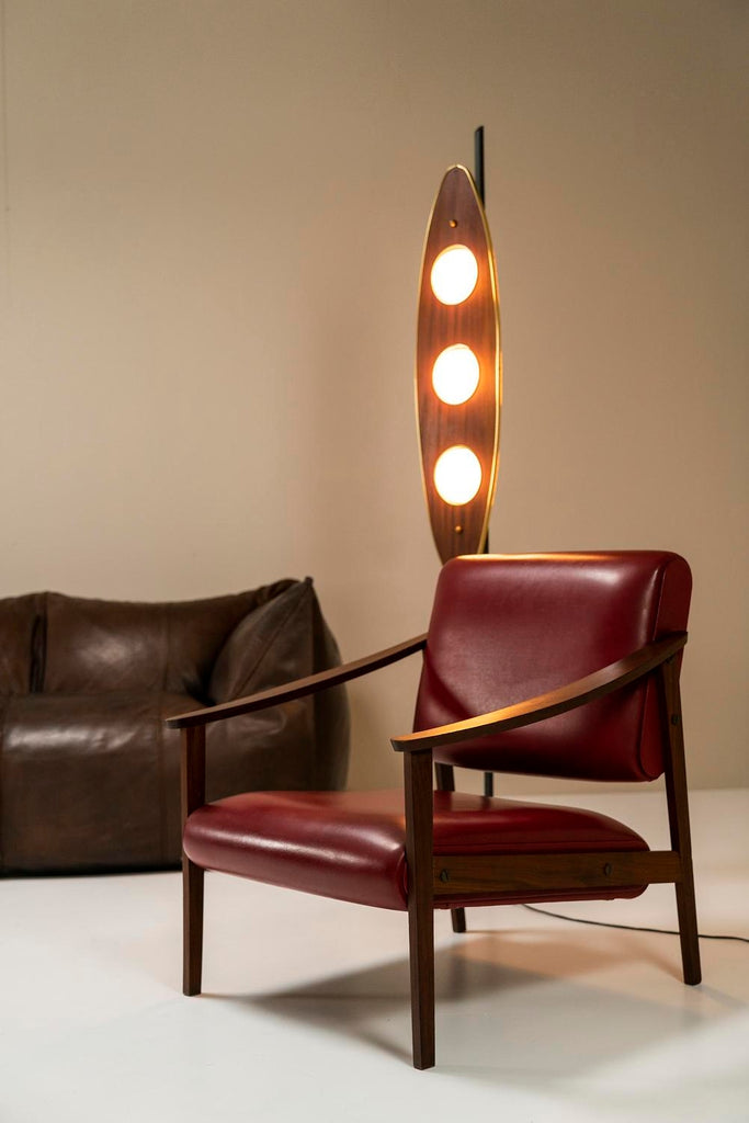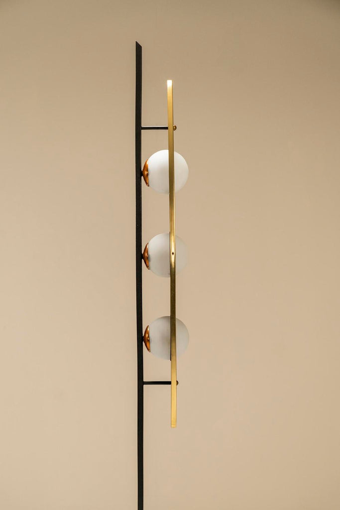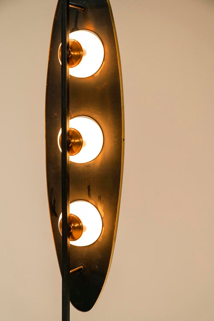 1970년대의 매우 세련되고 눈길을 끄는 플로어 램프는 이탈리아 디자이너 Goffredo Reggiani의 스타일을 연상시킵니다. 3개의 다리는 베이스가 바닥에서 몇 센티미터 들어올려지도록 합니다. 심미적으로도 좋지만 그 아래로 전선이 매끄럽게 연결되어 있어 매우 실용적입니다. 섬세한 티크 슬랫 형태의 장식 요소가 각 다리에 적용되었습니다. 시선을 위쪽으로 움직이면 황동 트림으로 둘러싸인 아름다운 나무 패널에 도달합니다. 우리는 이 형태를 보트 또는 서핑보드 모양으로 가장 잘 설명할 수 있습니다. 두 개의 황동 커버 캡이 패널이 장착된 곳에 가지런히 놓여 있습니다. 전구가 그대로 튀어 나온 세 개의 구멍도 황동 트림으로 마감되었습니다. 광원은 로드에 부착되며 황동 고정물도 있습니다. 구체는 젖빛 유리로 만들어졌으며 너무 크지 않아 쾌적한 비율이 그대로 유지됩니다. 주목할 만한 관찰은 램프를 측면에서 볼 때 전면의 방으로 여과되지 않고 빛나 후면에서 일종의 빛을 발산하는 빛의 진정한 역동성을 볼 수 있다는 것입니다. 앞, 뒤, 밝음, 어두움. 장난스러운 대조가 모두 이 아름다운 램프에 모입니다. 상태는 매우 양호하며 세월에 비해 사용감이 적습니다.