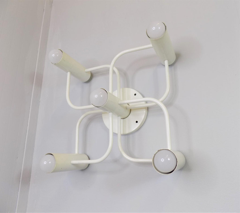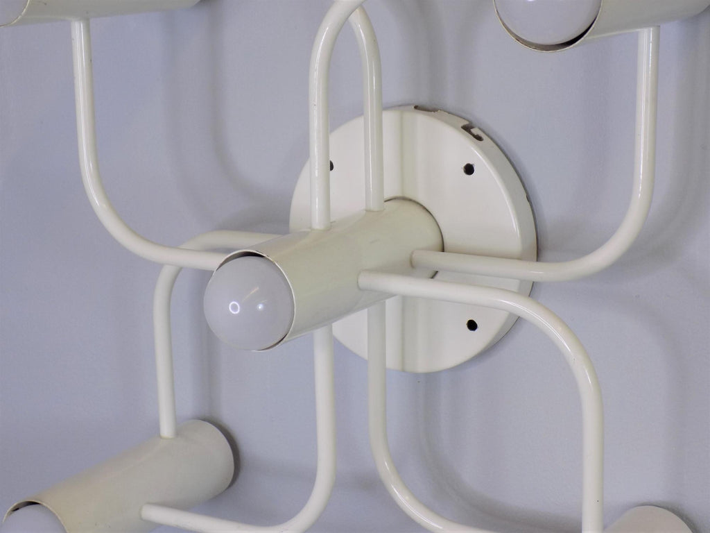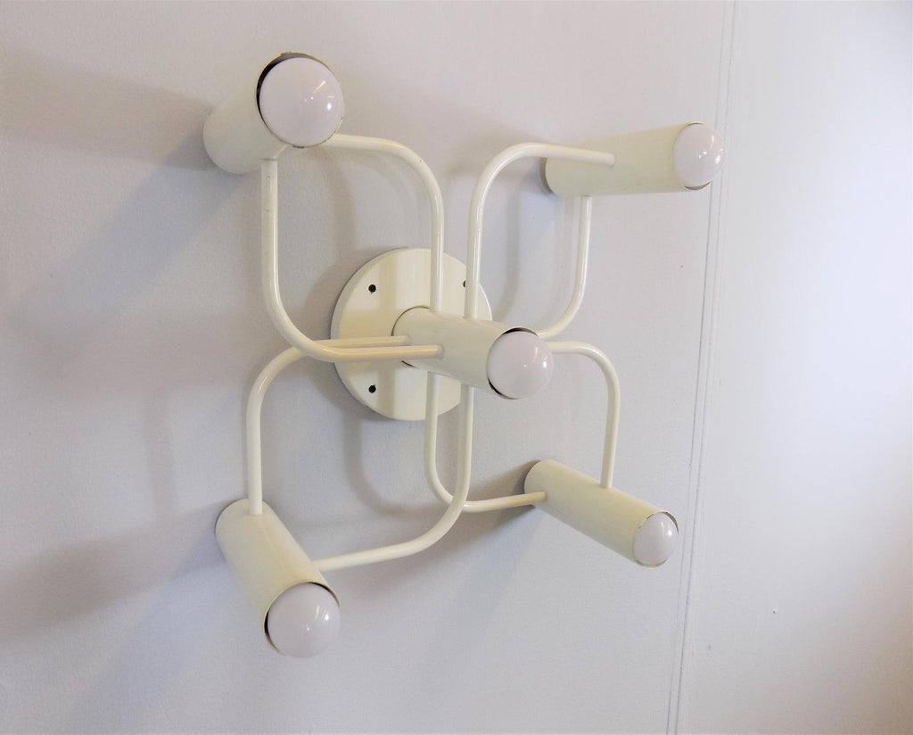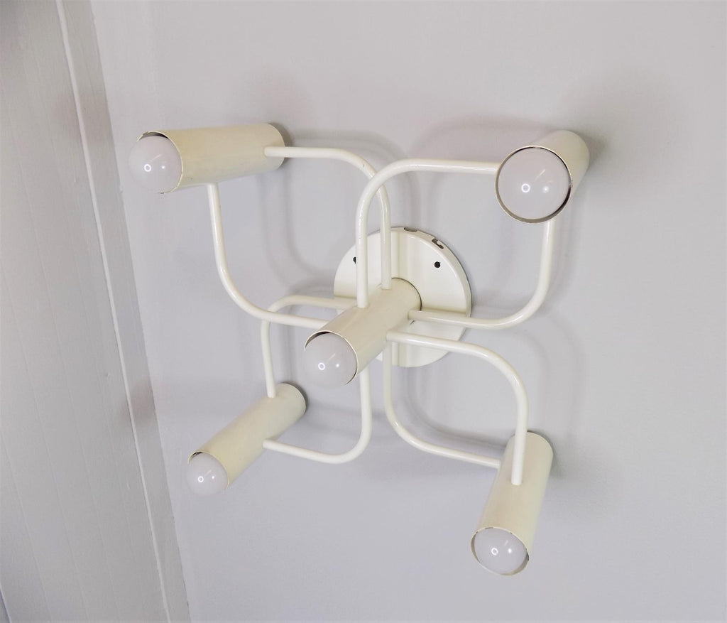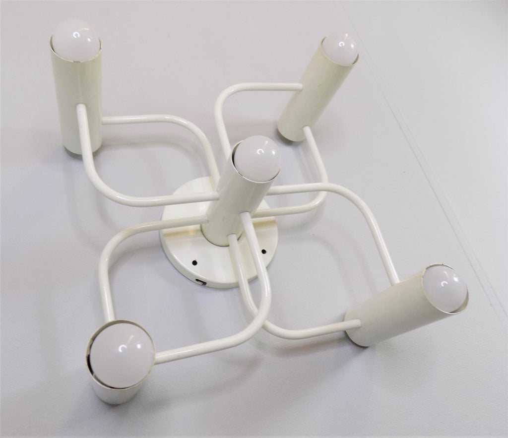 우주 시대 디자인의 이 5방향 Leola 천장 램프는 상태가 양호합니다. 램프는 흰색 마감으로 제공되며 최소한의 마모 흔적이 보입니다. 이 기술은 완벽하게 작동합니다. 1970년대에 독일 램프 제조업체인 Leola는 유명한 국제 디자이너와 협력하여 시대를 초월한 조명 제품을 제작했습니다. 이 모델은 70년대에 Gaetano Sciolari가 Leola를 위해 디자인했습니다.