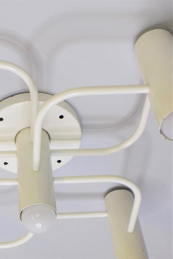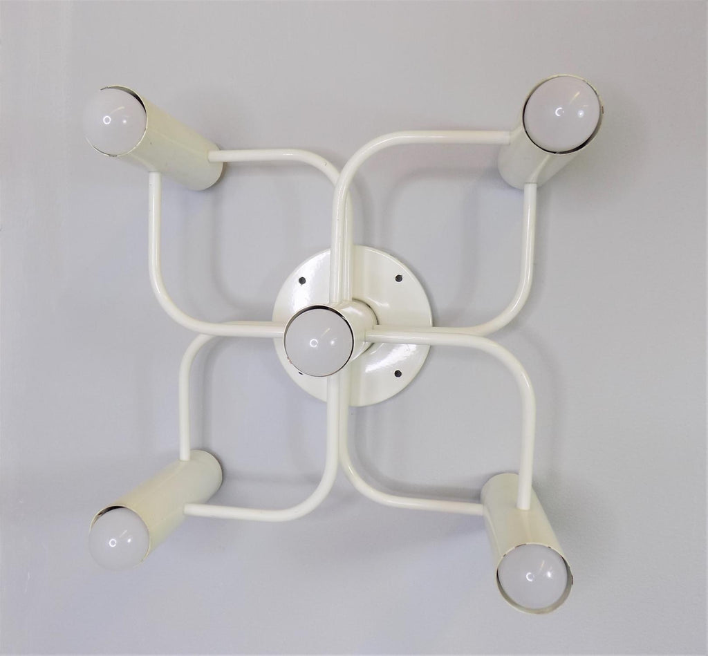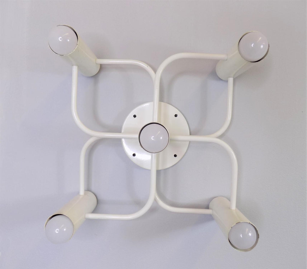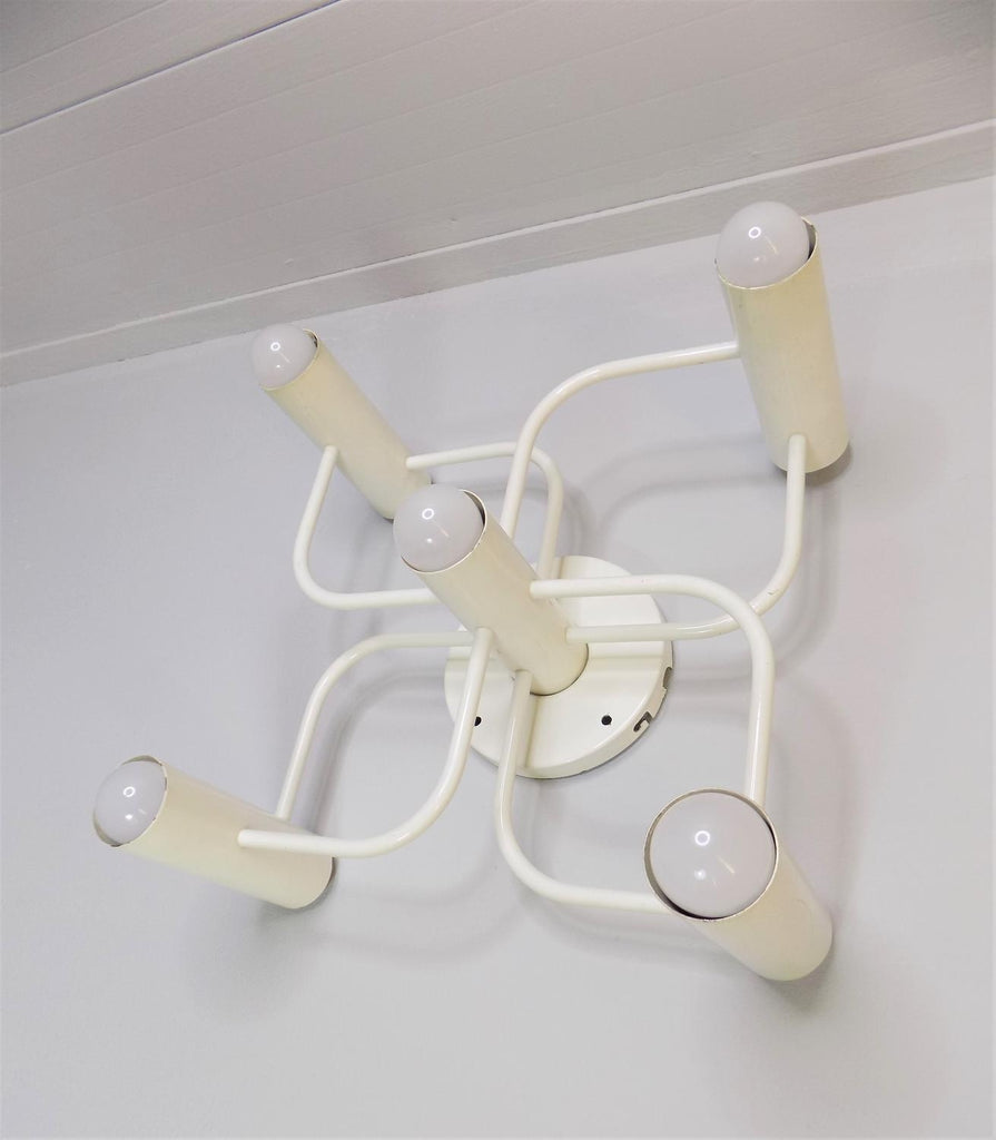 우주 시대 디자인의 이 5방향 Leola 천장 램프는 상태가 양호합니다. 램프는 흰색 마감으로 제공되며 최소한의 마모 흔적이 보입니다. 이 기술은 완벽하게 작동합니다. 1970년대에 독일 램프 제조업체인 Leola는 유명한 국제 디자이너와 협력하여 시대를 초월한 조명 제품을 제작했습니다. 이 모델은 70년대에 Gaetano Sciolari가 Leola를 위해 디자인했습니다.