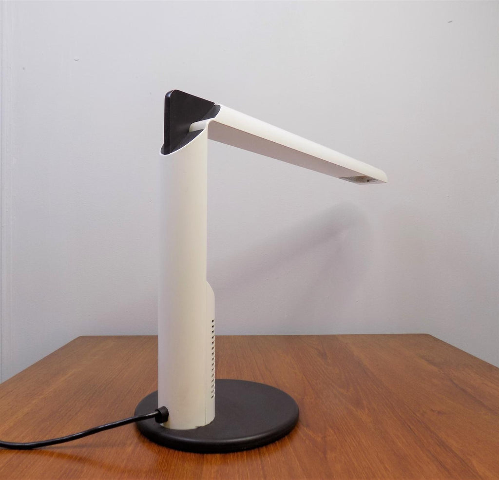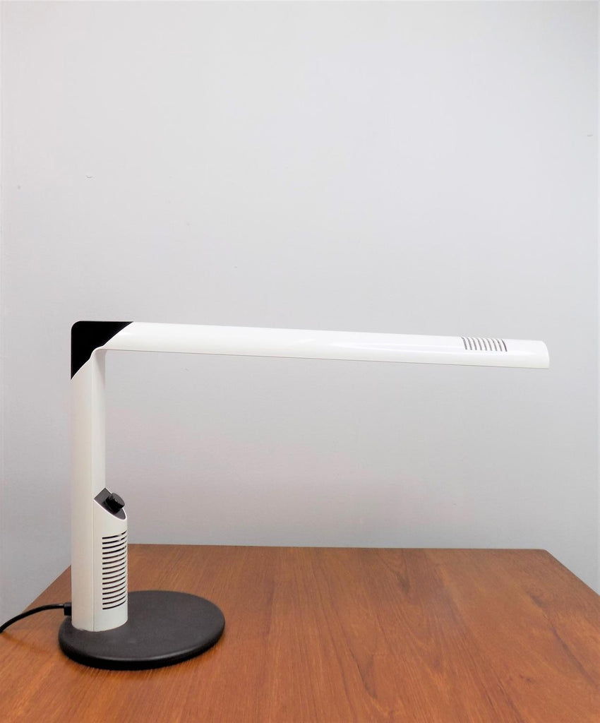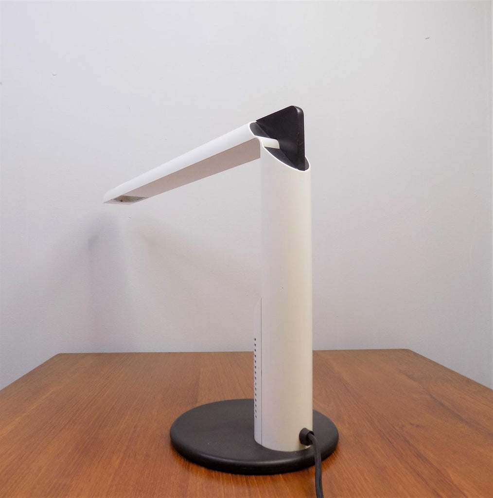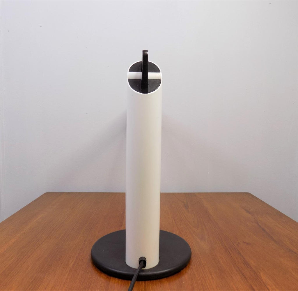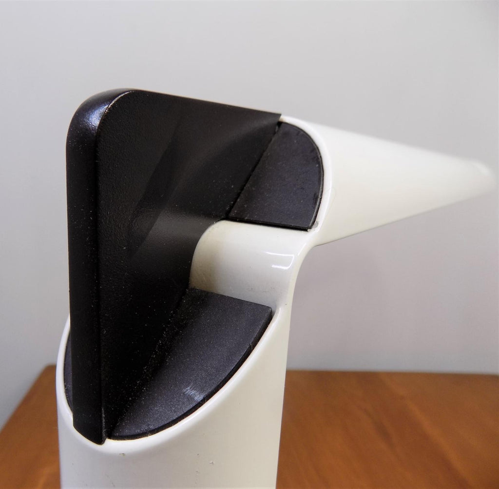 이 Luci Abele 탁상 램프는 흰색 플라스틱에 검은색을 칠한 상태로 제조되었으며 상태가 매우 양호합니다. 플라스틱 케이스는 블랙 메탈 베이스와 마찬가지로 최소한의 마모 흔적을 보여줍니다. 시대를 초월한 모던한 라인의 테이블 램프는 밝기를 무한대로 조절할 수 있습니다. 전기는 완벽하게 작동합니다. 이 램프는 70년대 이탈리아 제조업체인 Luci Abele을 위해 Gianfranco Frattini가 디자인했습니다.