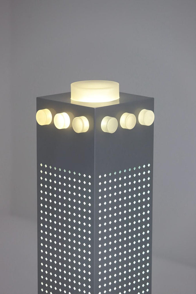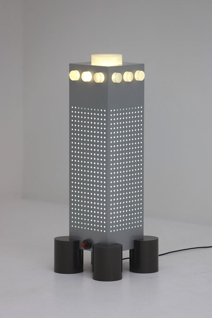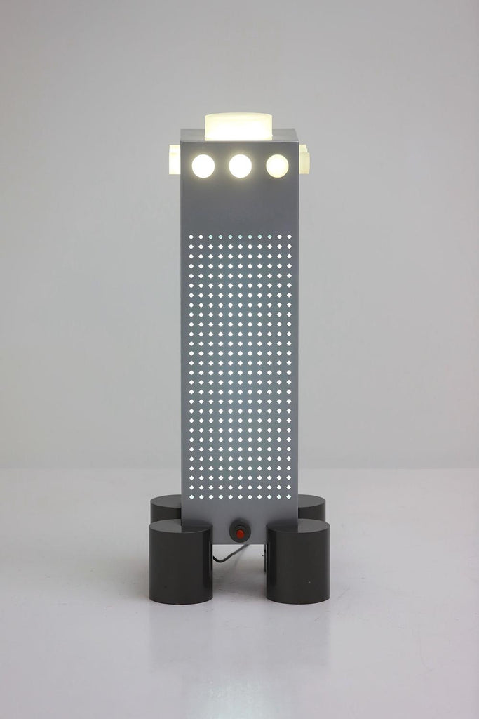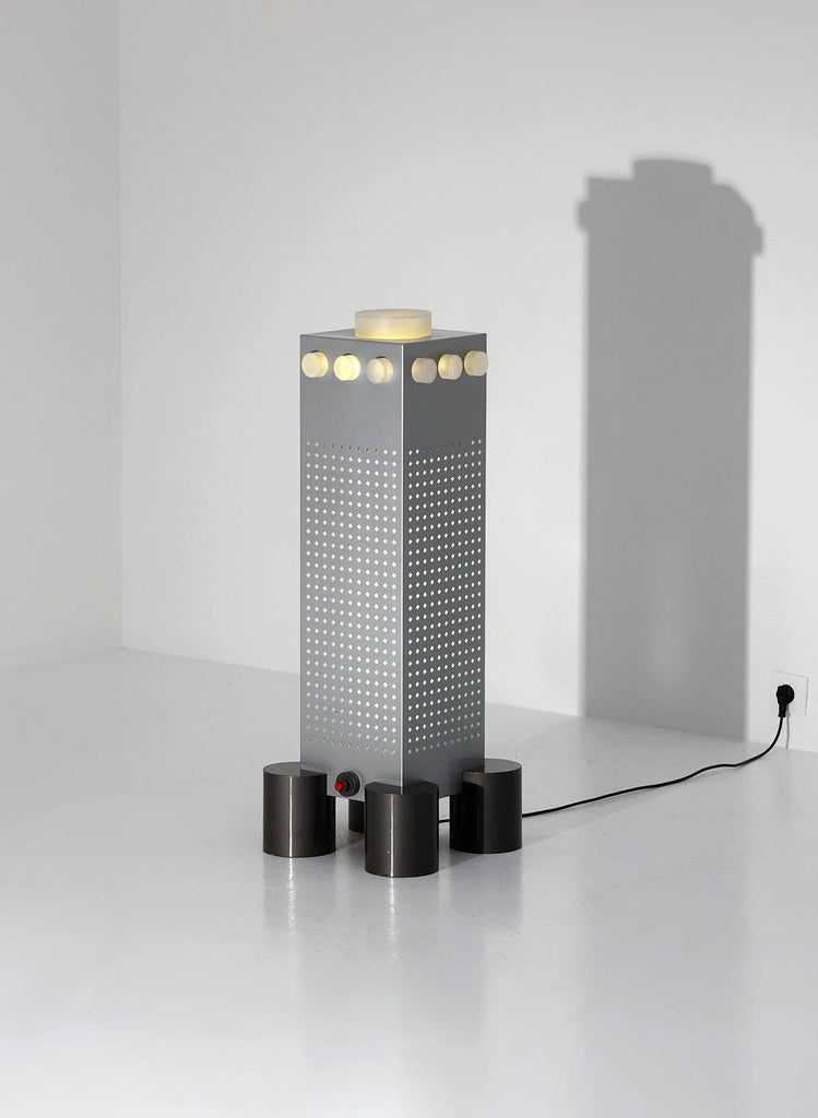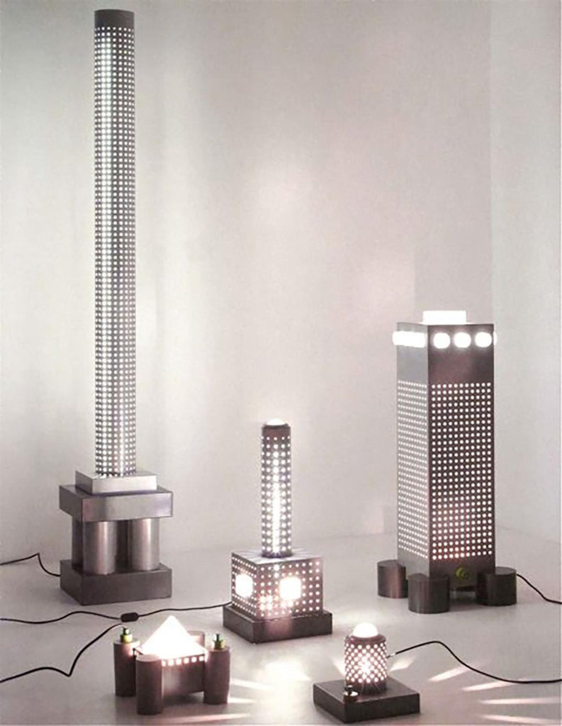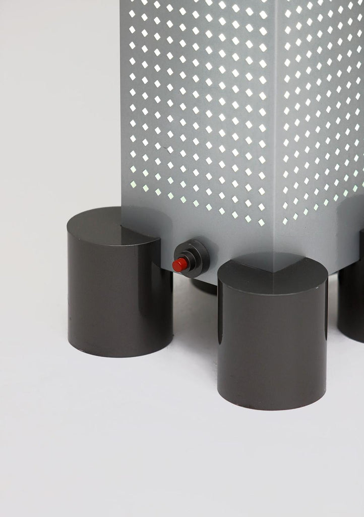 건물을 형상화한 이 램프는 1986년 비엔나 미술 박물관에서 공개되었습니다.부분적으로 천공된 회색 페인트 강철로 만들어졌으며 램프가 켜지면 도시/스카이라인 느낌의 느낌을 줍니다.