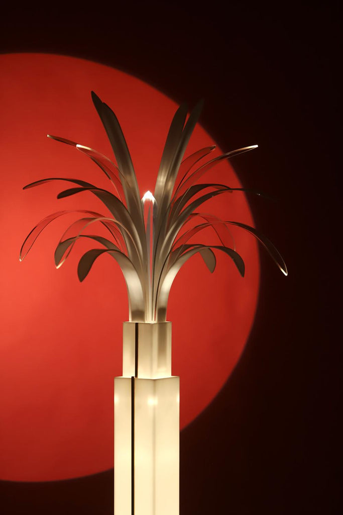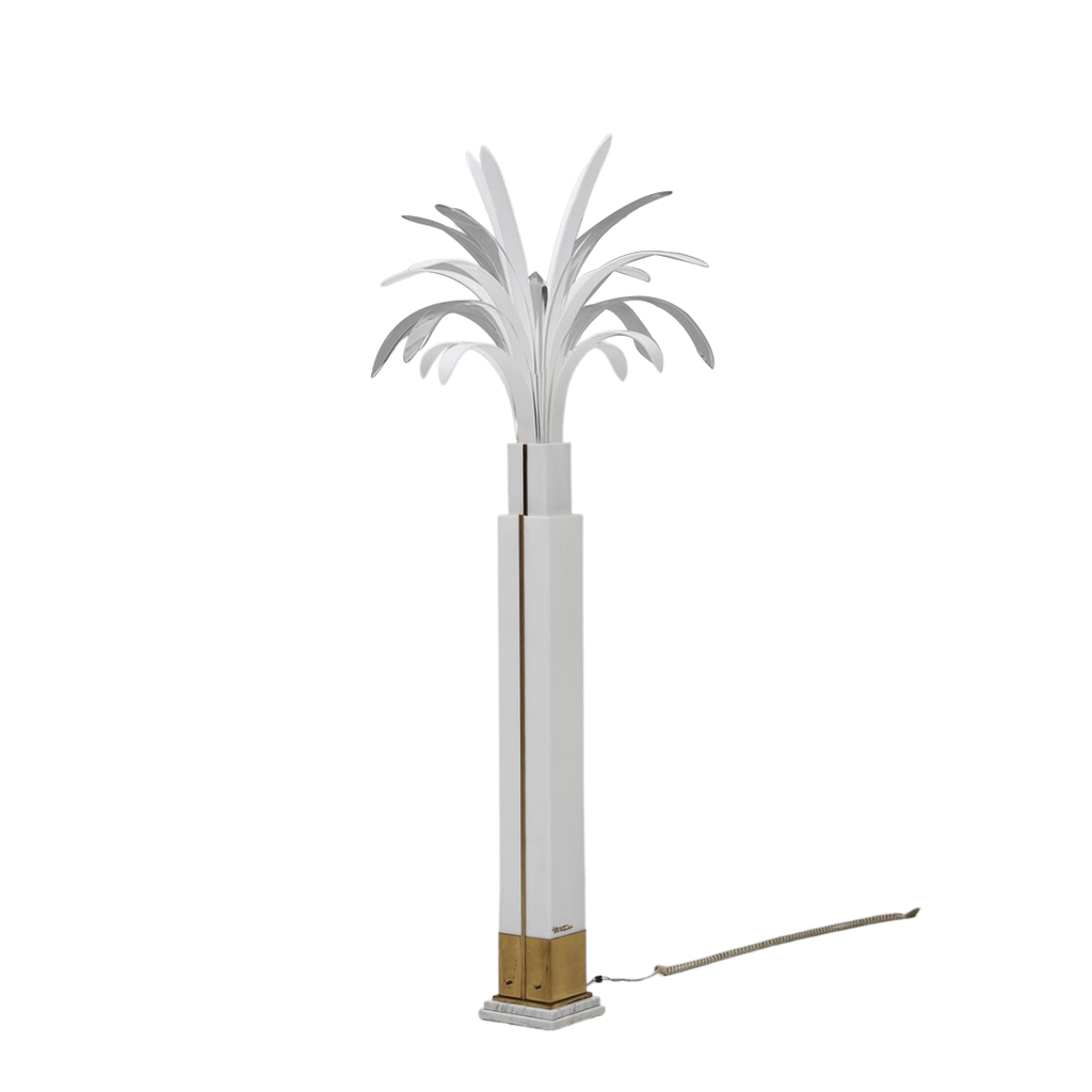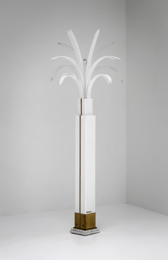 벨기에 디자이너 Theo Verhulst가 제작한 희귀한 방풍 야자수 램프, 1982년. 이 멋진 램프는 흰색과 투명한 방풍으로 완전히 만들어졌으며, 황동으로 장식되어 있으며 대리석 바닥에 놓여 있습니다. 램프를 켜면 잎사귀 끝을 통해 빛이 비춥니다. 베이스는 반투명하고 따뜻하고 부드러운 빛을 제공합니다. 램프는 상태가 매우 좋으며 생산된 지 얼마 되지 않았습니다.