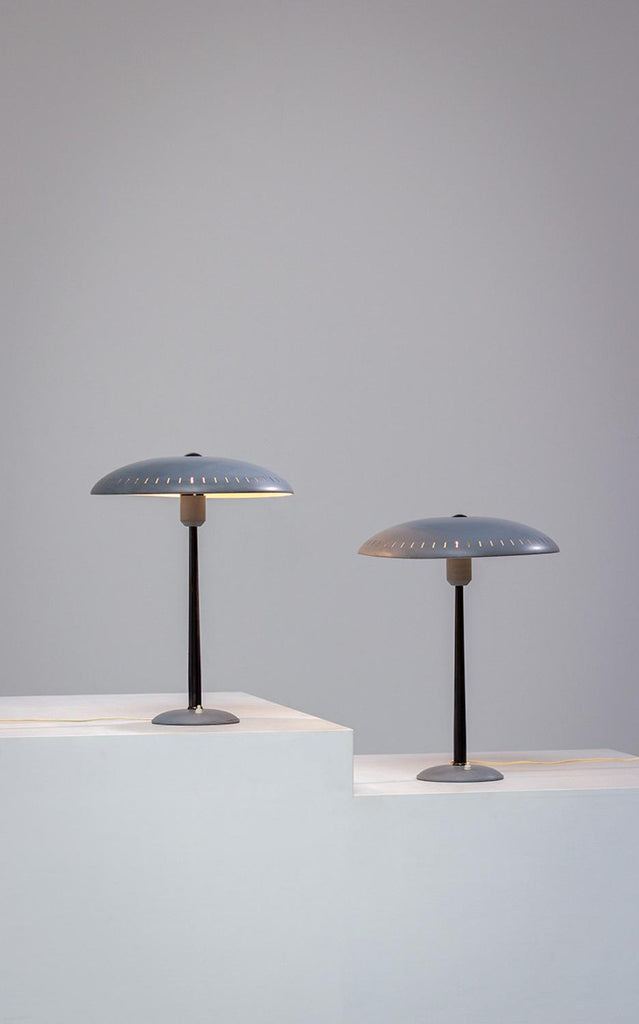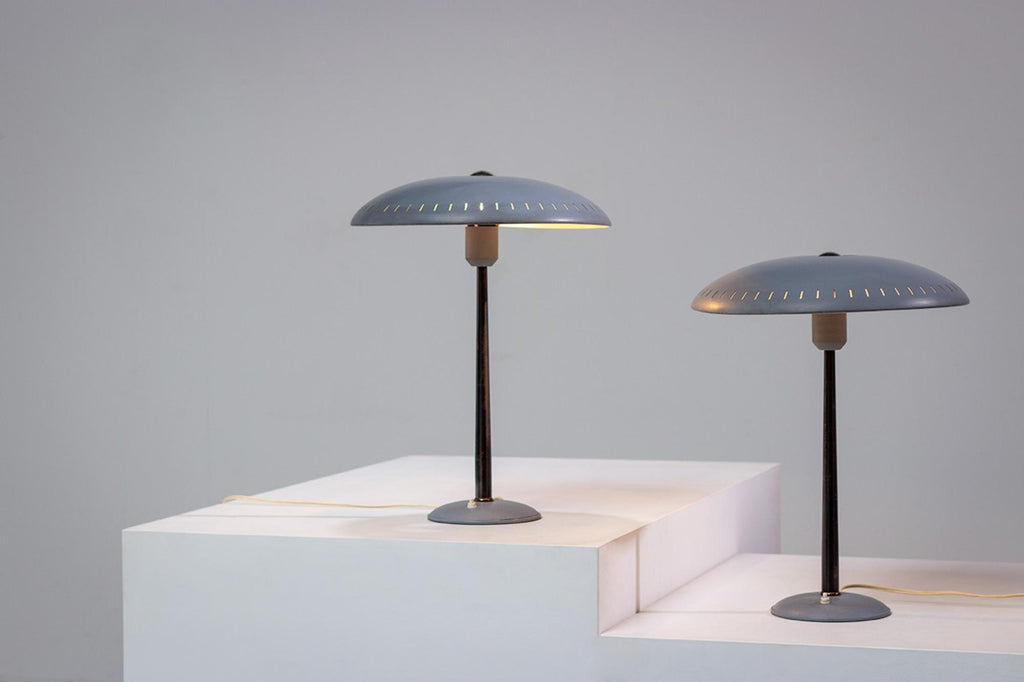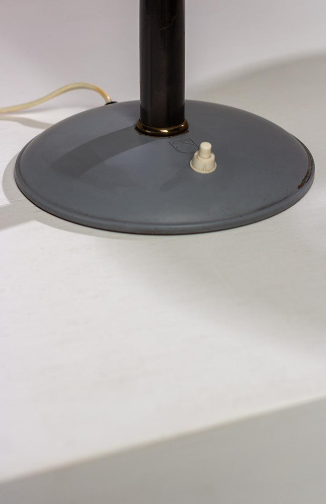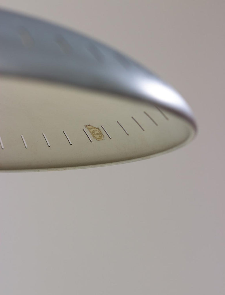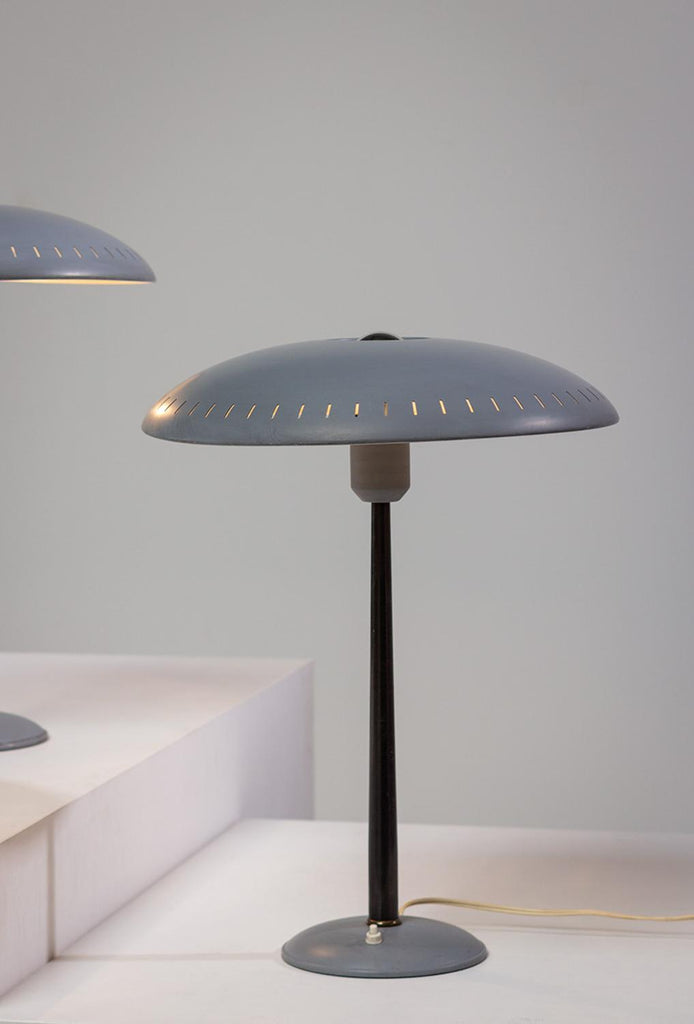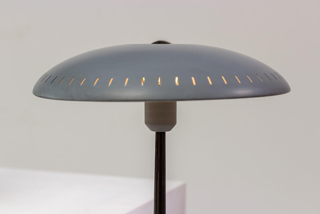 회색 바탕에 회색 금속 음영과 기둥. 1950년대 UFO 열풍에서 영감을 받은 책상 램프. 디자이너: Louis Kalff 제작자: Philips