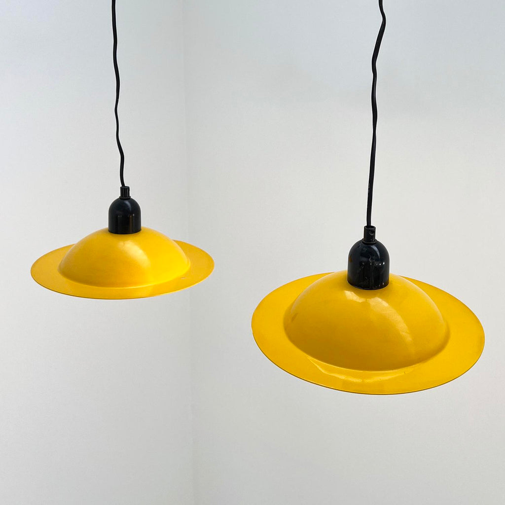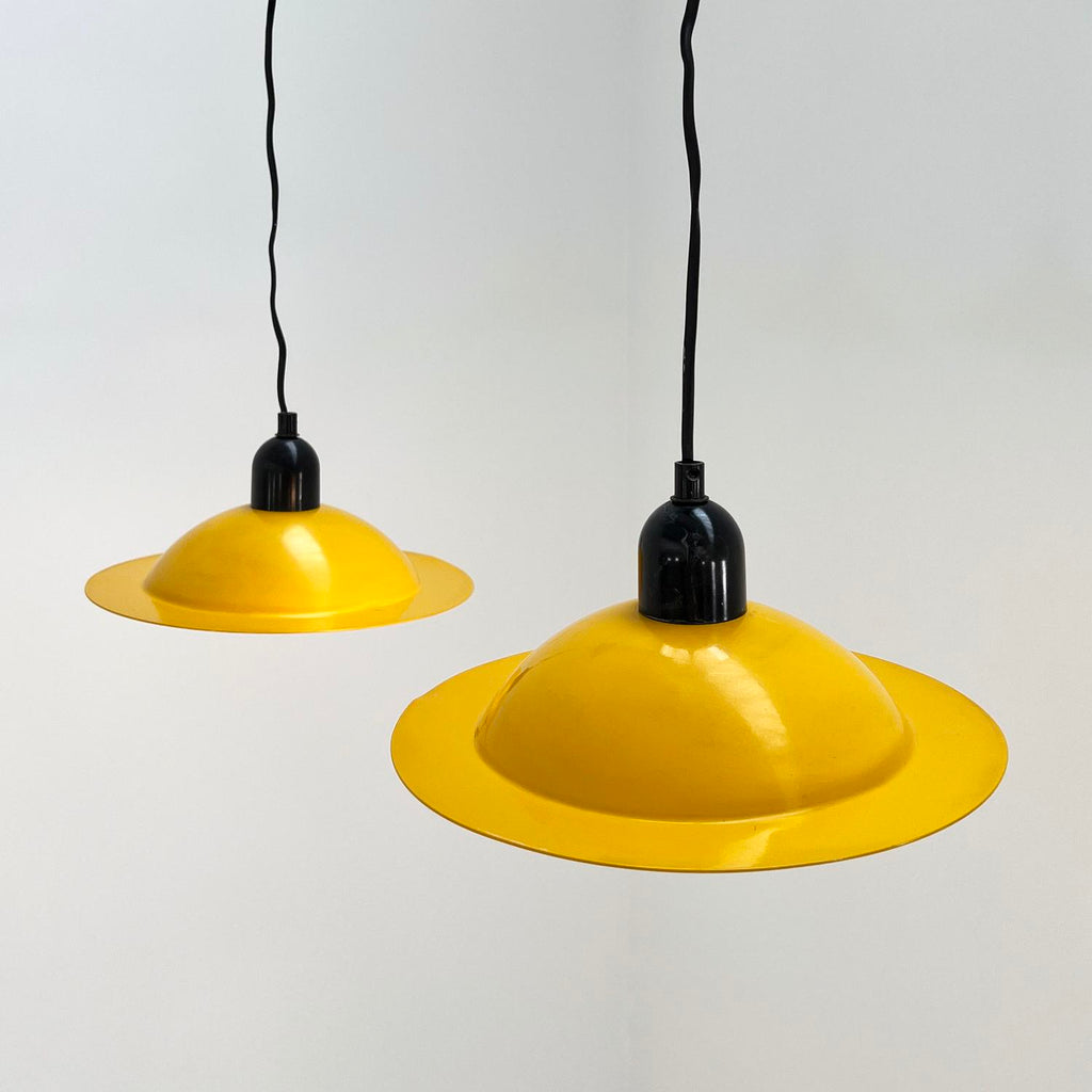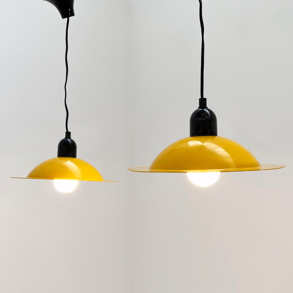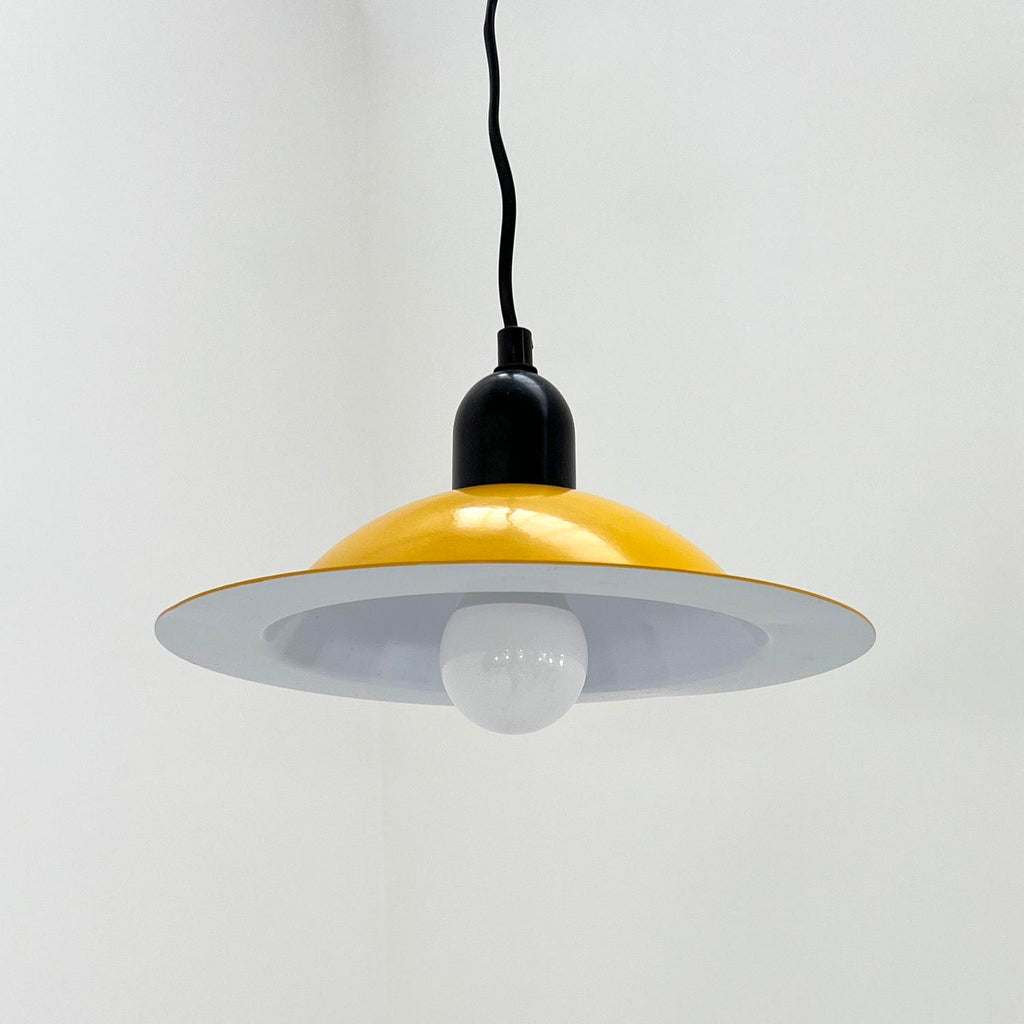 디자이너 - Jonathan De Pas, Donato D'Urbino & Paolo Lomazzi 프로듀서 - Stilnovo 모델 - Lampiatta 펜던트 조명 디자인 기간 - 70년대 측정 - 폭 29cm x 깊이 29cm x 높이 15cm(와이어 길이 150cm) 재료 - 금속 색상 - 노란색 , 화이트, 블랙 라이트 웨어는 나이와 사용감이 일치합니다.