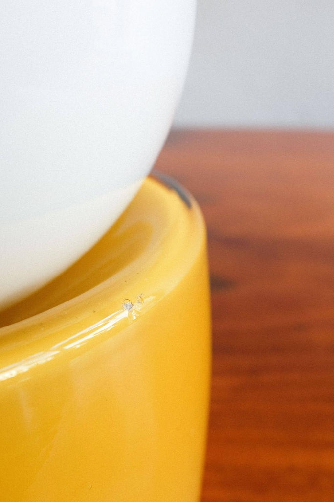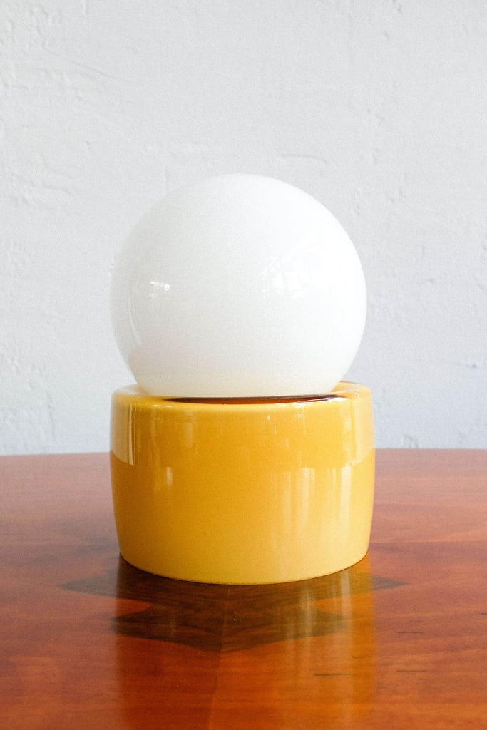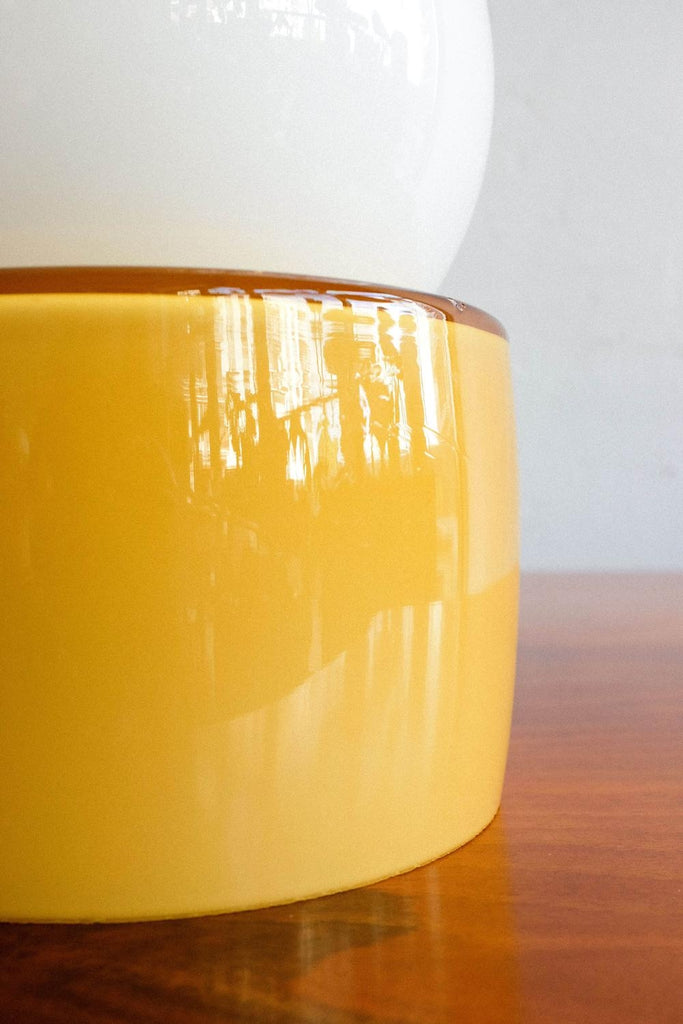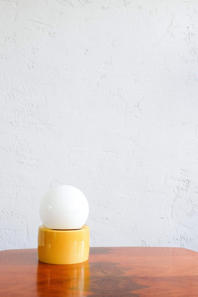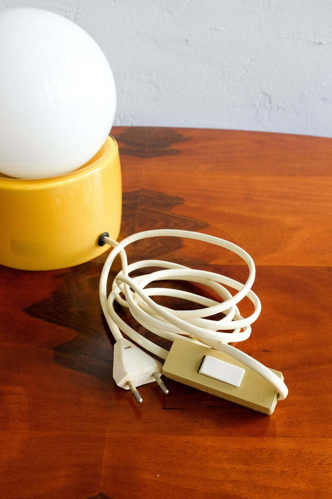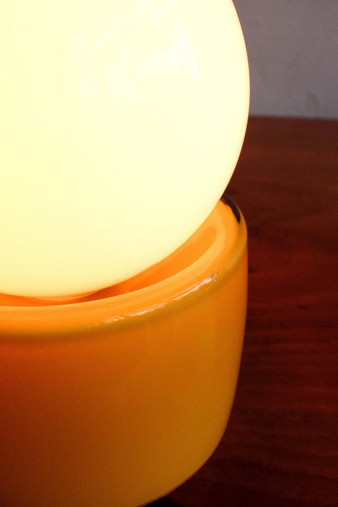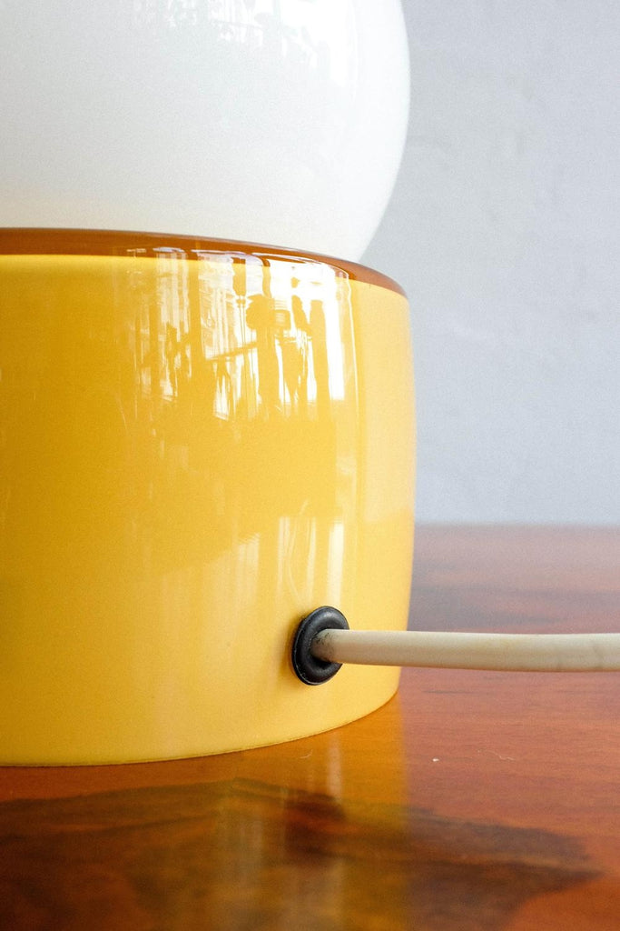 Osvětlovací Sklo가 70년대에 체코슬로바키아에서 만든 빈티지 소형 컬러 유리 테이블 램프. 진한 노란색 유리 베이스에 우유 유리 글로브의 조합. 완전히 복원되고 다시 배선되었으며 최상의 상태를 유지합니다.