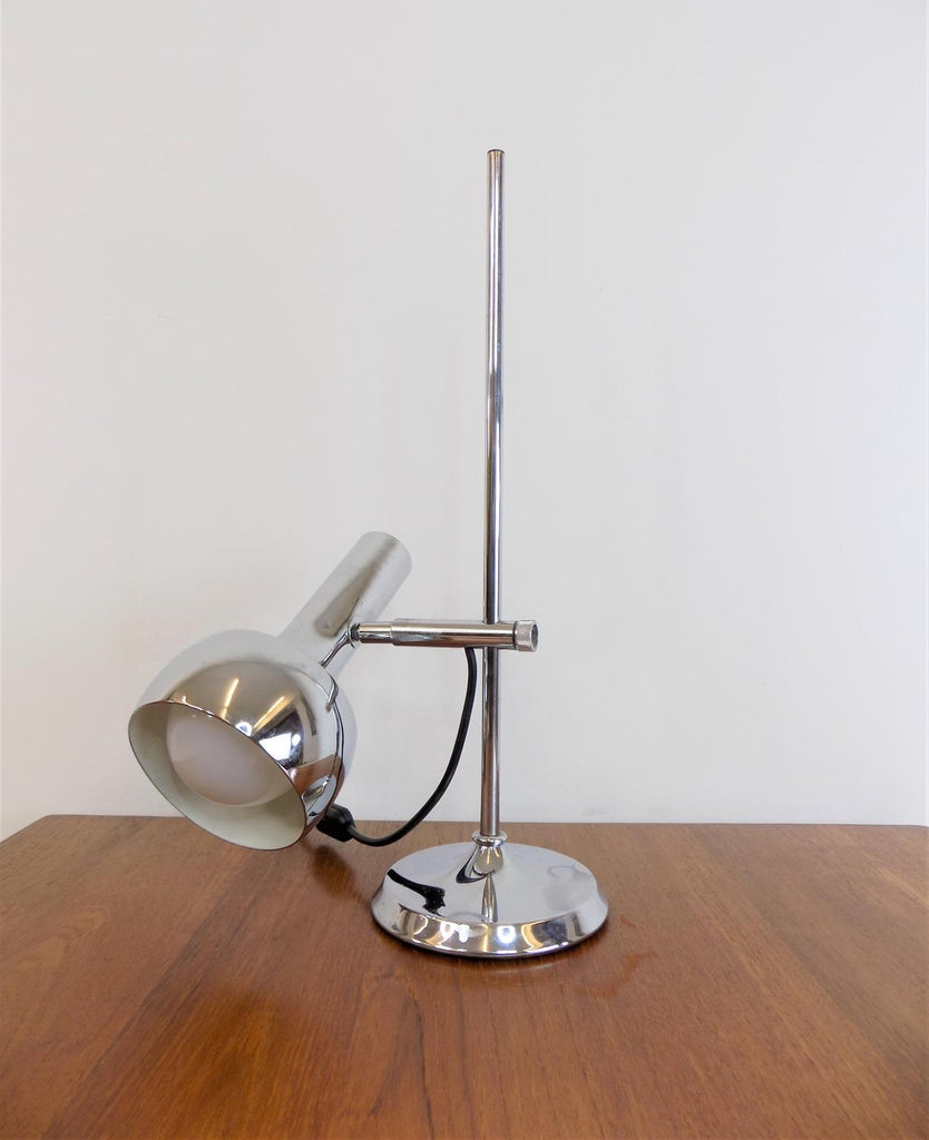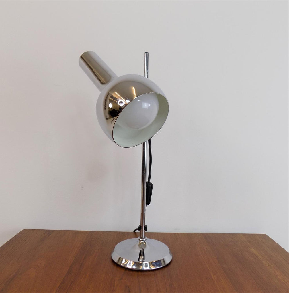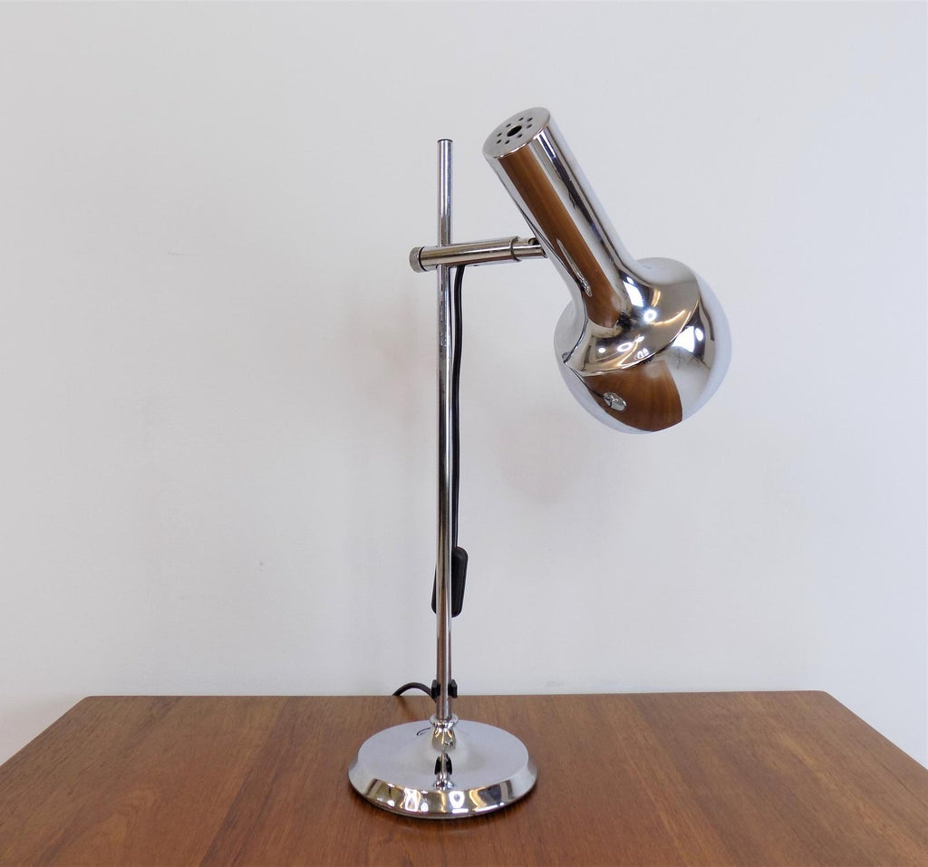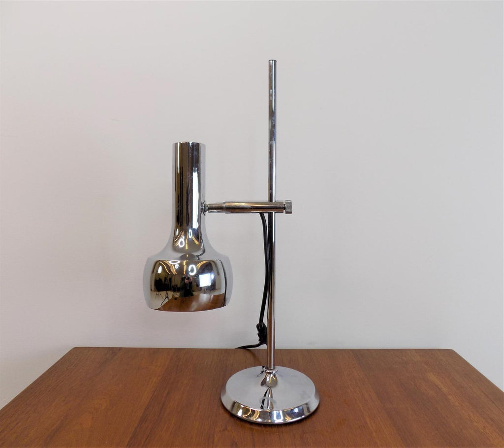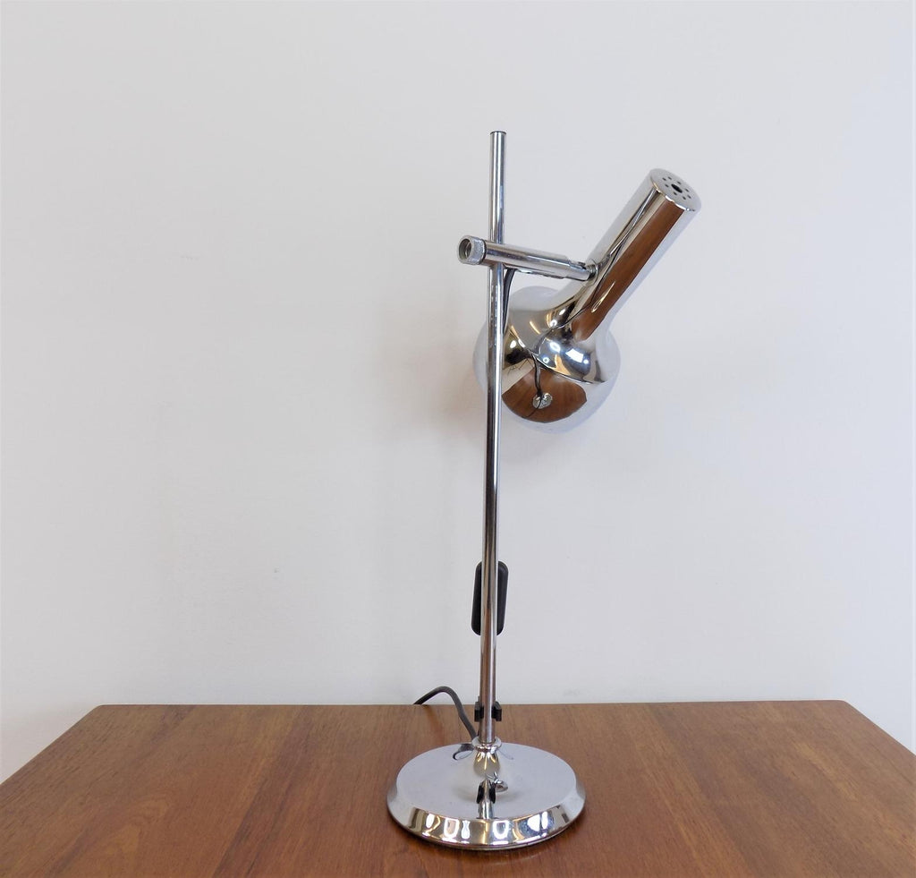 크롬 전등갓이 있는 이 Swisslamps 테이블 램프는 상태가 매우 양호합니다. 전등갓은 금속 막대를 사용하여 높이를 조절할 수 있고 거의 360도 회전할 수 있습니다. 램프의 기능은 완벽하고 스위치가 리뉴얼되었습니다. Swisslamps International은 정확성과 생산 시 최고 품질의 재료 사용으로 잘 알려져 있습니다. 이 램프는 196년에 설계되었습니다.