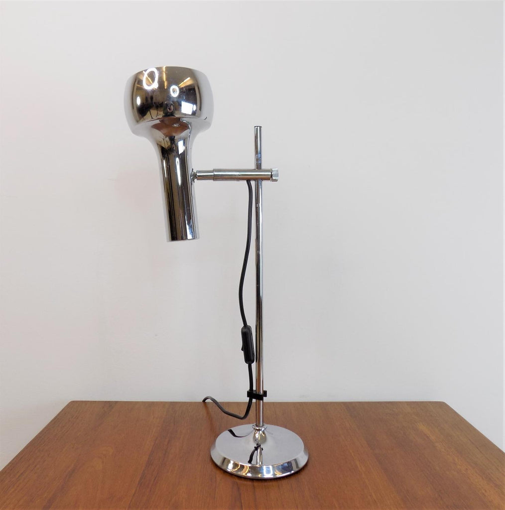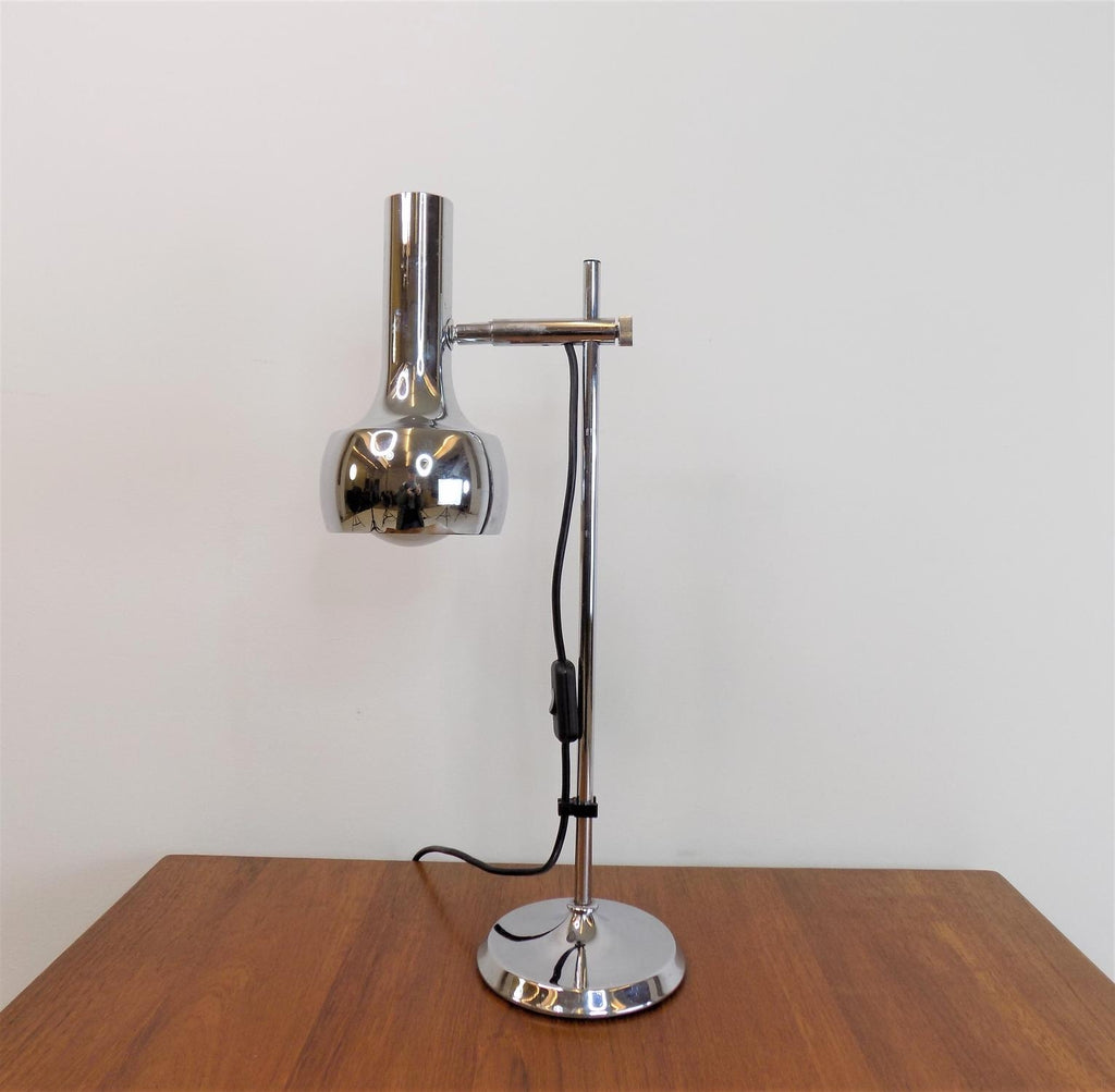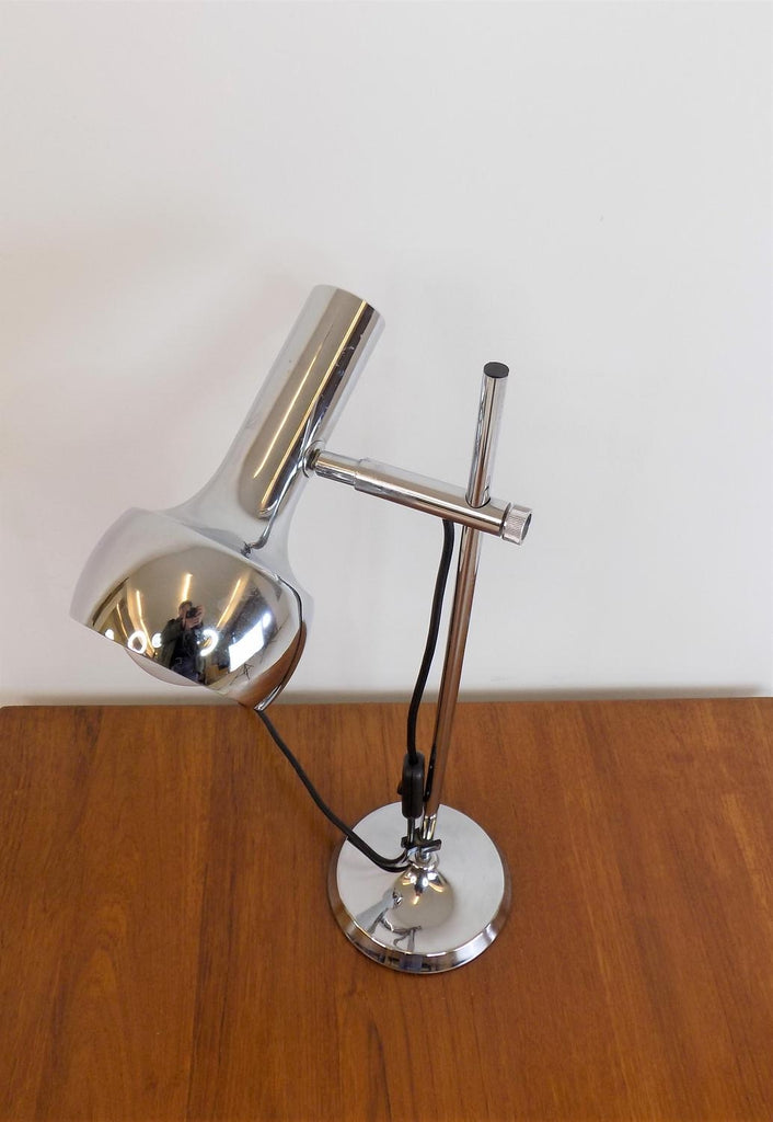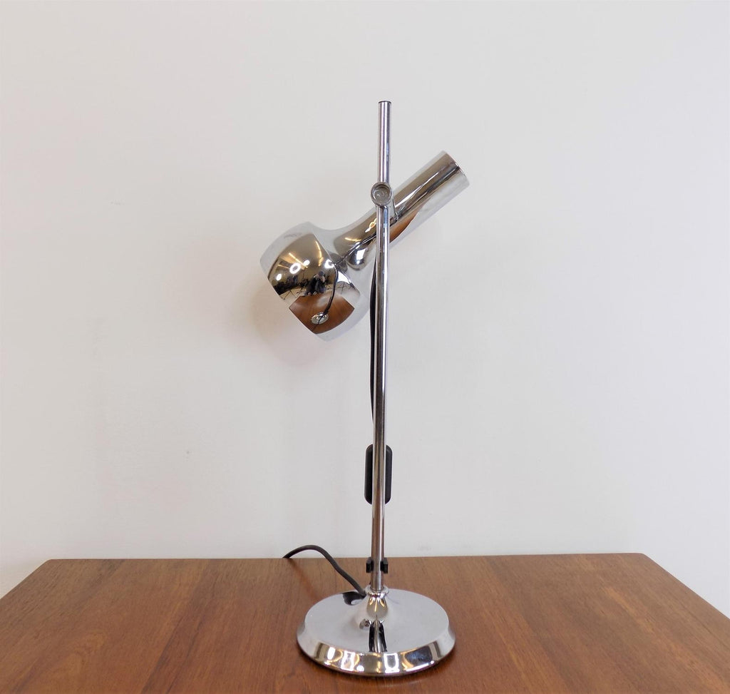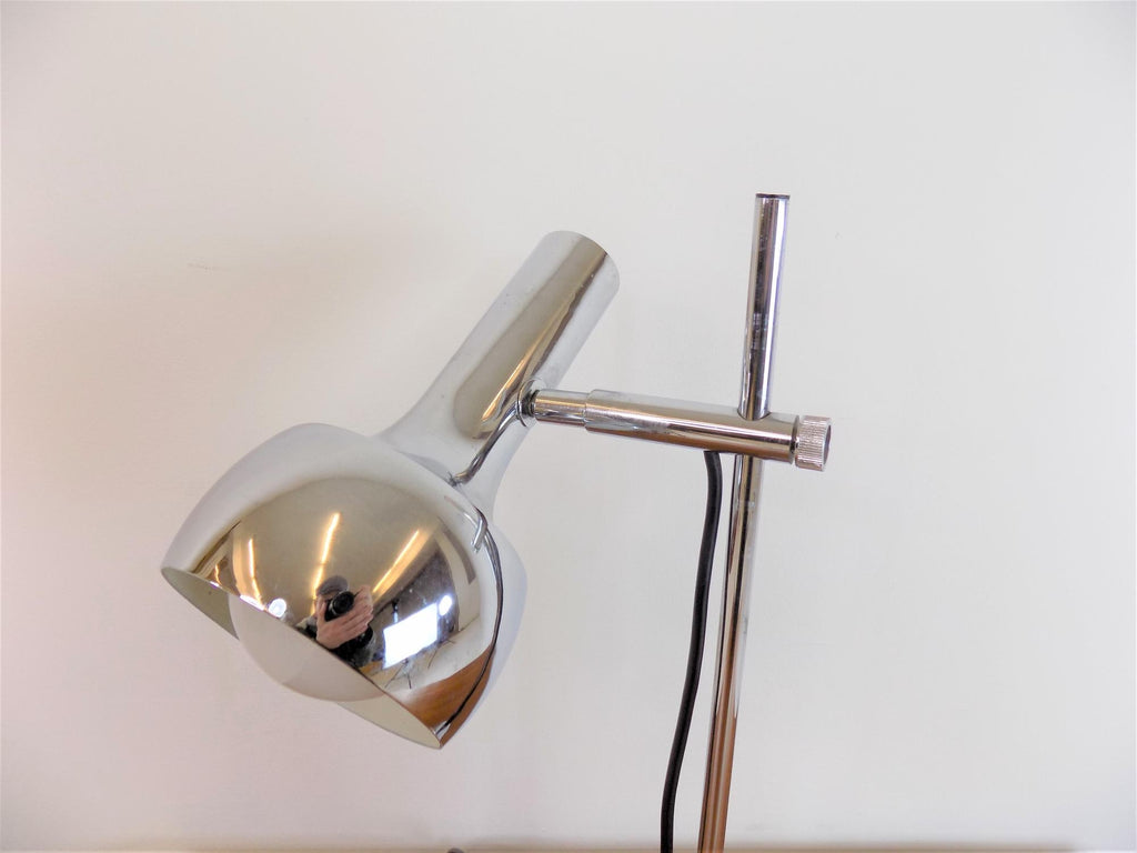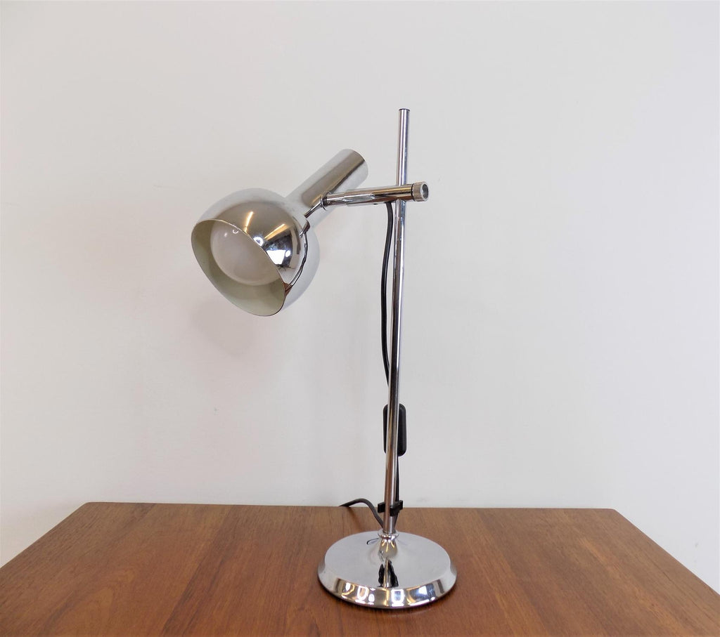 크롬 전등갓이 있는 이 Swisslamps 테이블 램프는 상태가 매우 양호합니다. 전등갓은 금속 막대를 사용하여 높이를 조절할 수 있고 거의 360도 회전할 수 있습니다. 램프의 기능은 완벽하고 스위치가 리뉴얼되었습니다. Swisslamps International은 정확성과 생산 시 최고 품질의 재료 사용으로 잘 알려져 있습니다. 이 램프는 196년에 설계되었습니다.