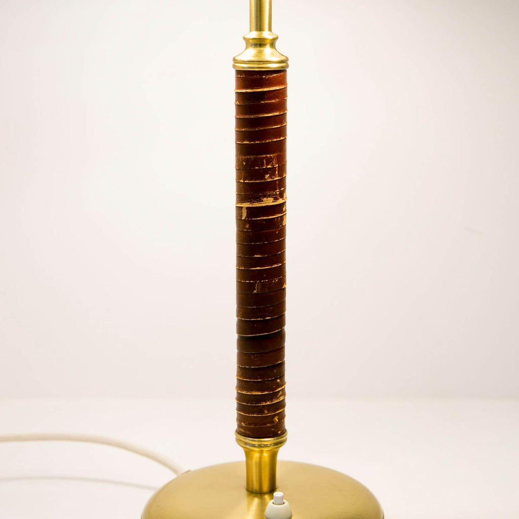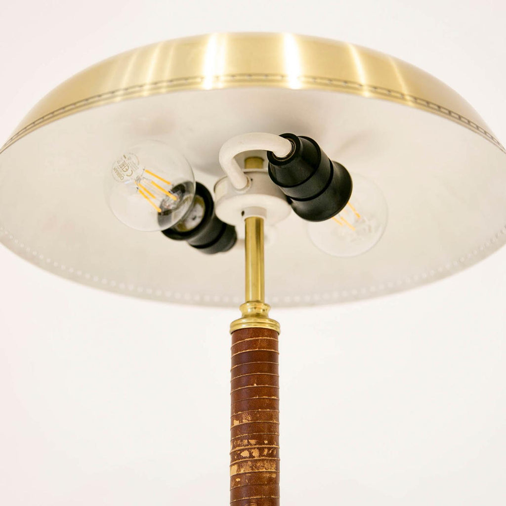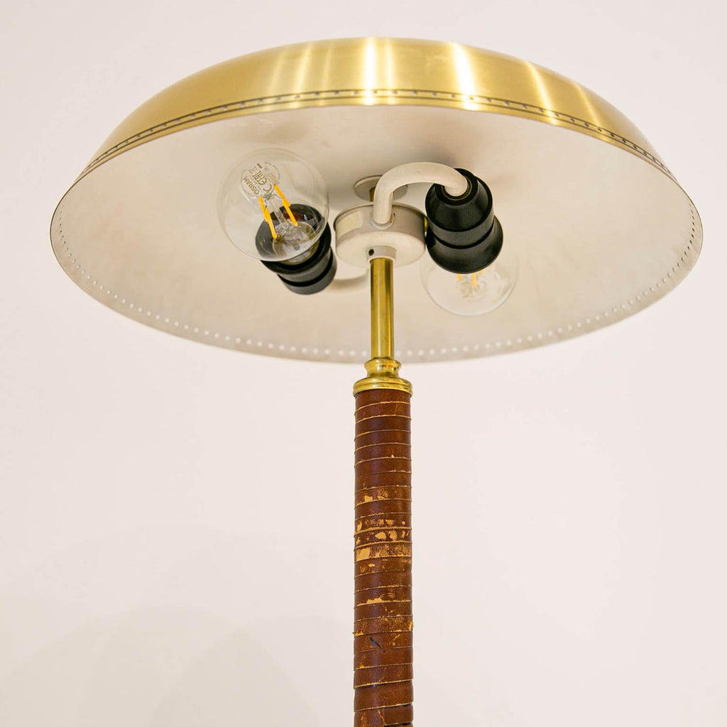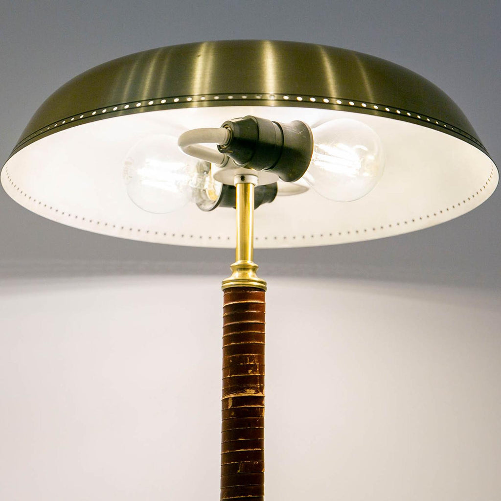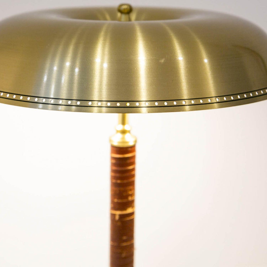 1950년경 스웨덴 Boréns Borås의 황동 및 가죽 테이블 램프, 천공 장식이 있는 램프 갓, 바닥에 "B8452"라고 표시된 두 개의 조명.