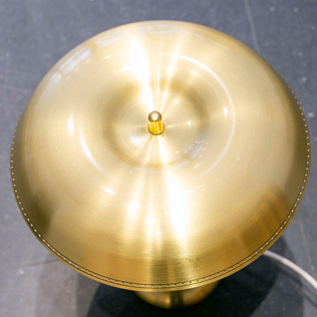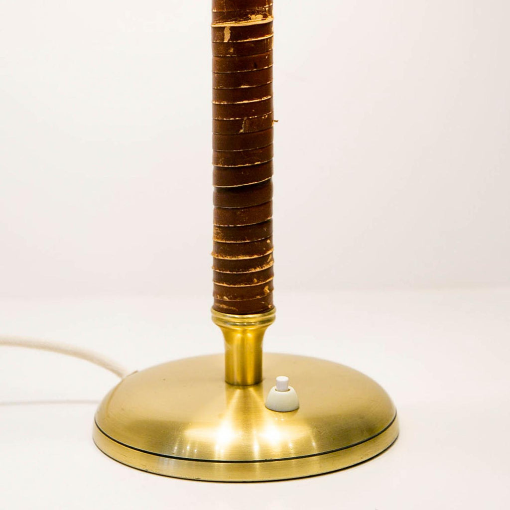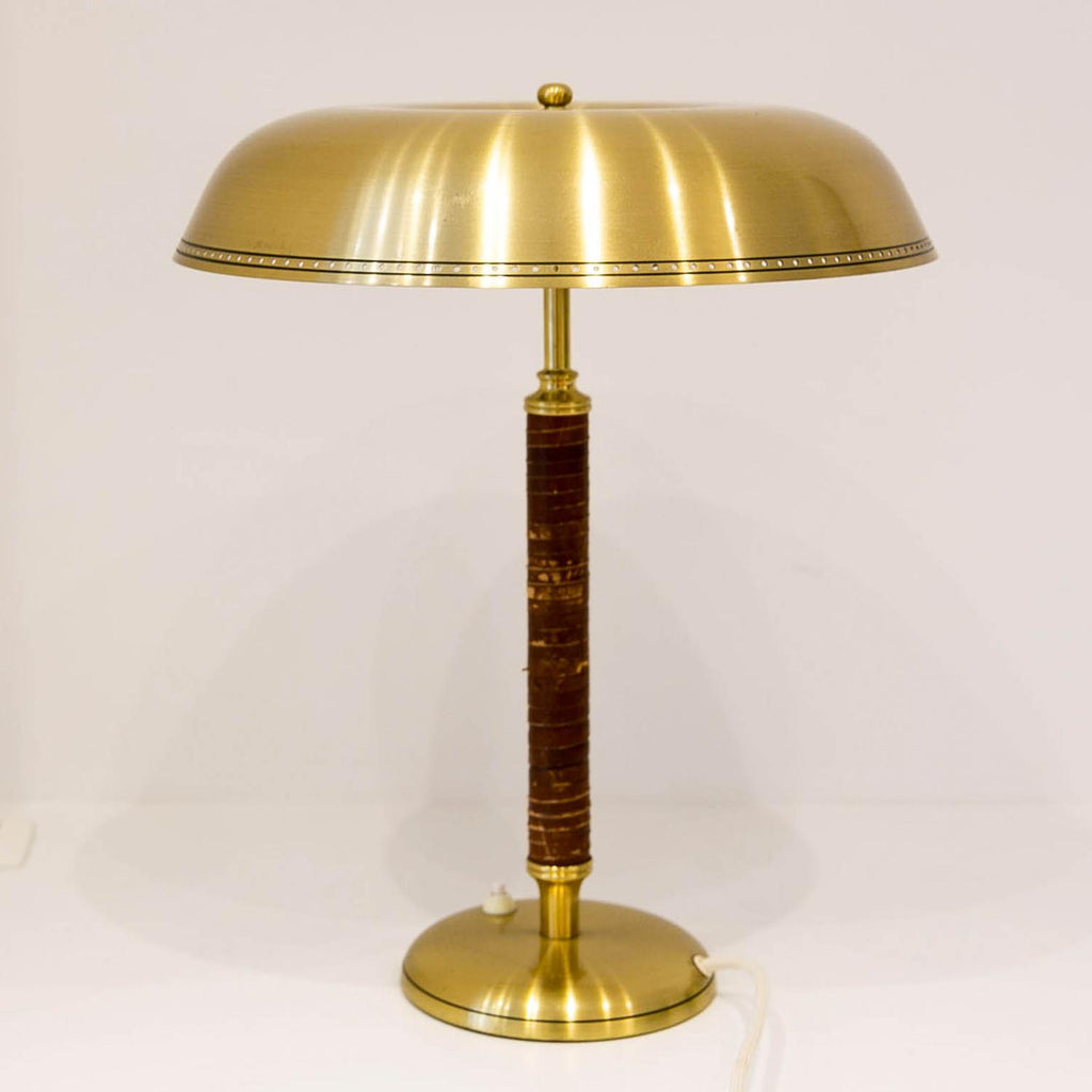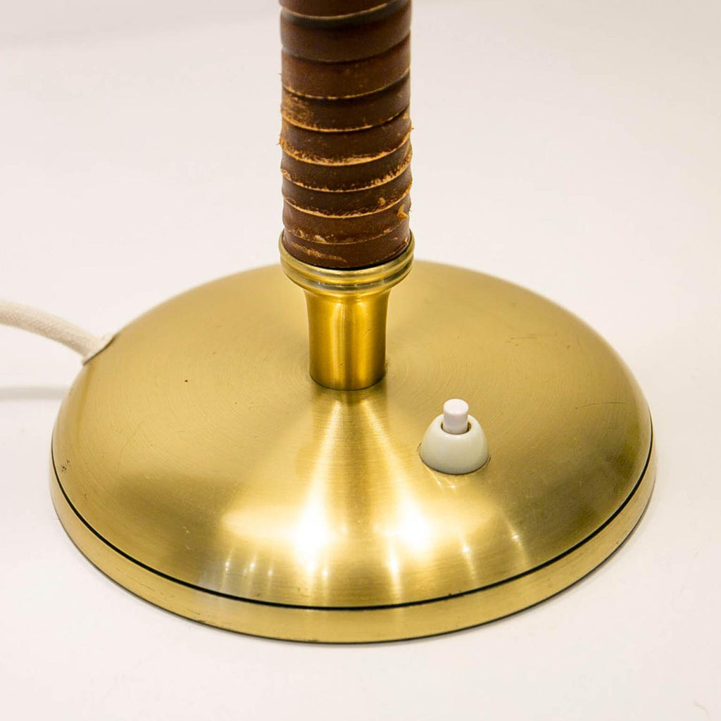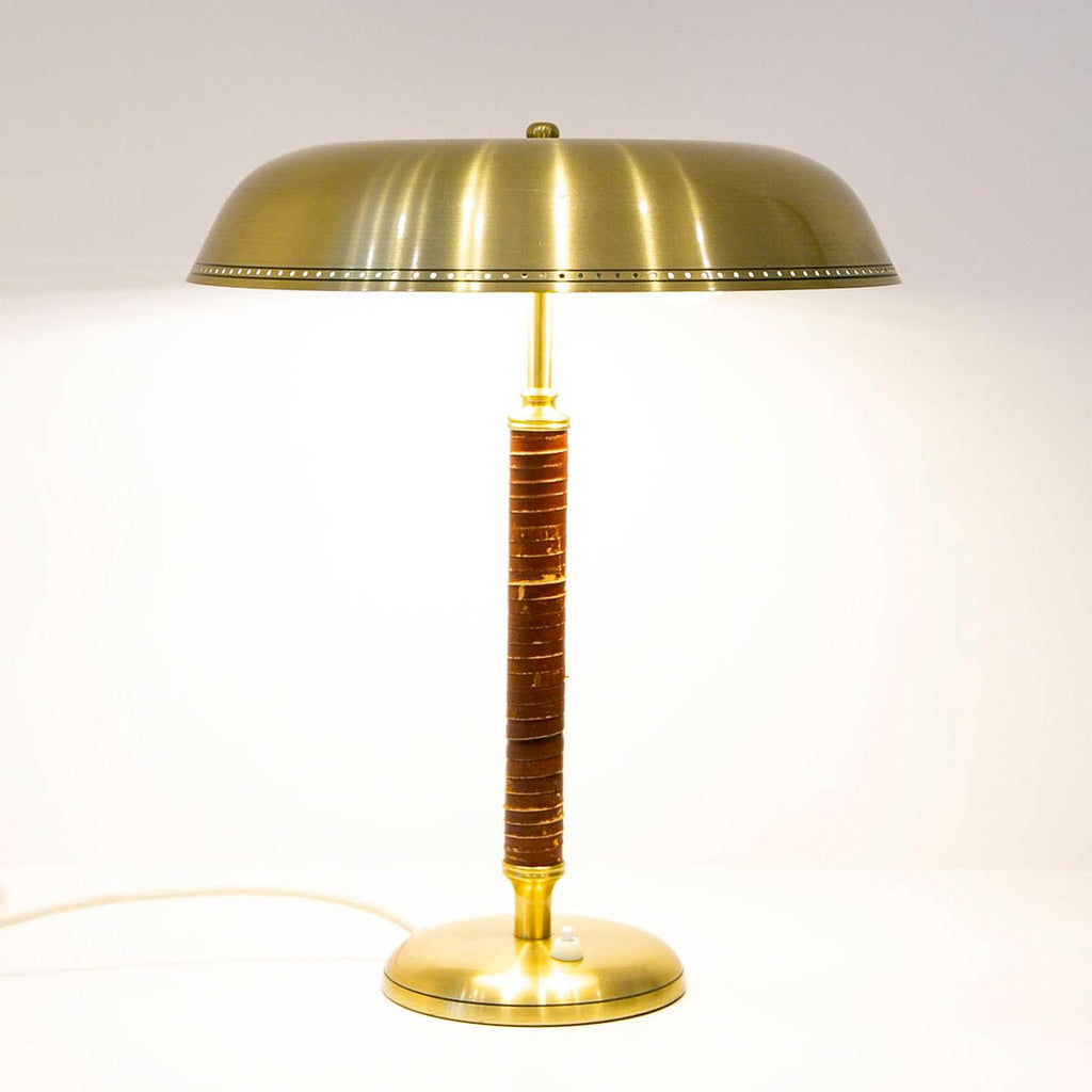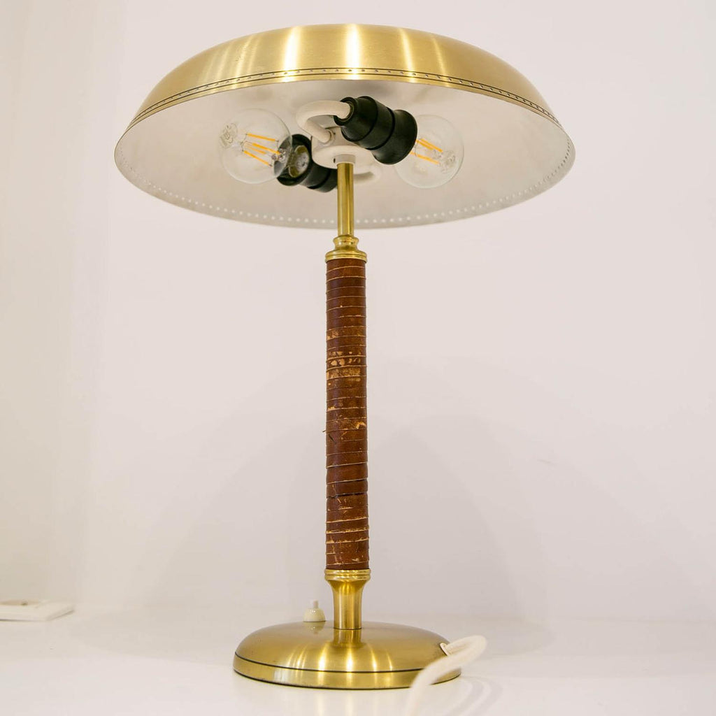 1950년경 스웨덴 Boréns Borås의 황동 및 가죽 테이블 램프, 천공 장식이 있는 램프 갓, 바닥에 "B8452"라고 표시된 두 개의 조명.