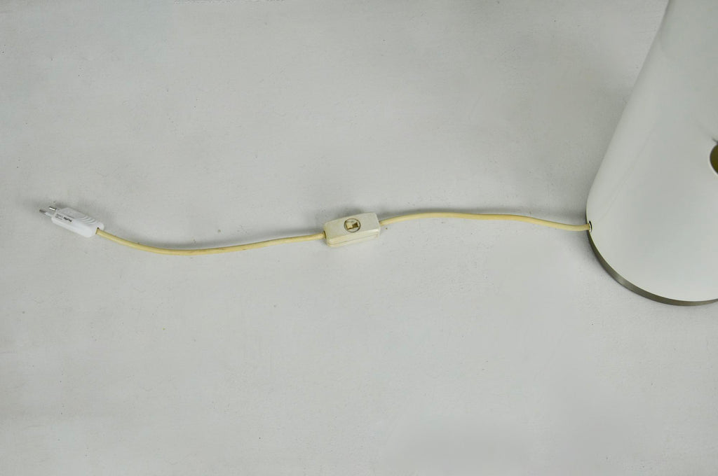 브러시드 메탈 베이스가 있는 화이트 메탈 테이블 램프. 램프의 시간과 수명으로 인한 마모