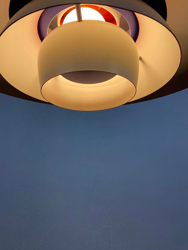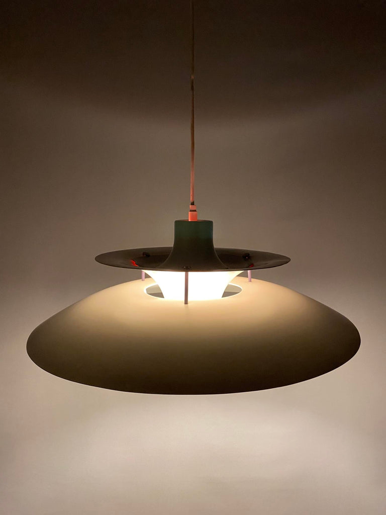 다음은 1970년대부터 Poul Henningsen의 가장 인기 있는 펜던트 조명 중 하나입니다. PH5 펜던트 램프는 미색 톤의 보라색과 주황색이 강조된 금속으로 제작되었습니다. 덴마크의 유명한 램프 회사인 Louis Poulsen A/S의 제품입니다. Poul Henningsen은 지난 세기의 가장 독특하고 세계적으로 유명한 건축가 중 한 명입니다. Lamp Design, 일부 건물 및 가구 외에도 그는 덴마크 사회 비평가이자 시인의 서클의 일부였습니다. DIMENSIONS 높이: 24cm 직경: 50cm 코드 길이: 100cm PRODUCT DETAILS 상태: 아주 좋음 - 작은 사용 흔적, 금속은 매우 유연하여 약간의 변형이 있습니다. 재질: 쇠장식: E27 전구 및 천장 캡 포함 제조사: Louis Poulsen A/S 디자이너: Poul Henningsen 생산 기간: 1970 원산지: 덴마크 미드 센추리 모던 조명, 빈티지 램프, 디자인 조명 및 빈티지 디자인의 다양한 제품을 제공합니다. Murano, Vistosi, Holmegaard, Glashutte limburg 및 Peill and Putzler와 같은 많은 유리 조명.