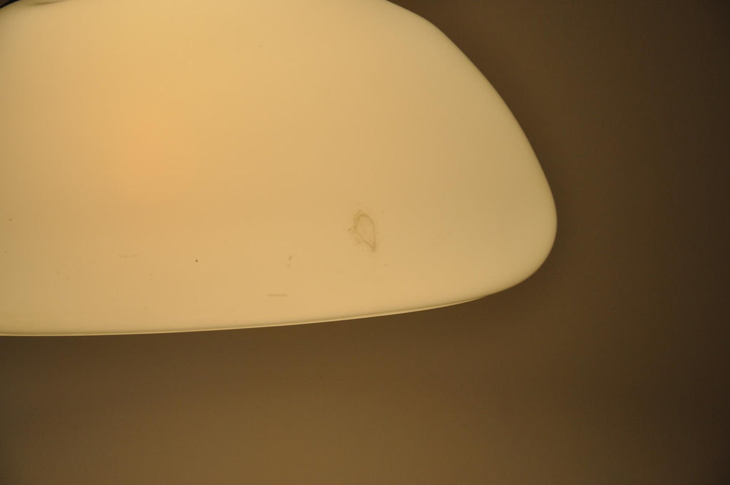 흰색 플라스틱과 금속 소재의 굴절식 테이블 램프. 다리 바닥에 각인. 그늘에서 자르십시오. 램프의 시간과 노후화로 인한 마모.