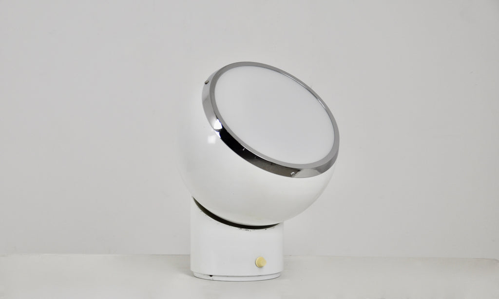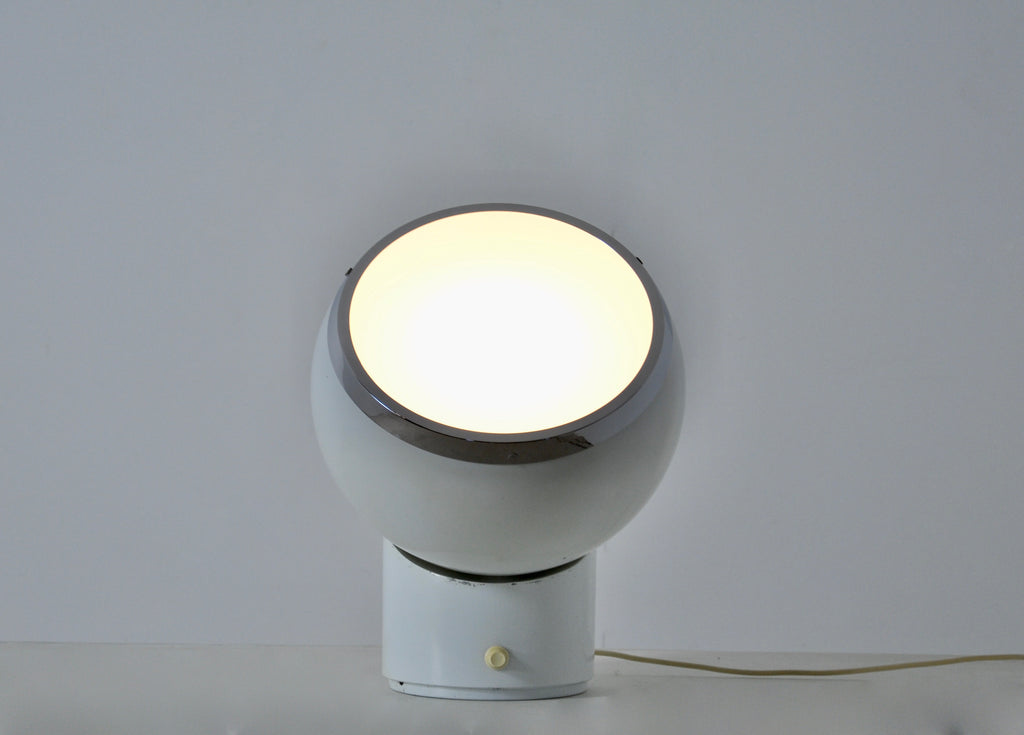 메탈과 반투명 유리 소재의 화이트 테이블 램프. 크롬 도금 금속 프레임. 360° 회전 가능한 지구본. 조절 스위치.