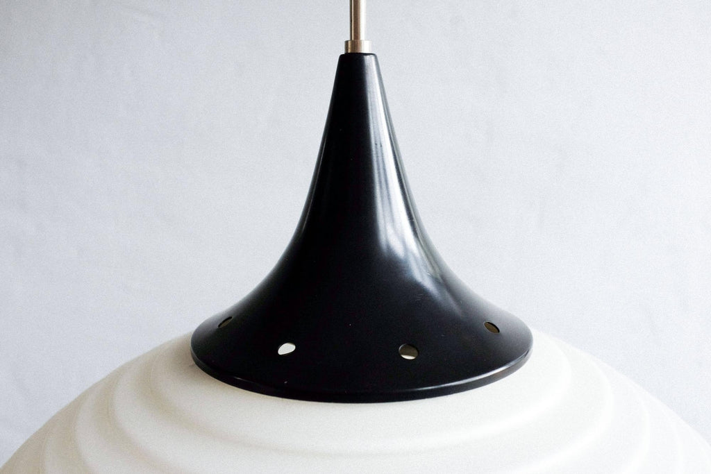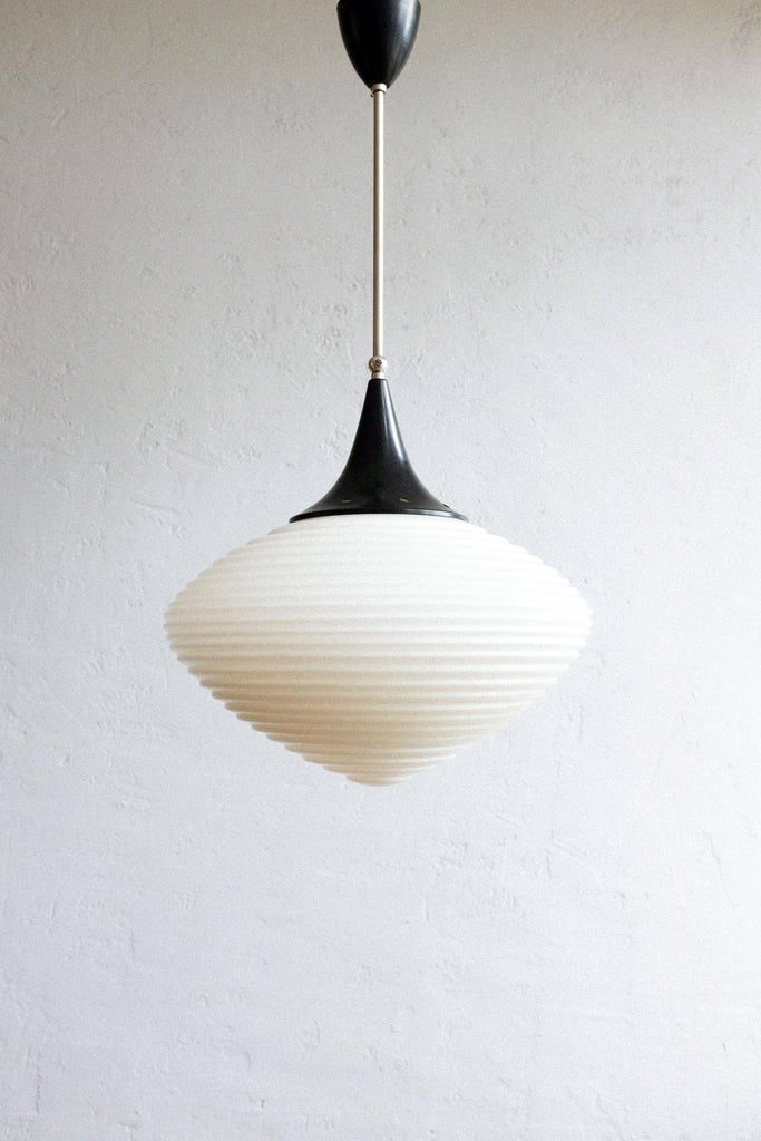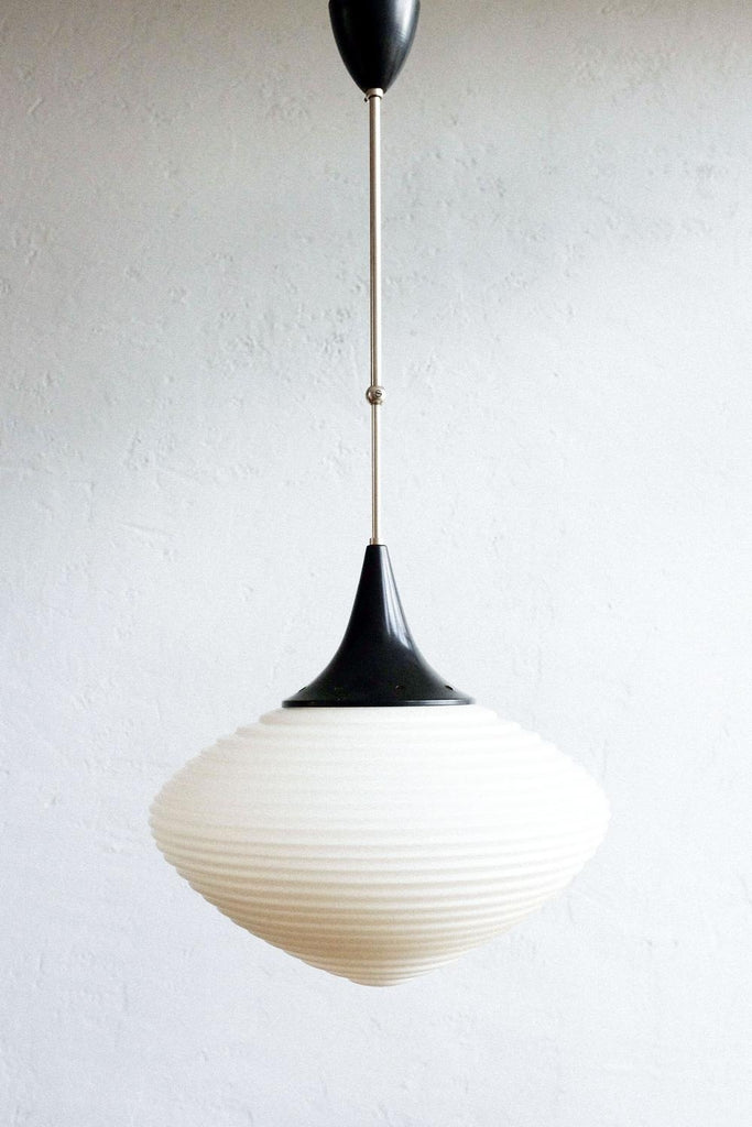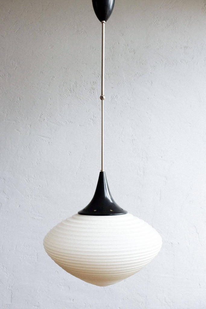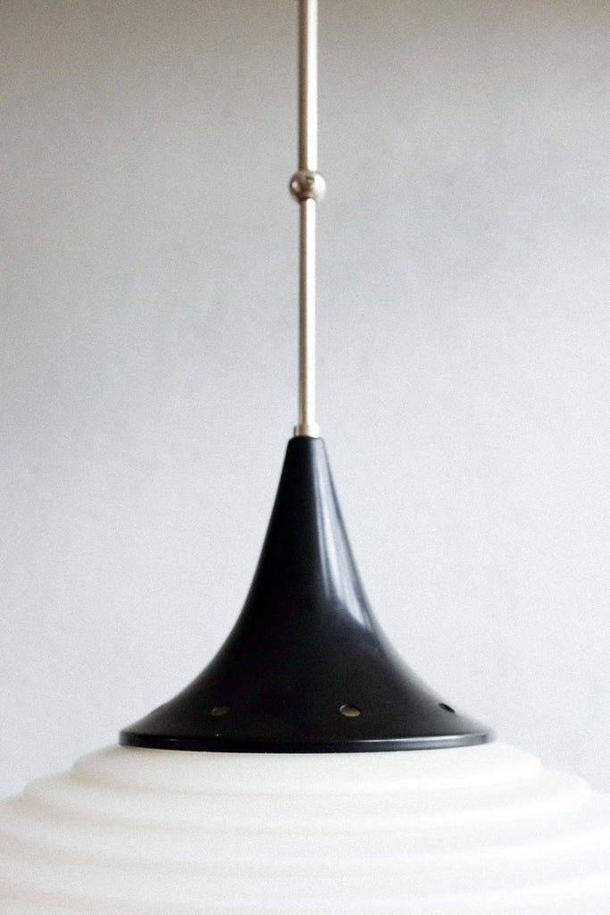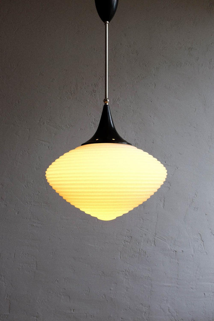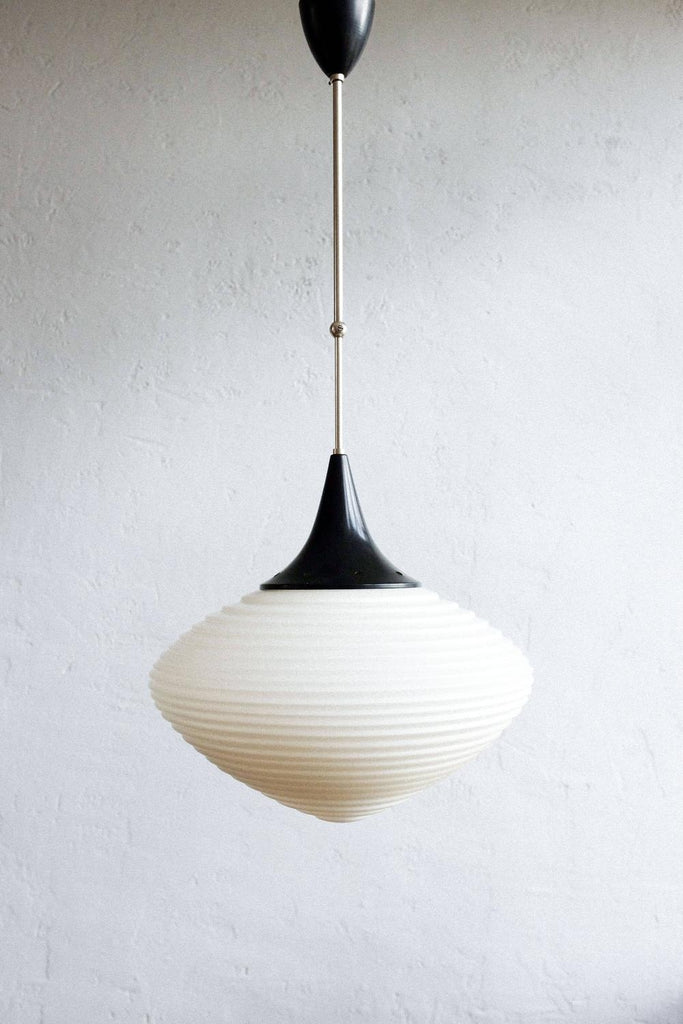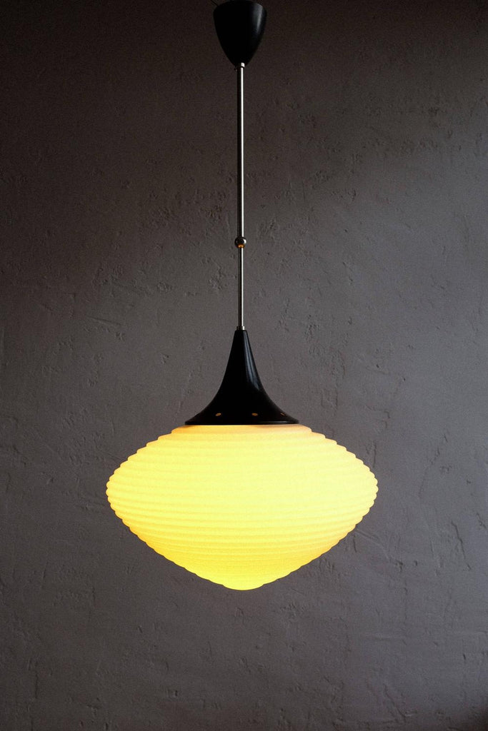 70년대 Kamenický Šenov가 만든 빈티지 행잉 램프. 우유 유리 전등갓은 따뜻한 확산광을 제공합니다. 극 길이는 조정 가능하며 램프의 총 길이는 80-105cm가 될 수 있습니다. 완전히 복원되고 배선이 변경되어 최상의 상태입니다.