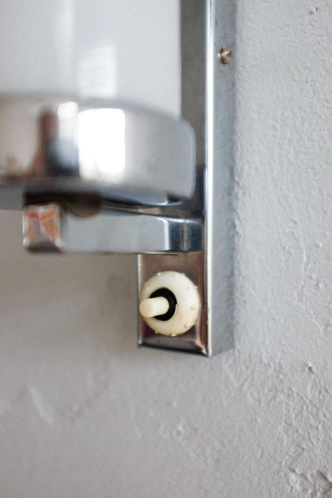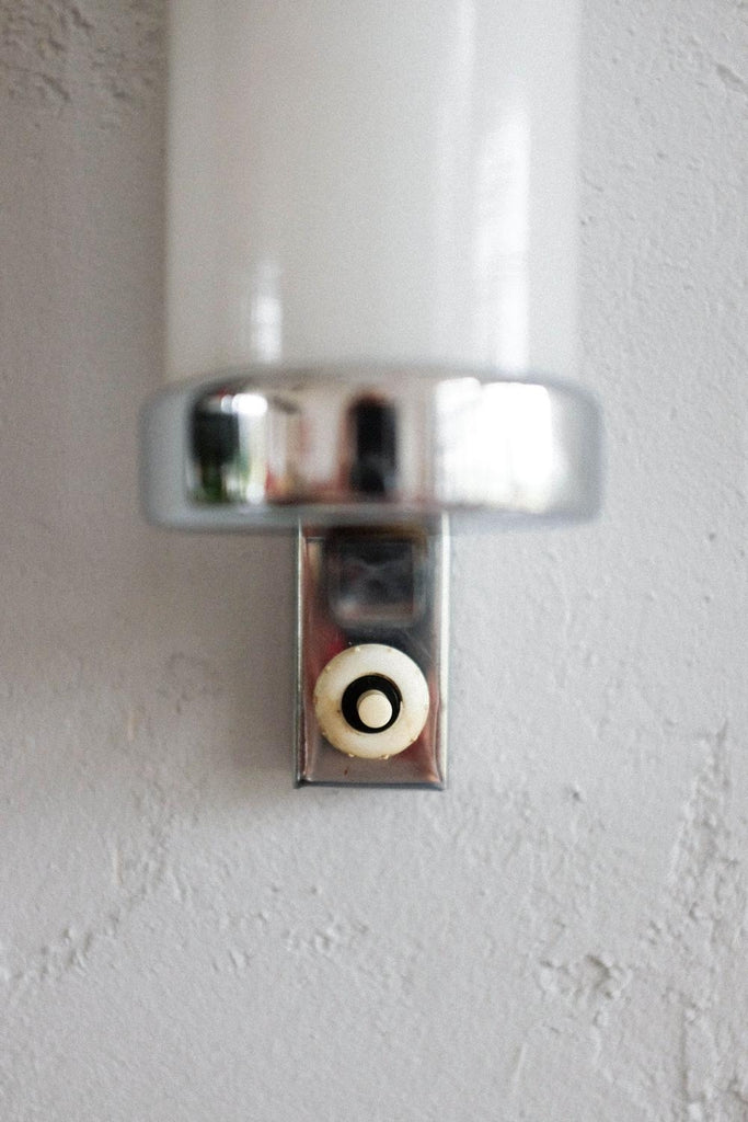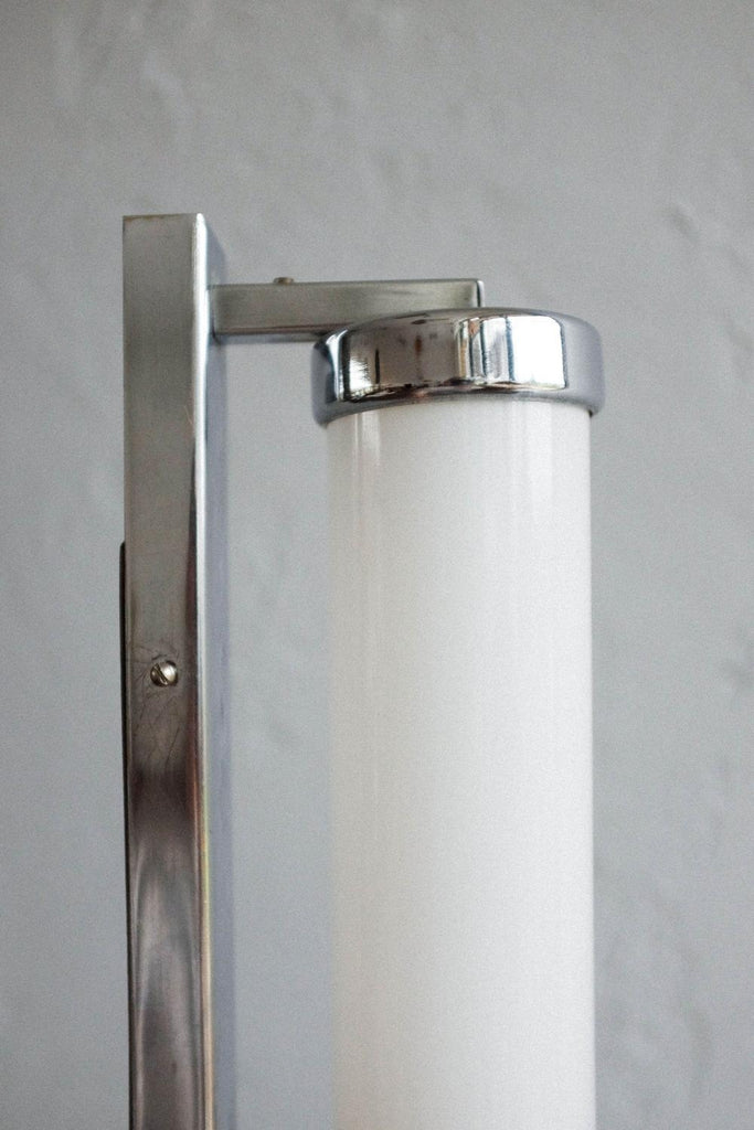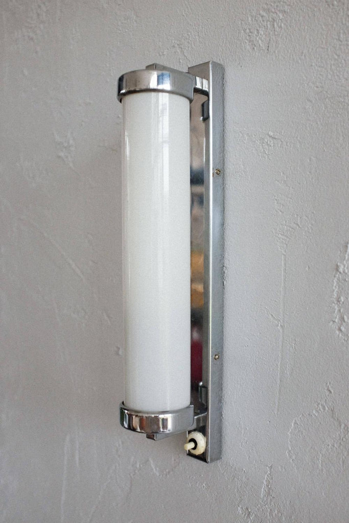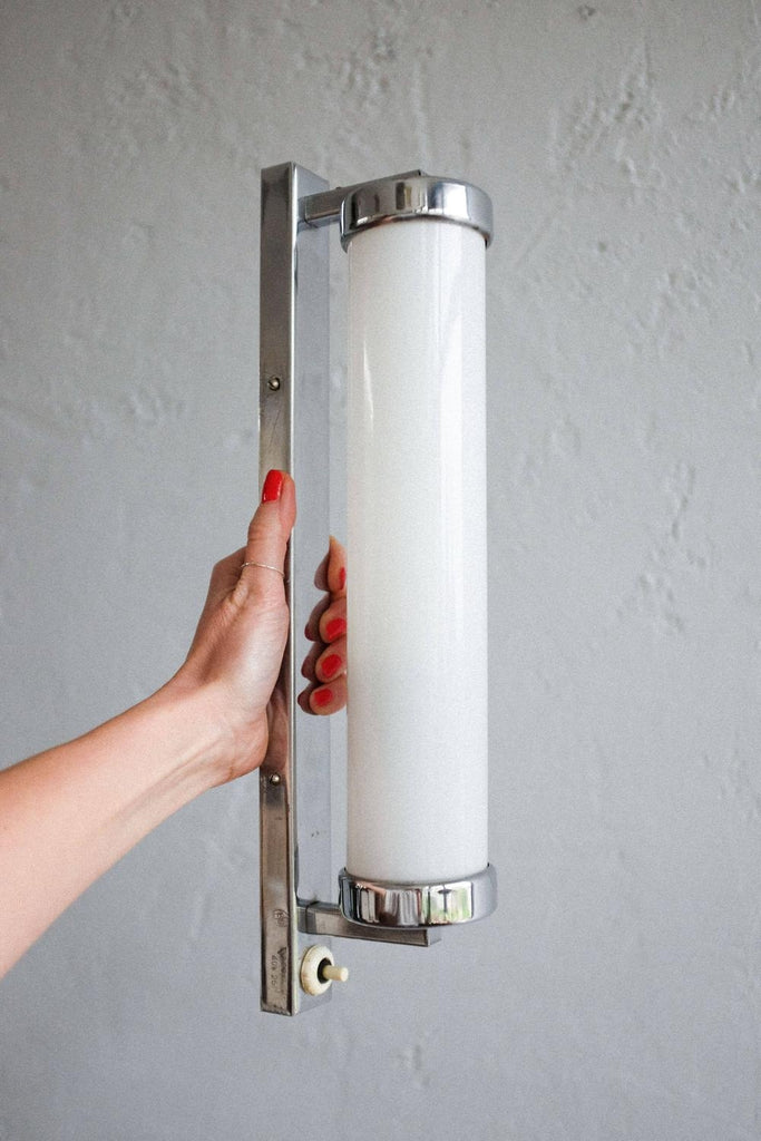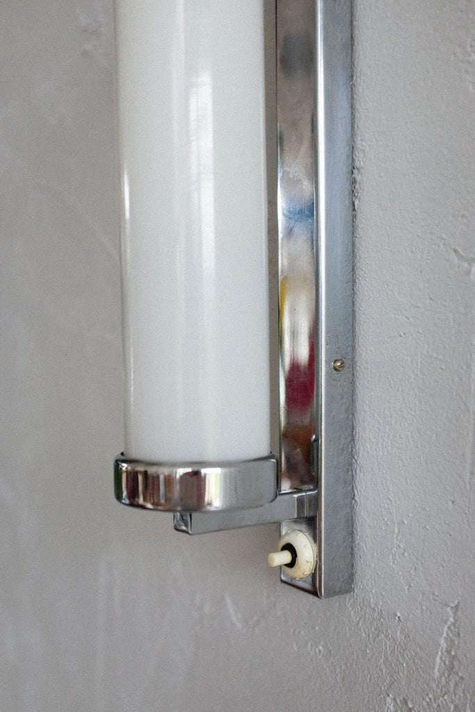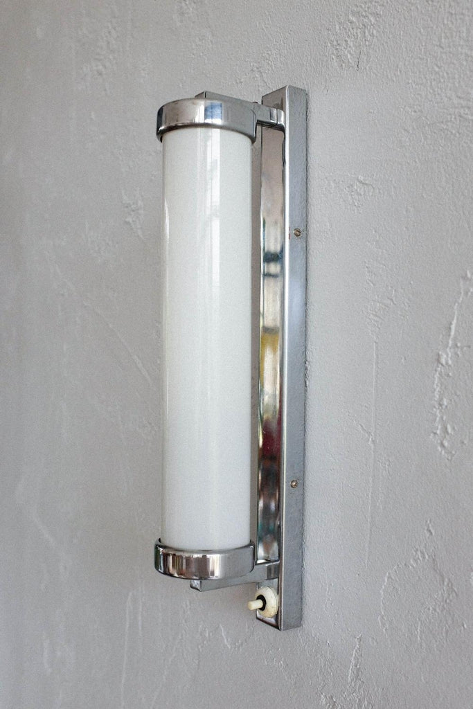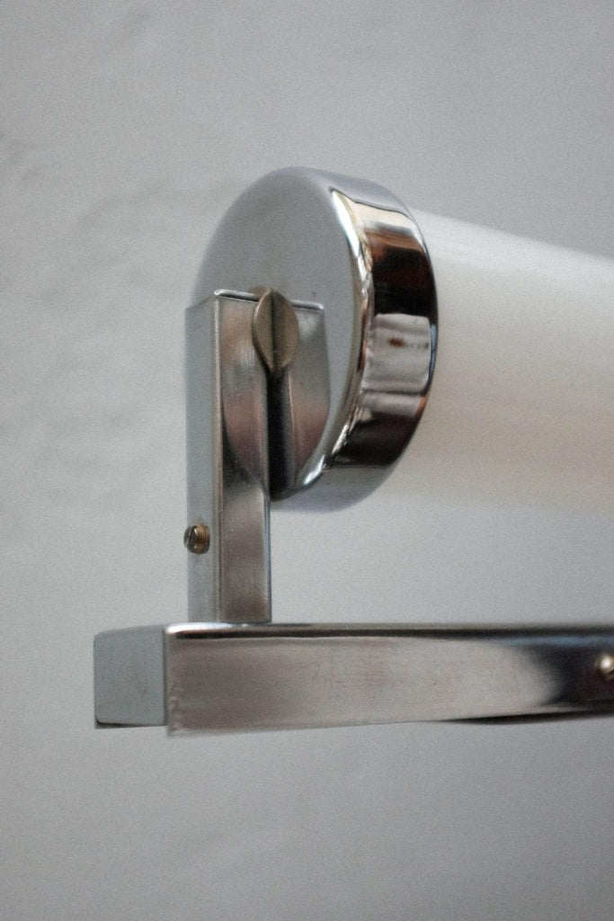 50년대경 체코슬로바키아에서 제작된 바우하우스/아르데코 벽 램프. 완전히 청소하고 수리하고 다시 배선했습니다. 우유 유리와 크롬의 조합.