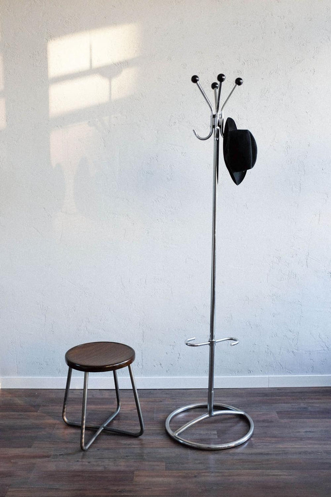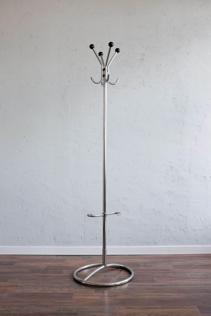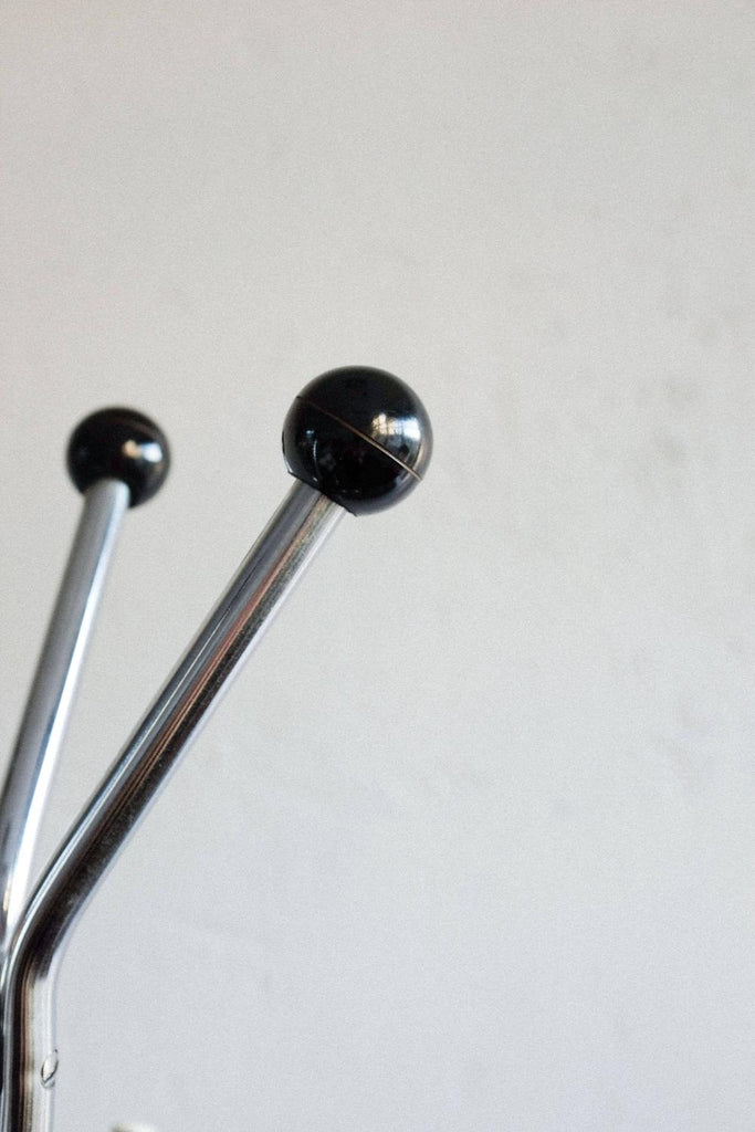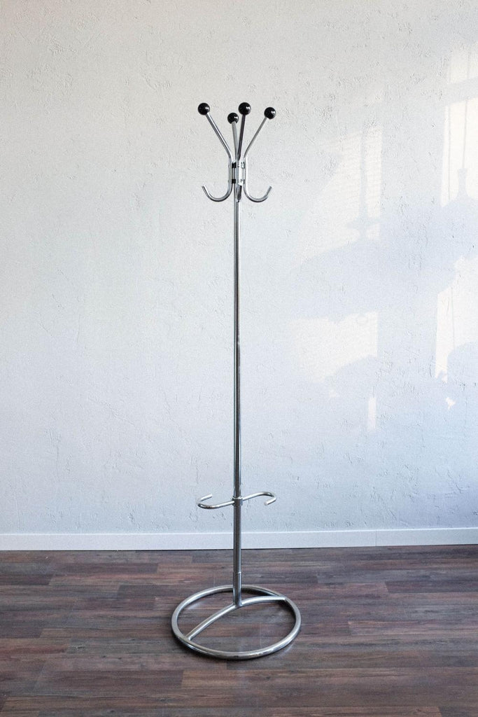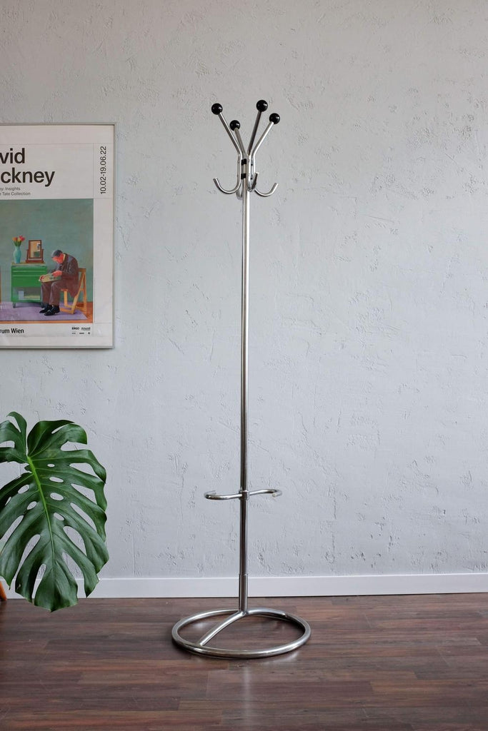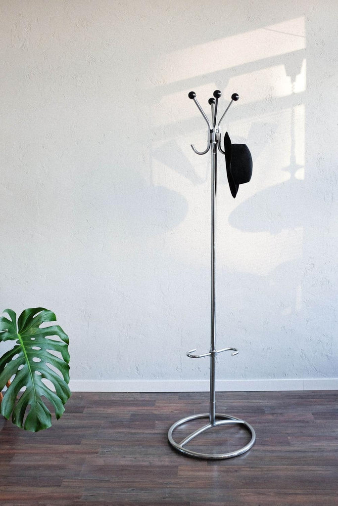 30년대 체코슬로바키아에서 제작된 바우하우스 크롬 도금 옷걸이. 끝 부분에 둥근 팁과 우산 꽂이가 있는 풀 크롬 구조가 특징입니다. 깨끗하고 광택이 나는 아주 좋은 원래 상태입니다. 사진에 보이는 파티나.