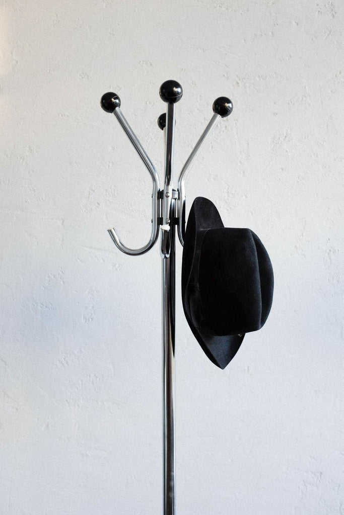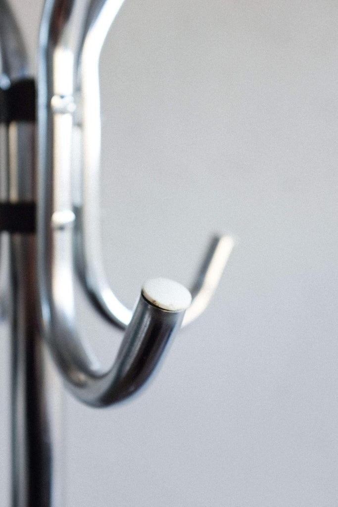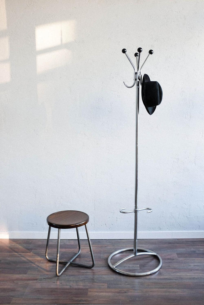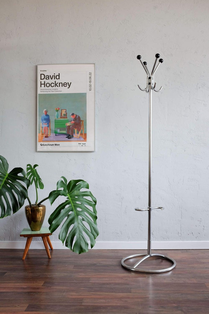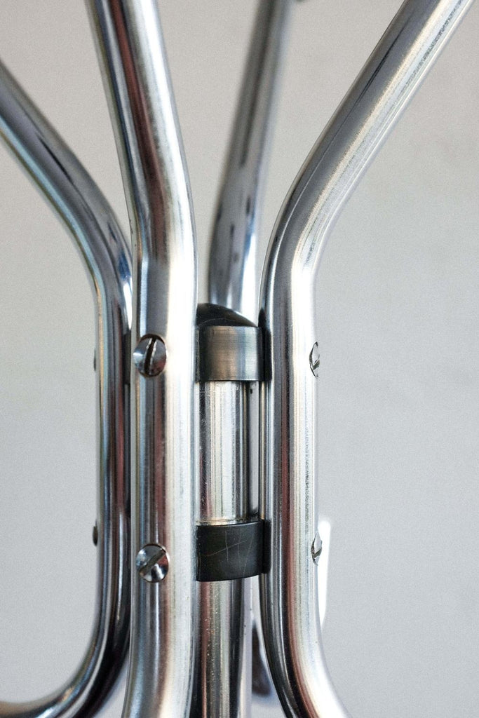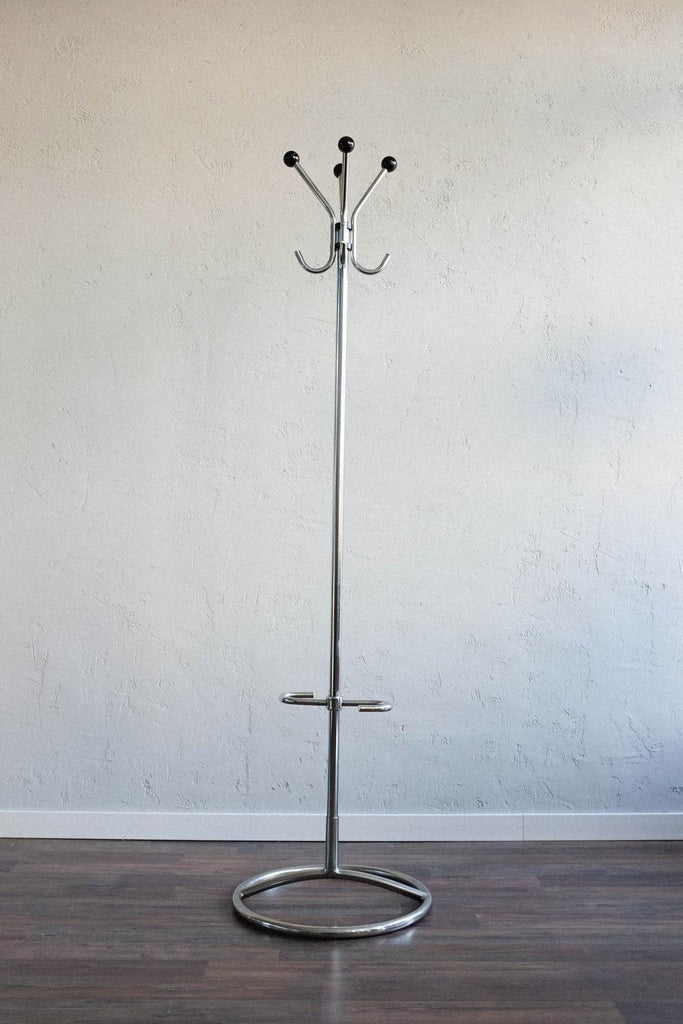 30년대 체코슬로바키아에서 제작된 바우하우스 크롬 도금 옷걸이. 끝 부분에 둥근 팁과 우산 꽂이가 있는 풀 크롬 구조가 특징입니다. 깨끗하고 광택이 나는 아주 좋은 원래 상태입니다. 사진에 보이는 파티나.