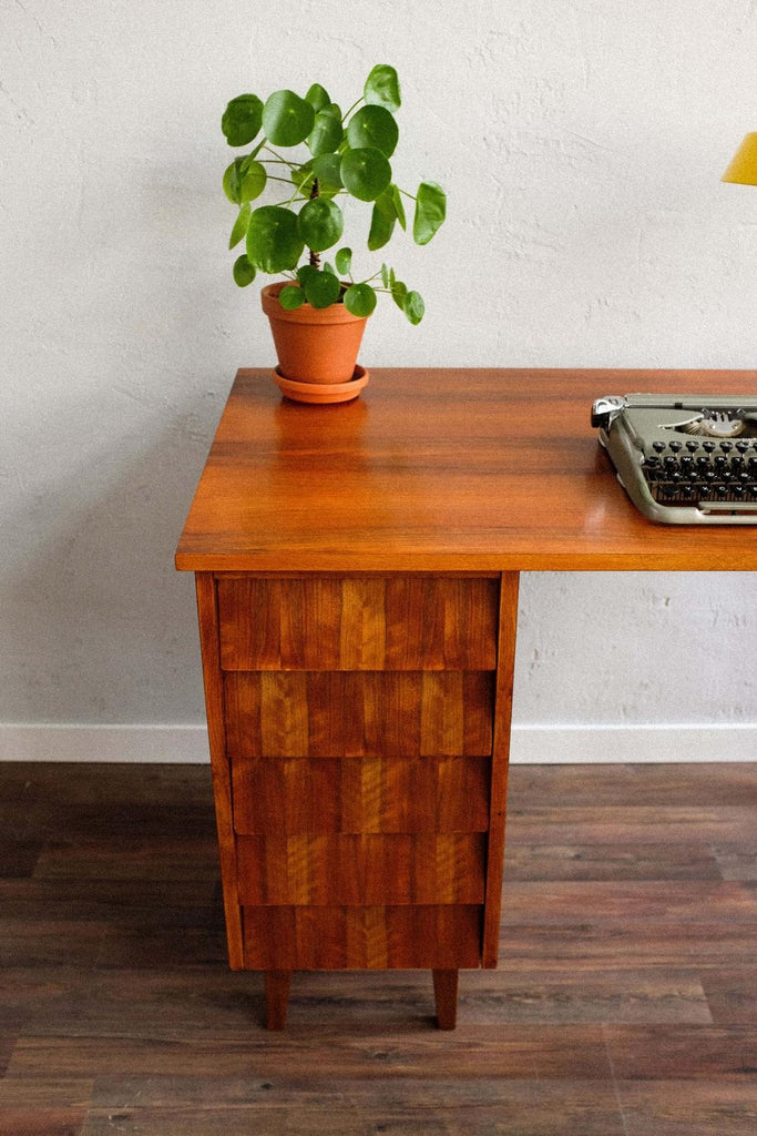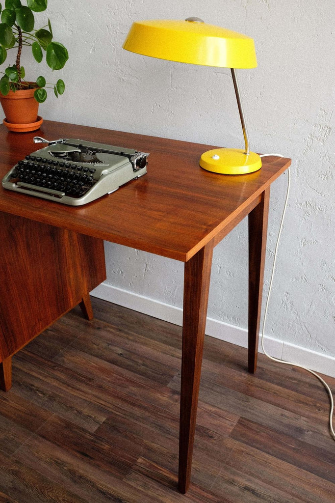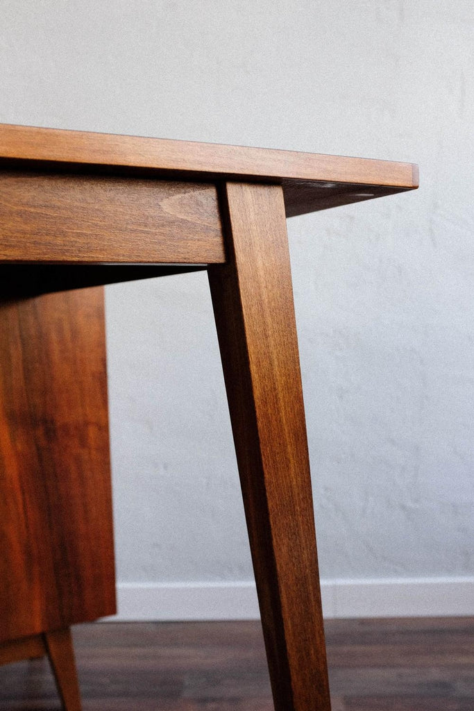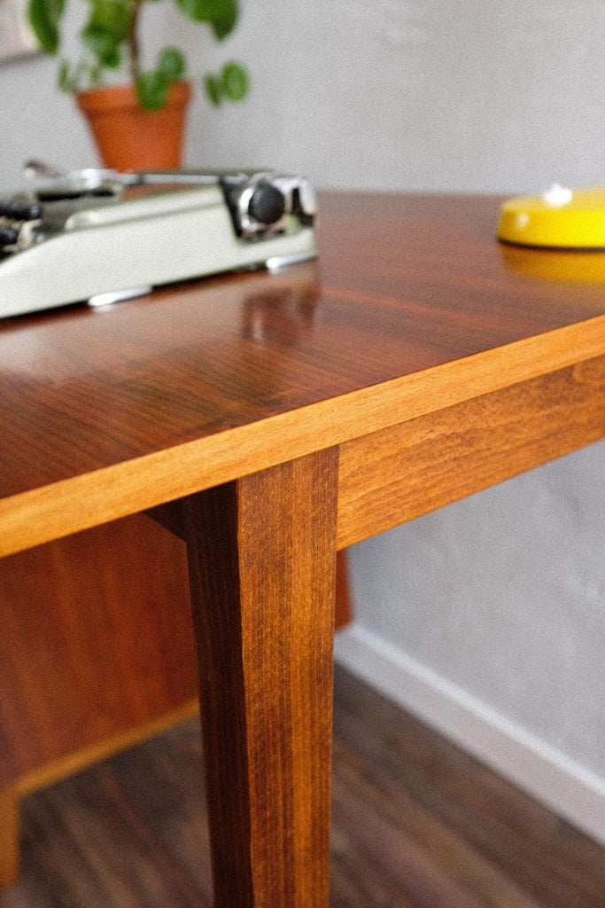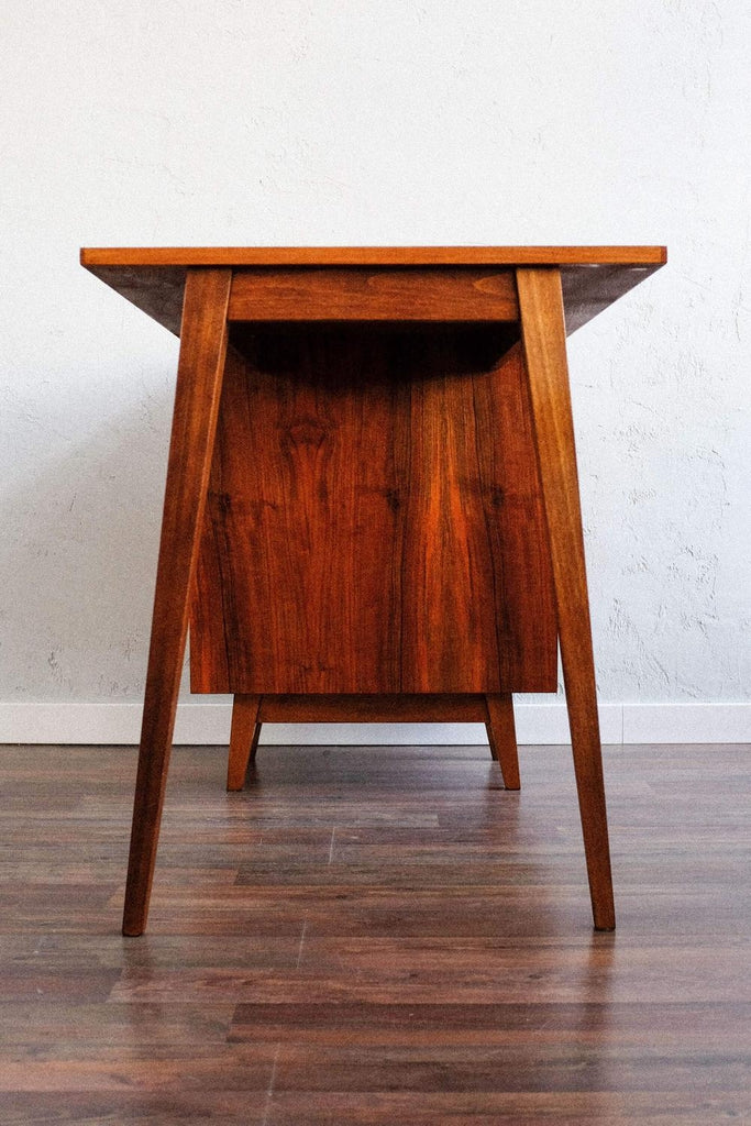60년대 체코슬로바키아에서 제작된 완전히 복원된 빈티지 원목 책상. 아름다운 월넛 베니어로 제작되었습니다. 매우 시대를 초월하고 미니멀한 작품.