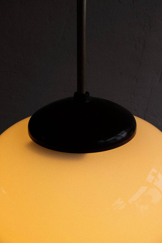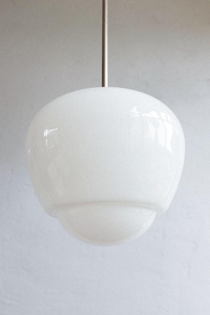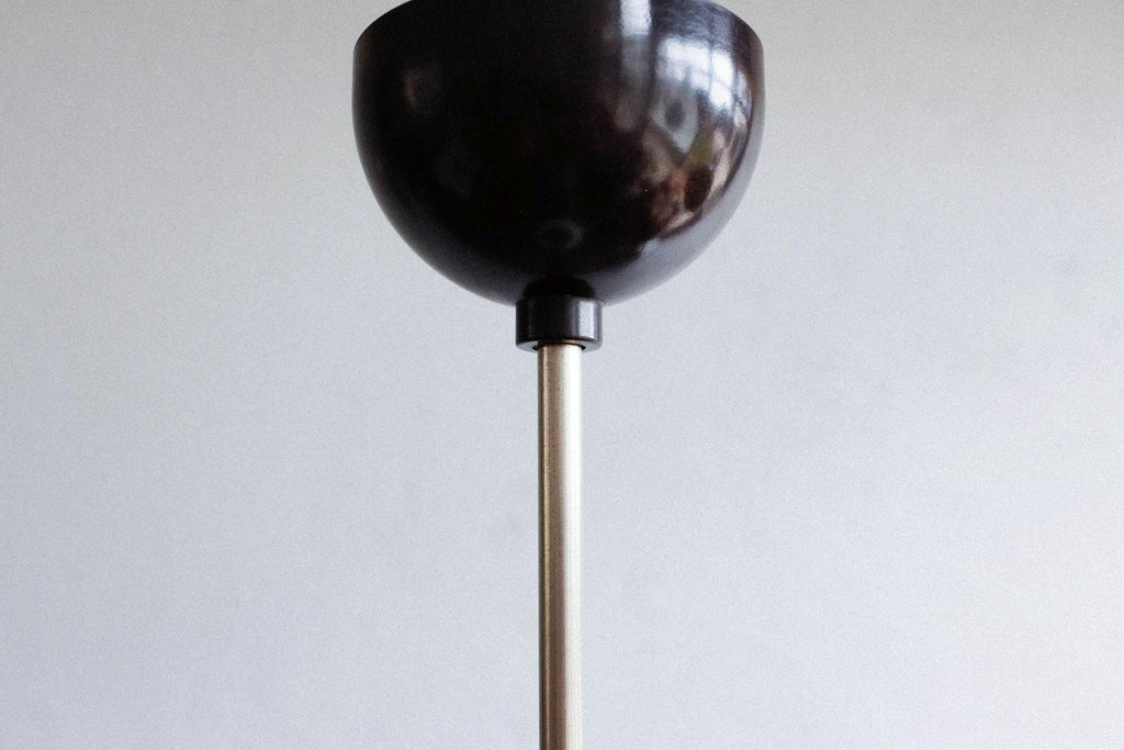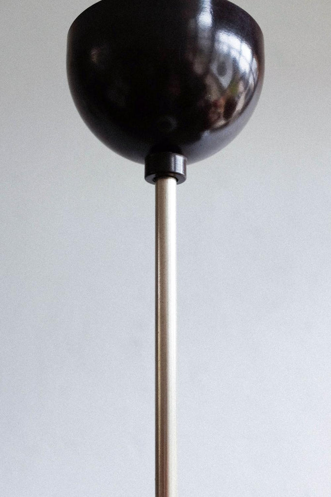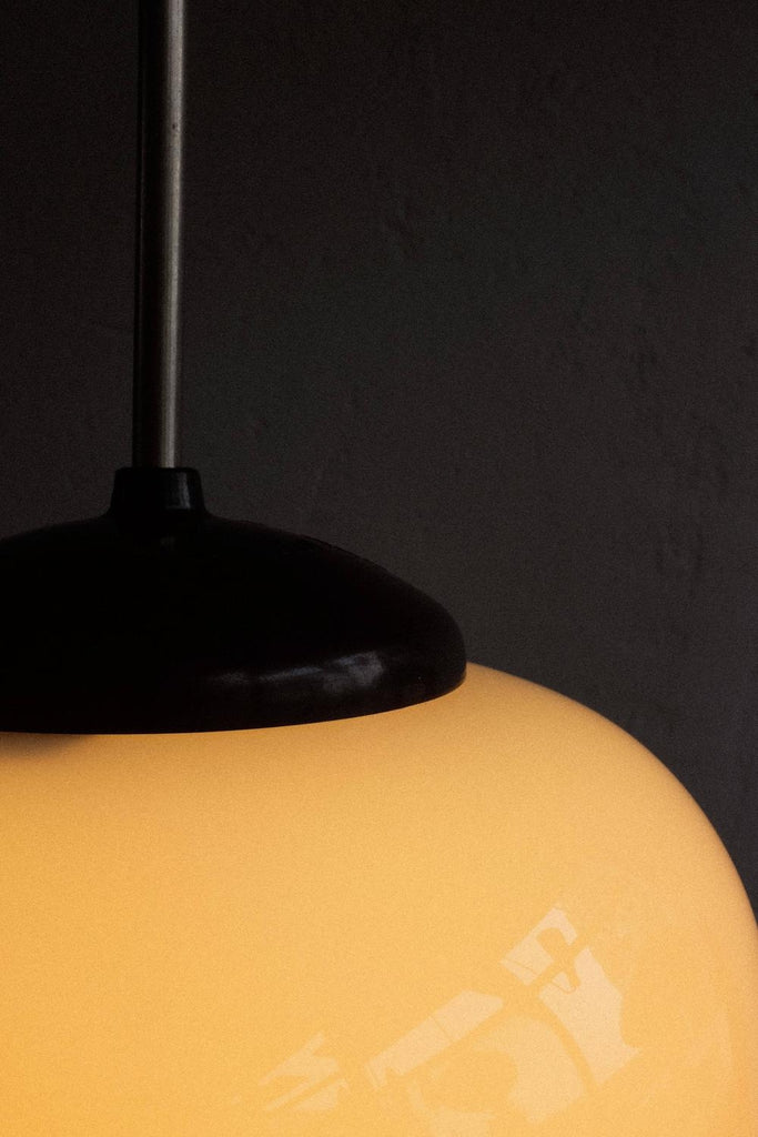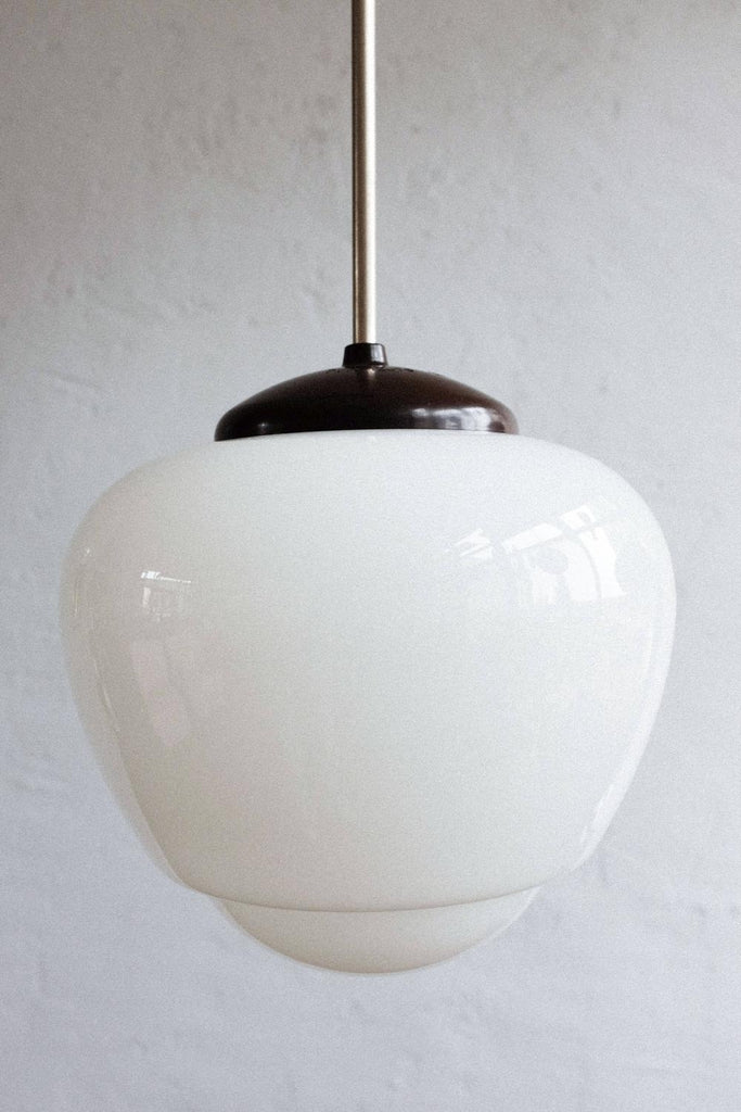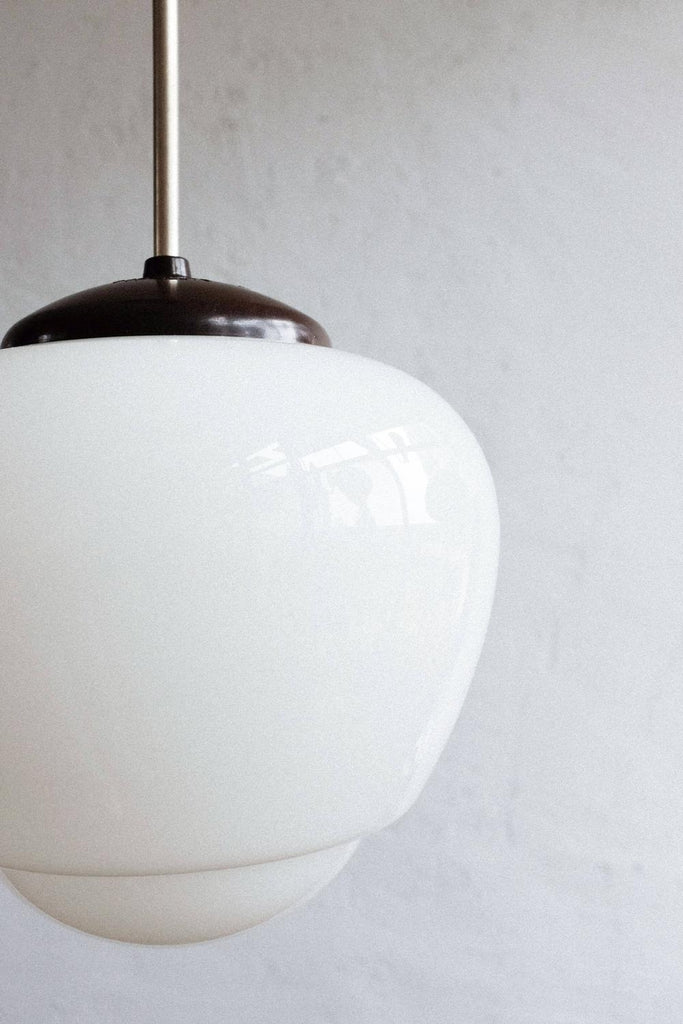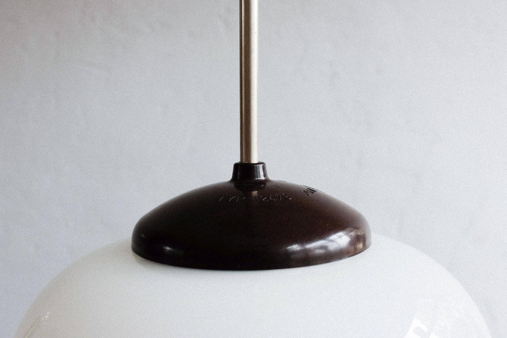 60년대 체코슬로바키아에서 만든 베이클라이트 행잉 램프,. 전등갓은 우유 유리로 만들어져 따뜻한 확산광을 제공합니다. 이러한 유형의 램프는 체코슬로바키아 학교에서 잘 알려져 있습니다. 전기 기술자가 복원하고 점검한 훌륭한 빈티지 상태입니다.
