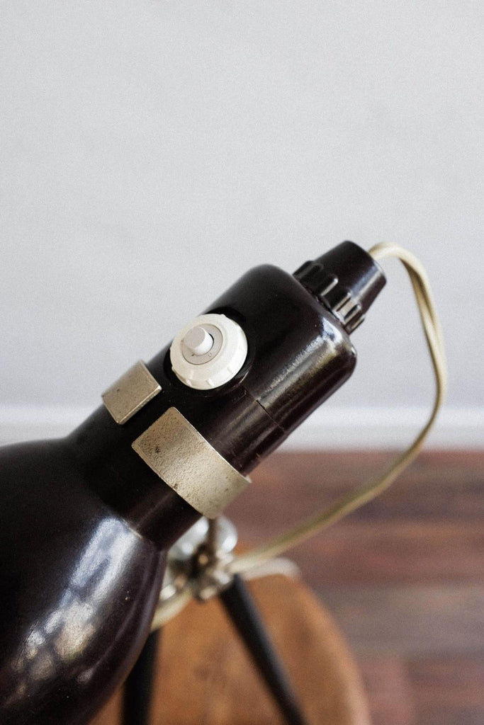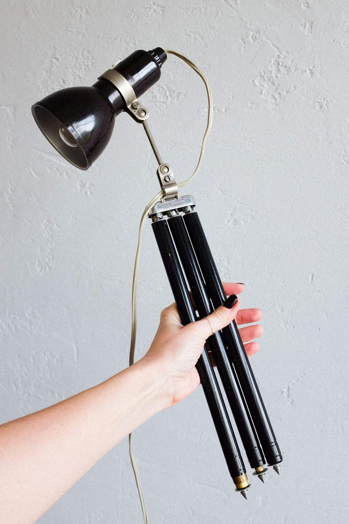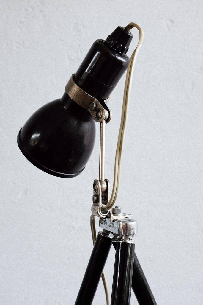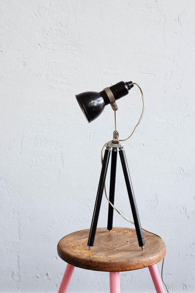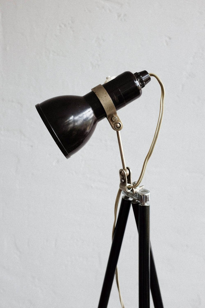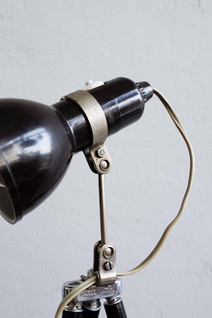 빈티지 사진 삼각대와 작은 베이클라이트 램프로 만든 빈티지 조절식 멥타 삼각대 플로어 램프. 확장 가능한 다리 덕분에 램프의 높이를 조절할 수 있습니다. 베이클라이트 램프 자체도 조절 가능하며 빛이 다른 방향을 향하게 할 수 있습니다. 다리를 완전히 눌렀을 때 테이블 램프로도 사용할 수 있습니다. 그것은 완전히 복원되고 다시 배선되었습니다.