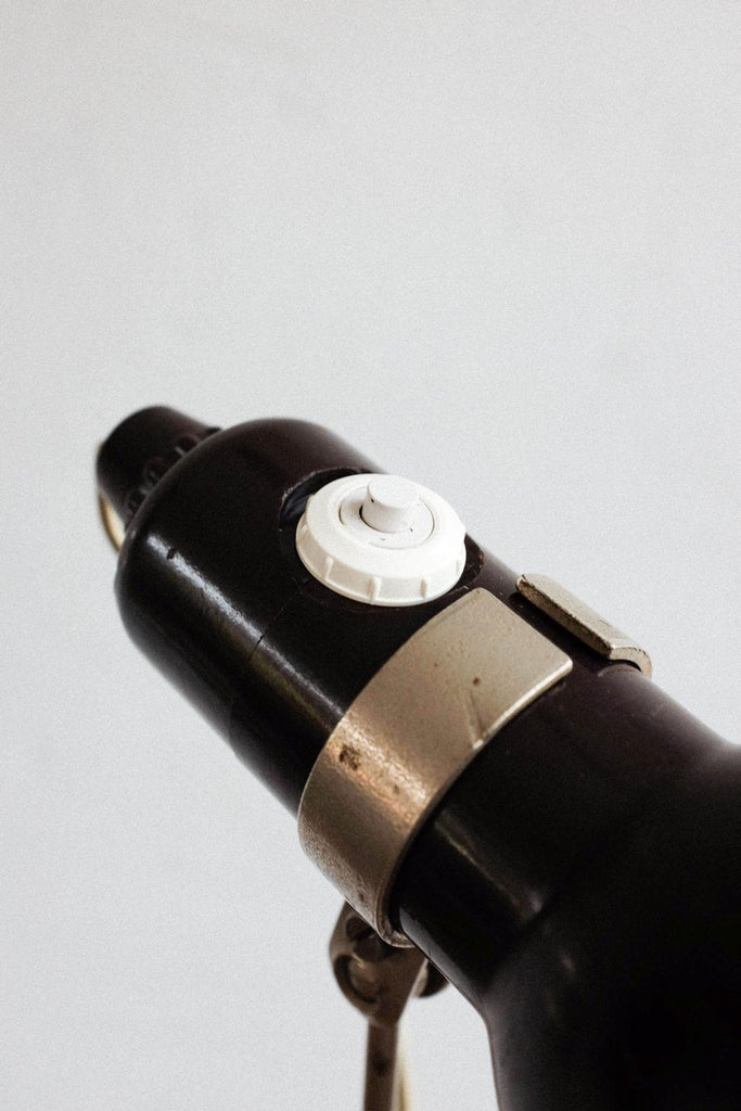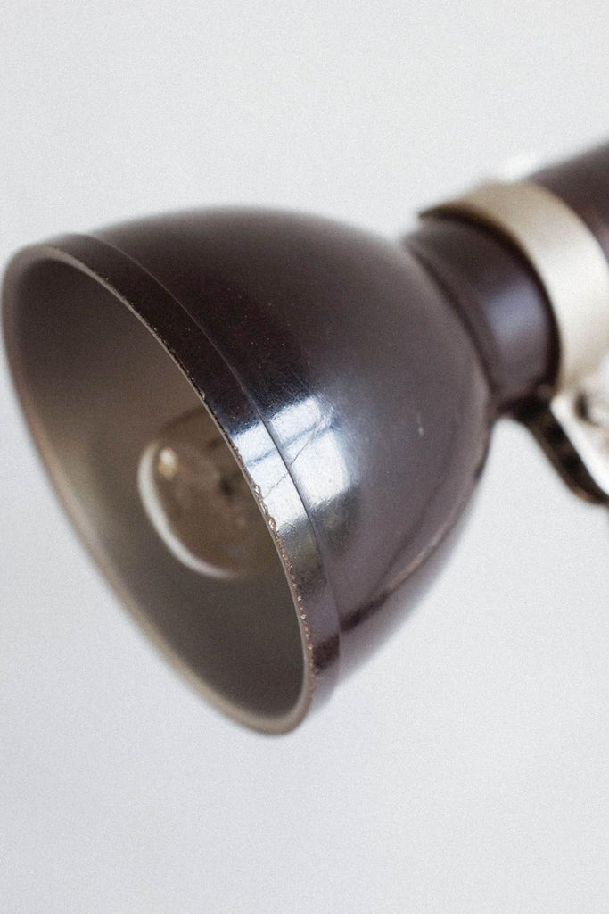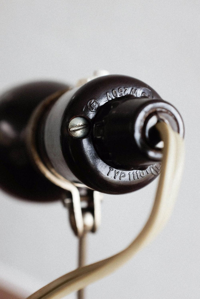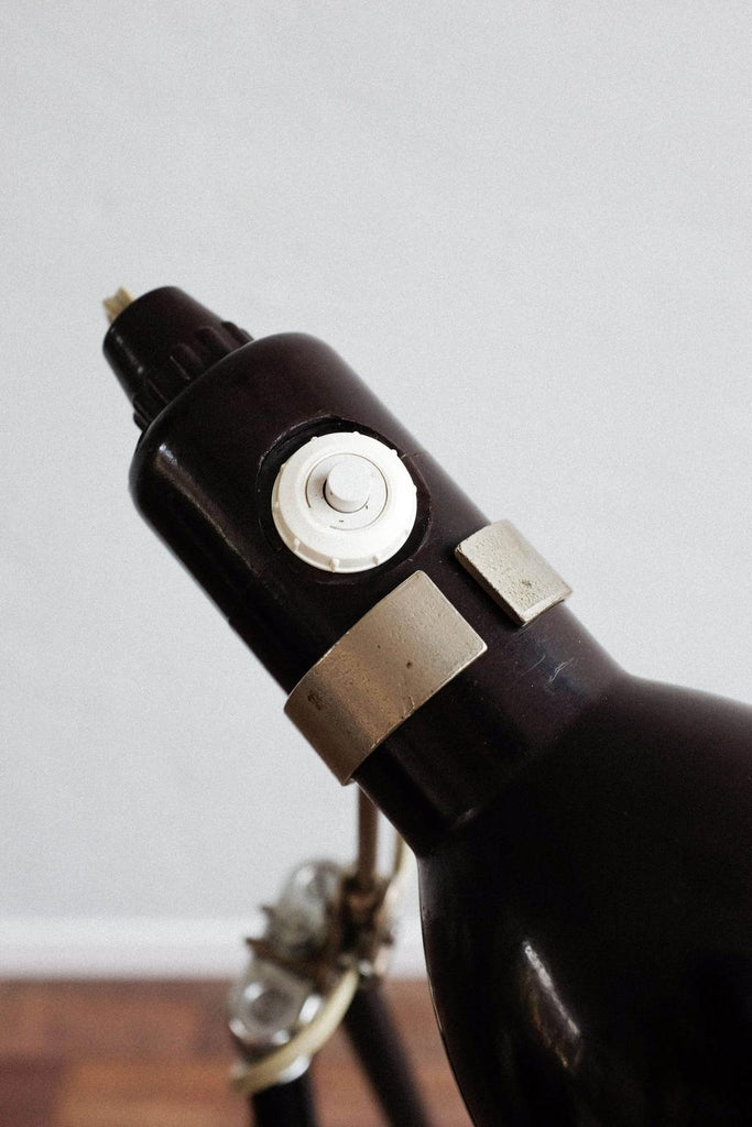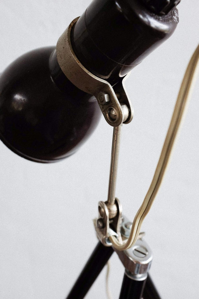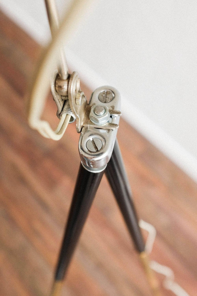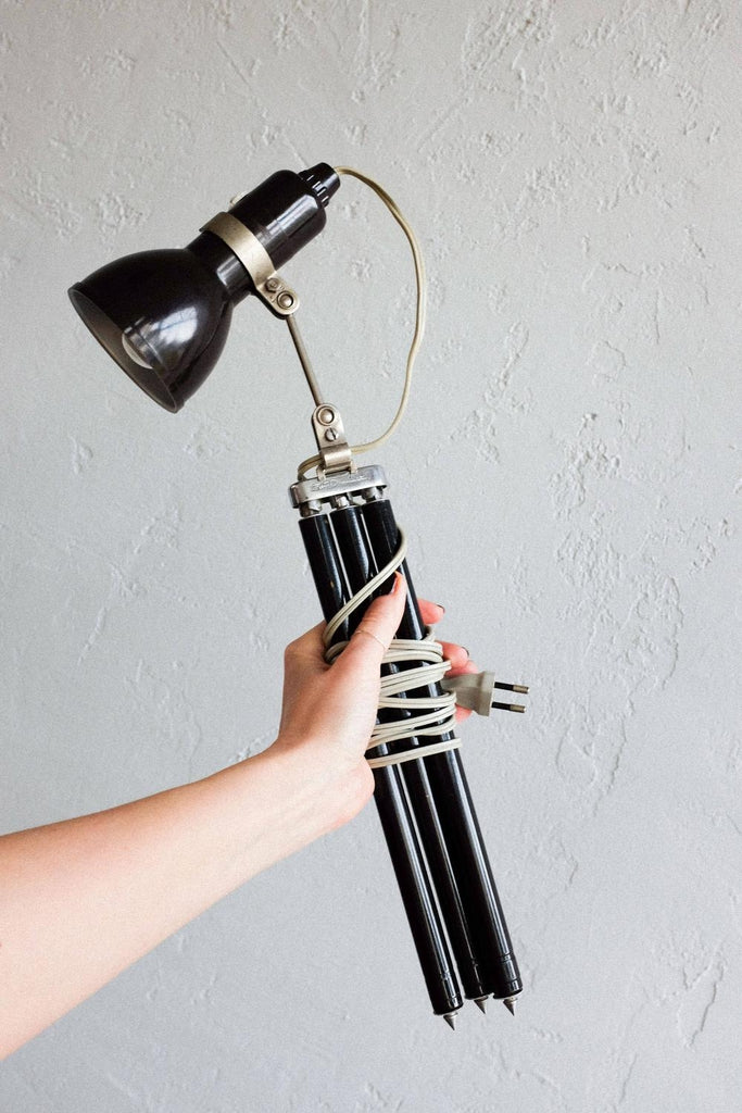 빈티지 사진 삼각대와 작은 베이클라이트 램프로 만든 빈티지 조절식 멥타 삼각대 플로어 램프. 확장 가능한 다리 덕분에 램프의 높이를 조절할 수 있습니다. 베이클라이트 램프 자체도 조절 가능하며 빛이 다른 방향을 향하게 할 수 있습니다. 다리를 완전히 눌렀을 때 테이블 램프로도 사용할 수 있습니다. 그것은 완전히 복원되고 다시 배선되었습니다.