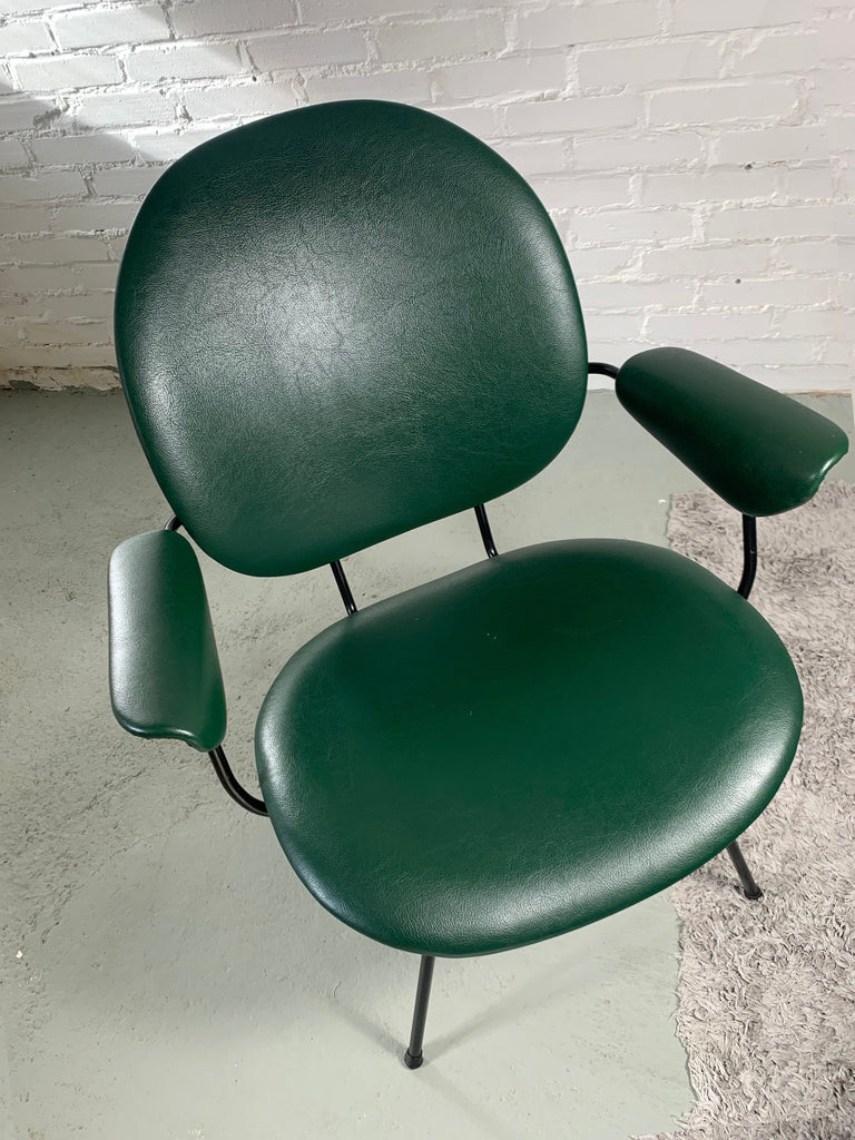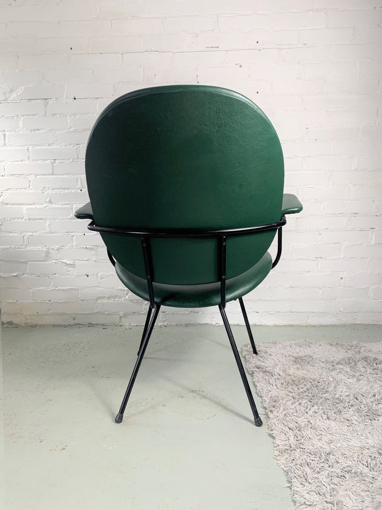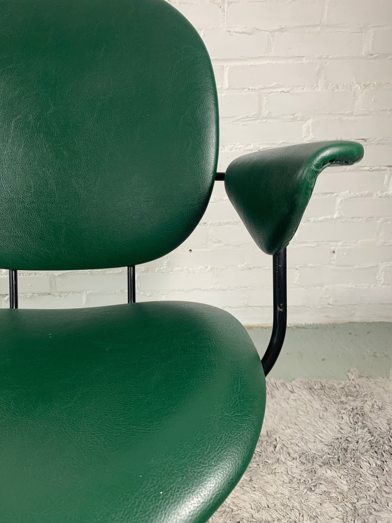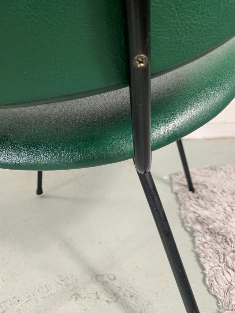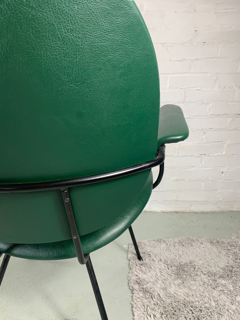 의자는 관형 금속 프레임이 특징이며 녹색 비닐 덮개가 있습니다.