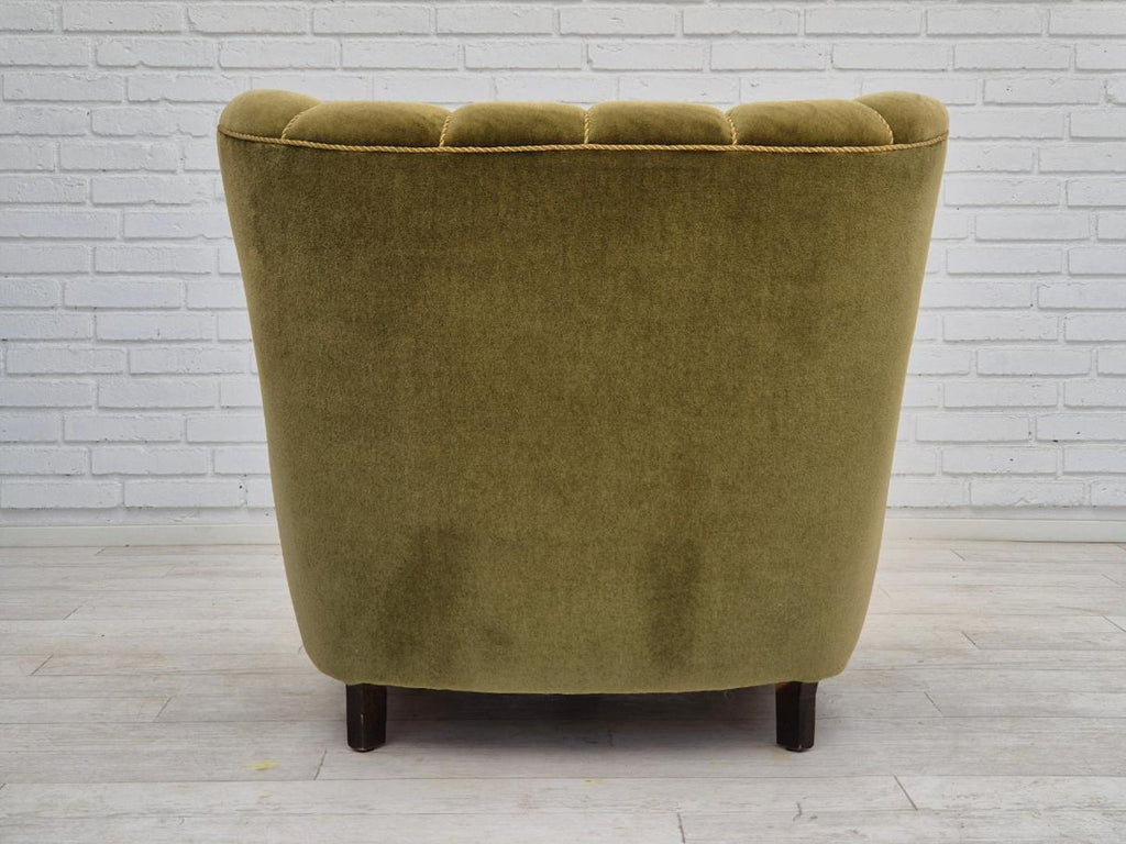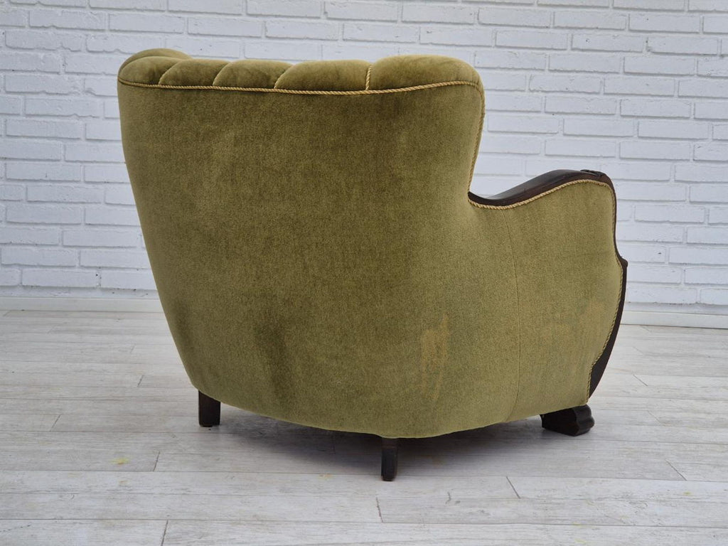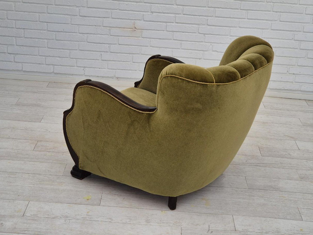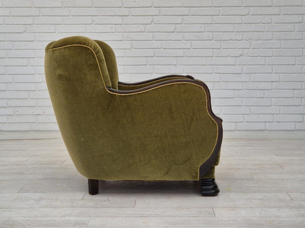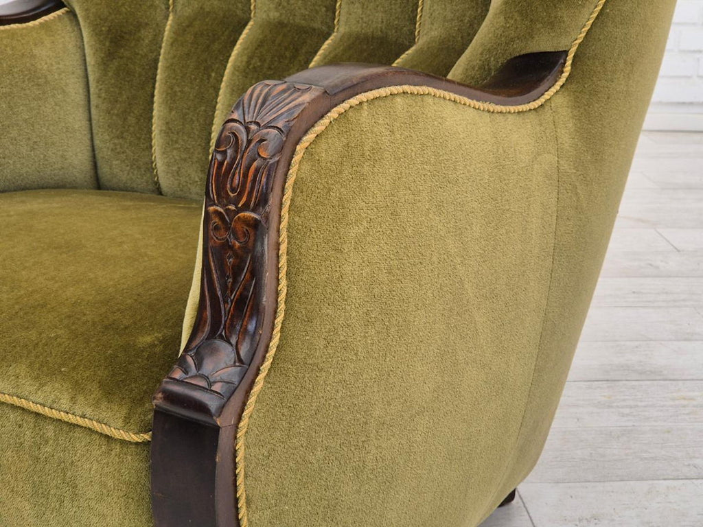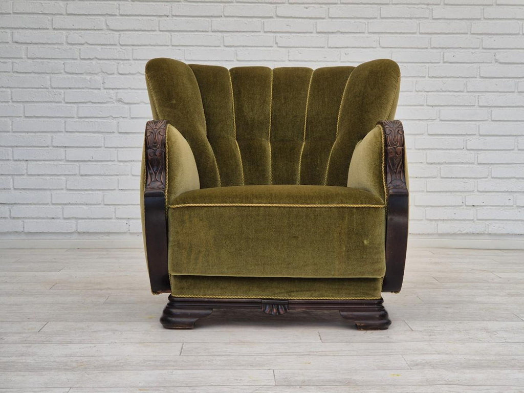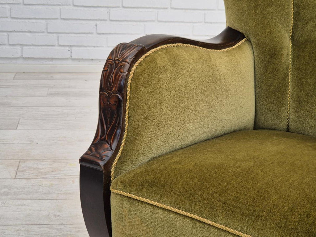 1950년대, 덴마크산 수제 안락의자, 원본 상태가 매우 양호함: 냄새도 얼룩도 없습니다. 오리지널 그린 가구 벨루어, 오크재. 좌석에 황동 스프링이 있습니다. 1955~60년대 덴마크 가구 제조사가 제조한 제품입니다.