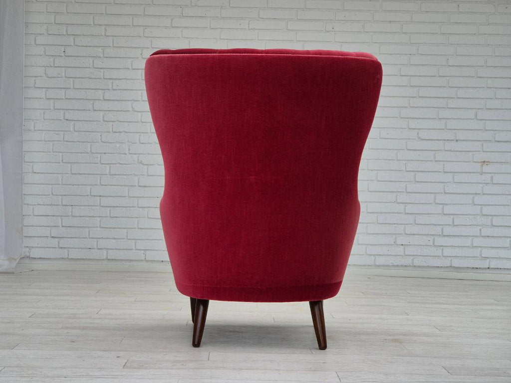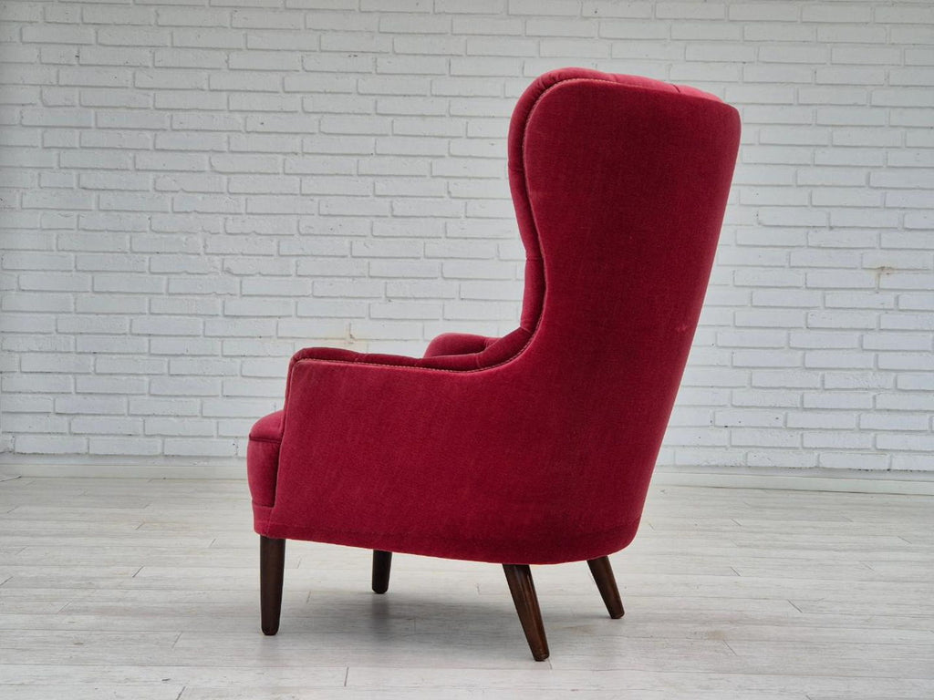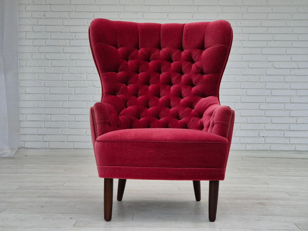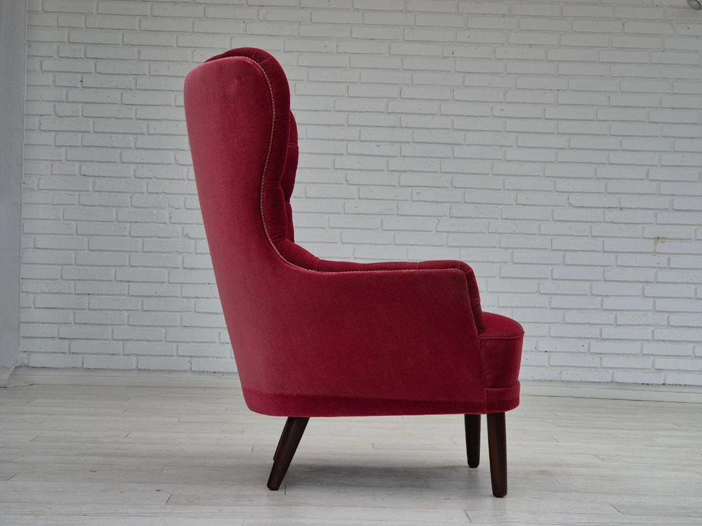 1960년대, 원래 상태가 좋은 스칸디나비아 하이백 안락의자: 냄새도 얼룩도 없습니다. 오리지널 체리 레드 가구 벨루어. 좌석의 황동 스프링, 너도밤나무 다리. 1960년대 덴마크 또는 스웨덴 가구 제조업체에서 제조되었습니다.