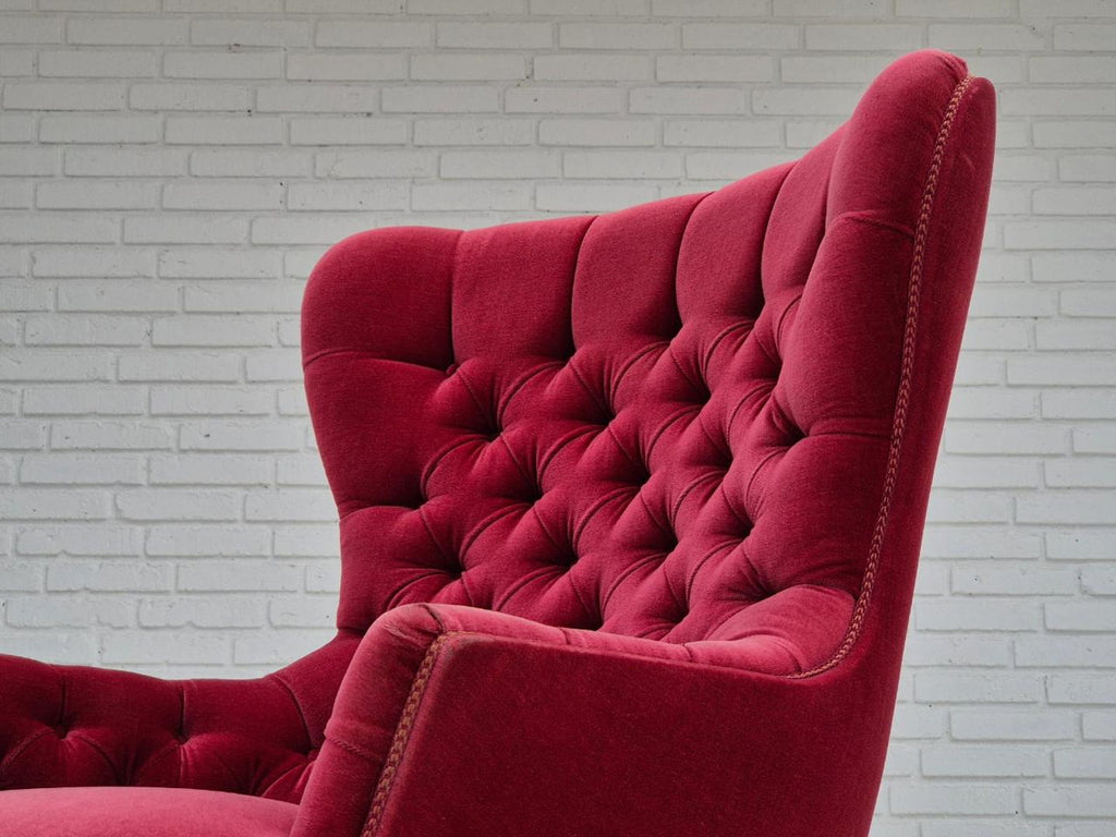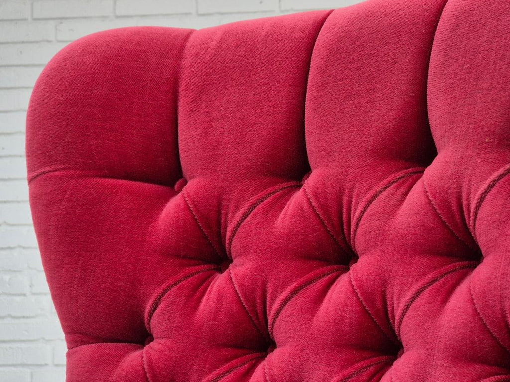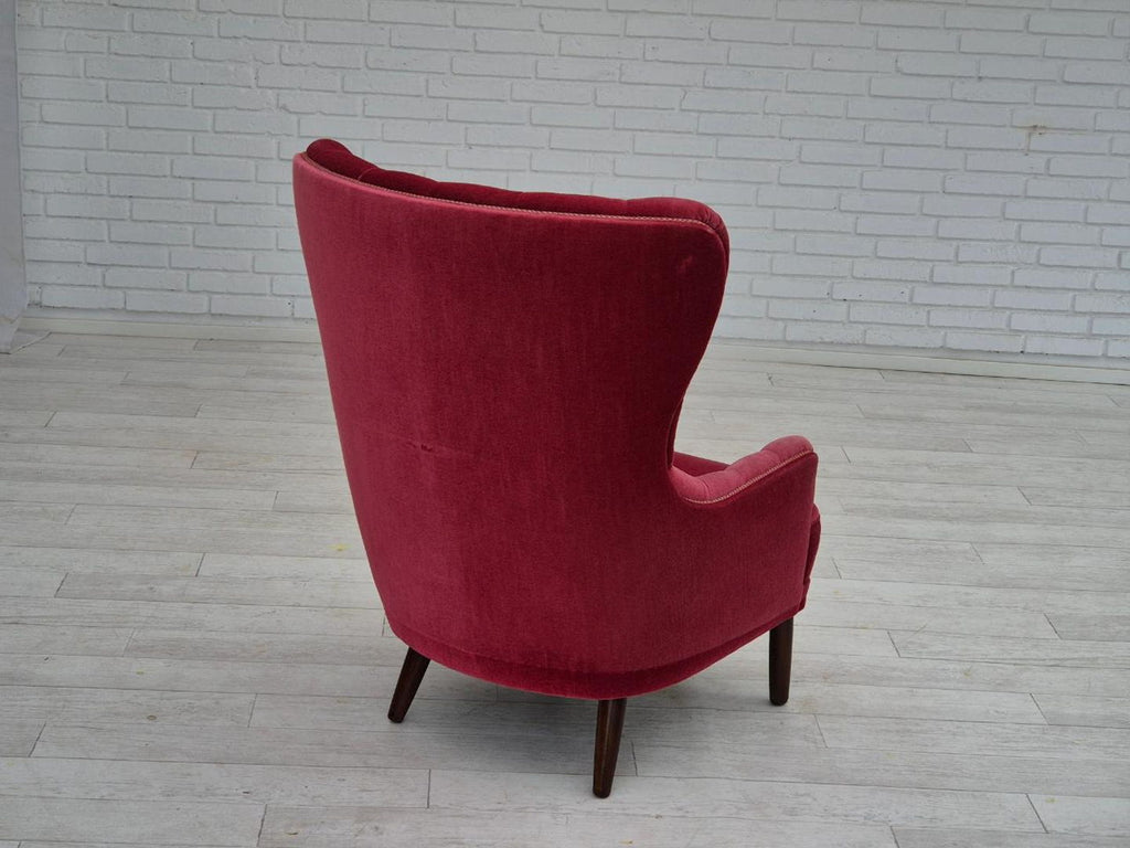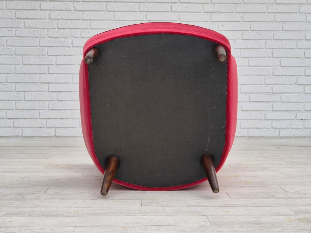 1960년대, 원래 상태가 좋은 스칸디나비아 하이백 안락의자: 냄새도 얼룩도 없습니다. 오리지널 체리 레드 가구 벨루어. 좌석의 황동 스프링, 너도밤나무 다리. 1960년대 덴마크 또는 스웨덴 가구 제조업체에서 제조되었습니다.