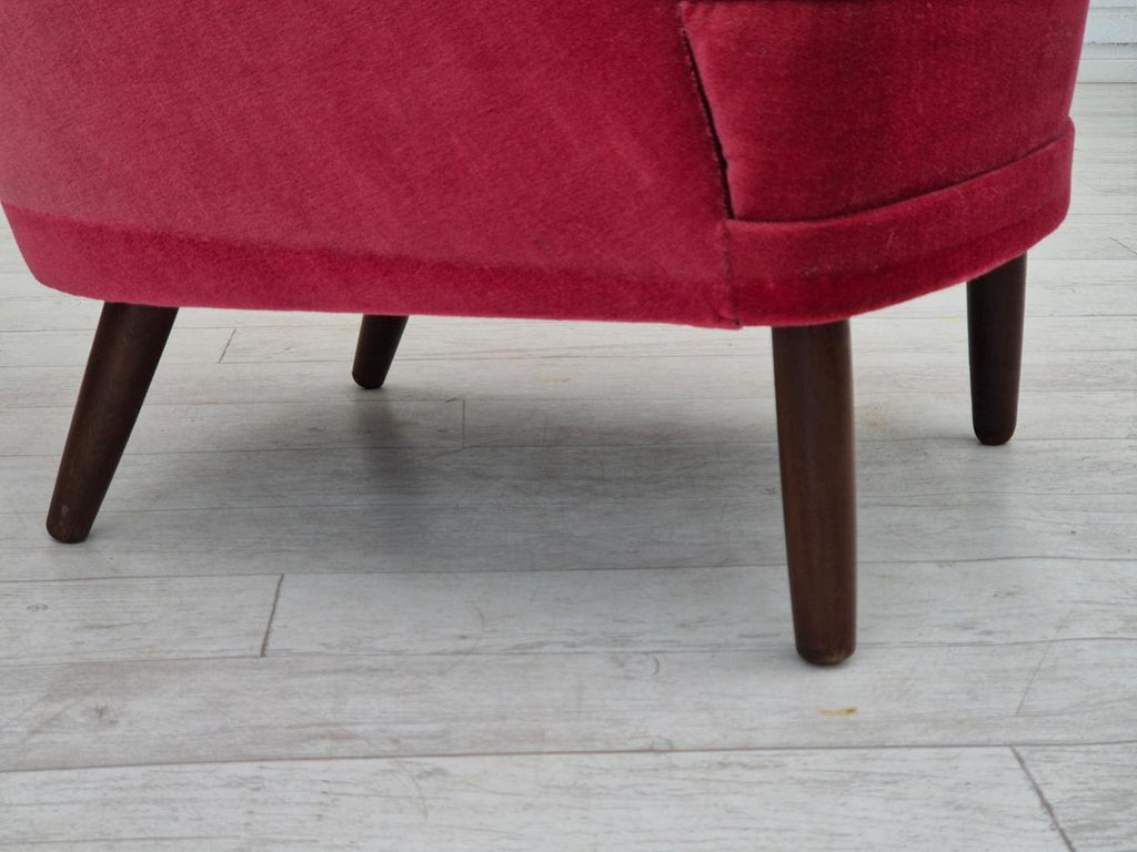 1960s, Scandinavian highback armchair in original good condition: no smells and no stains. Original cherry red furniture velour. Brass springs in the seat, beech wood legs. Manufactured by Danish or Swedish furniture maker in about 1960s.