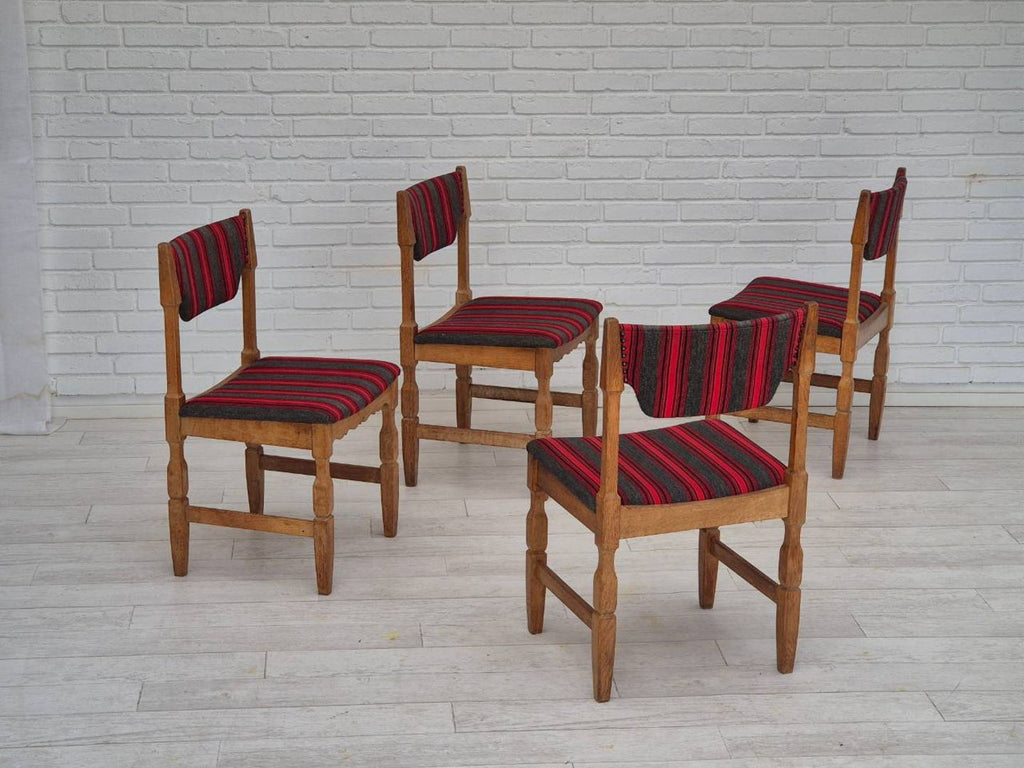 1970s, Danish design by Henning Kjærnulf. Set of 4 chairs in original good condition: no smells and no stains. Original furniture wool, solid oak wood. Manufactured by Danish furniture maker EG Kvalitetsmøbler in about 1970s.