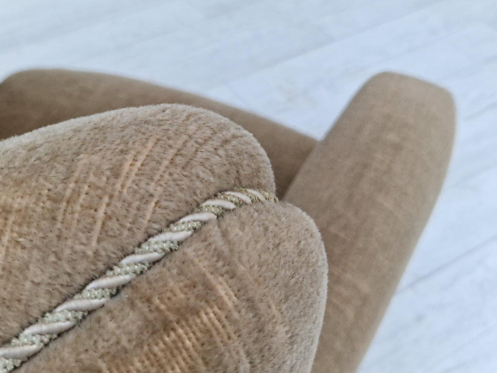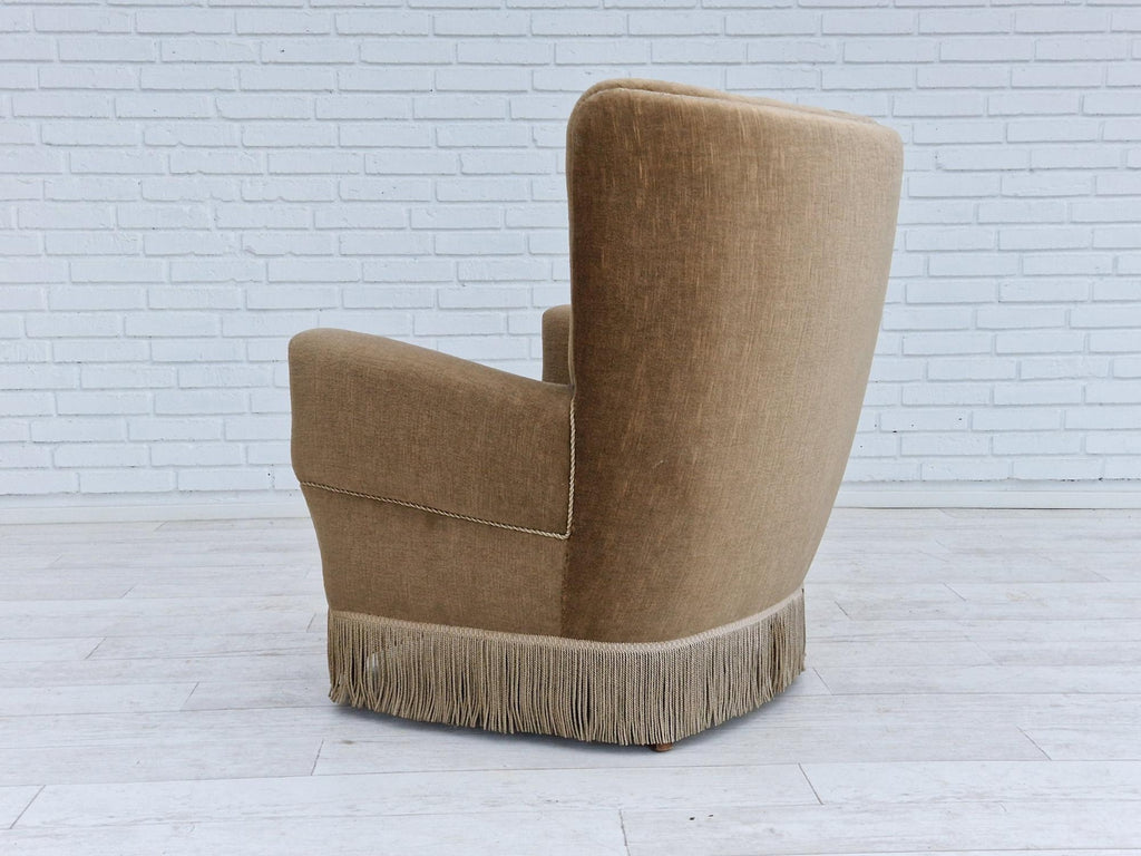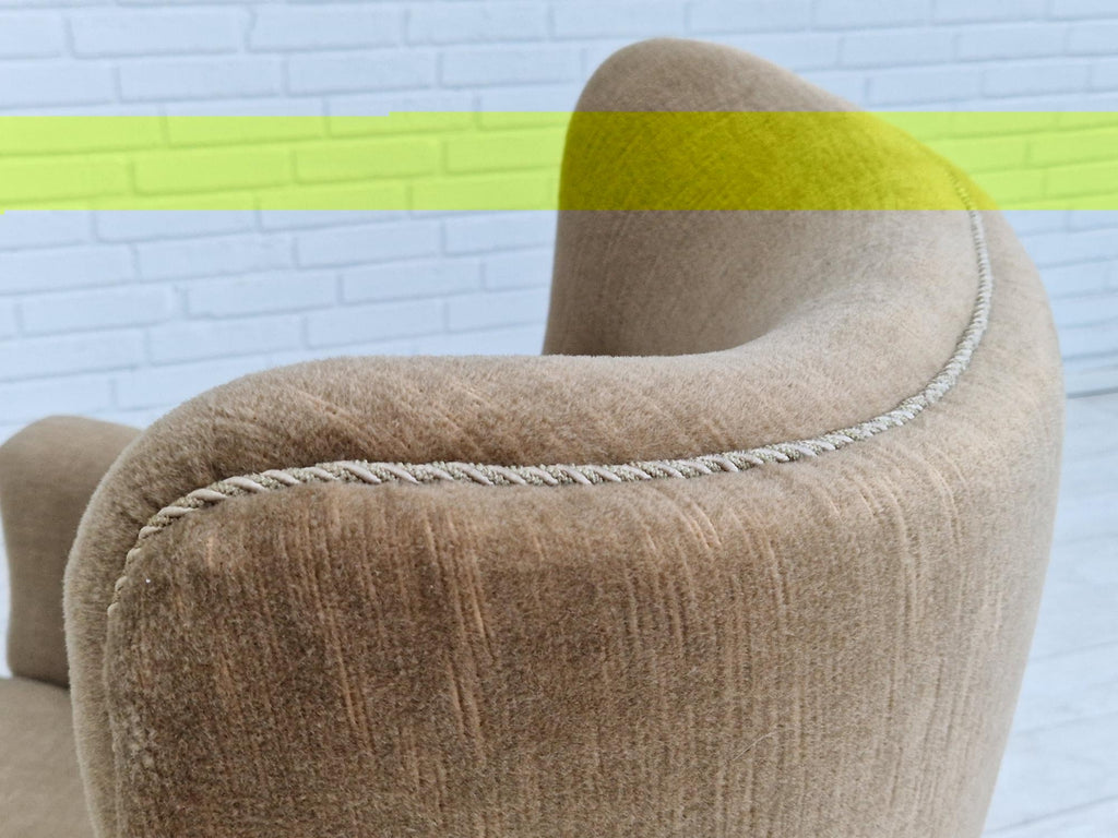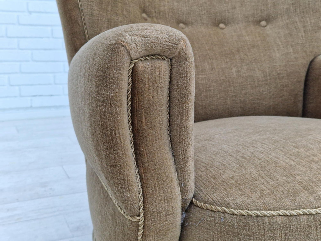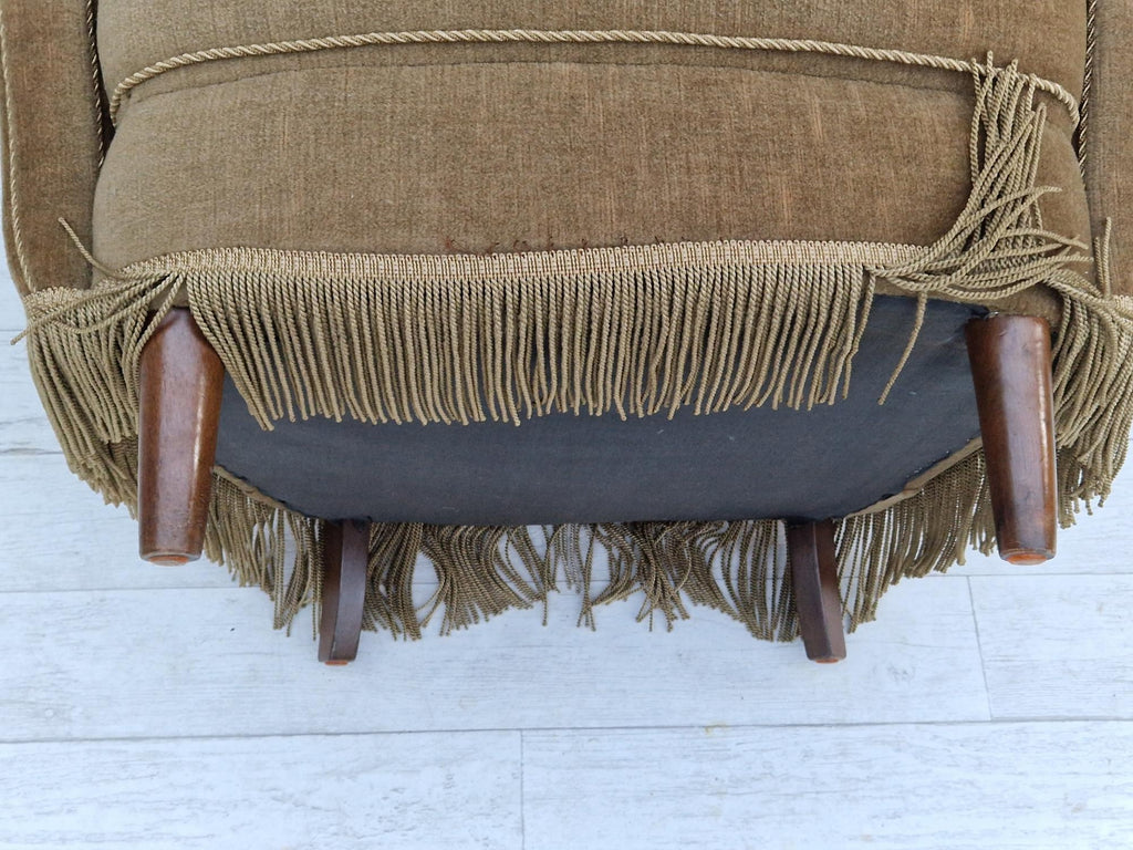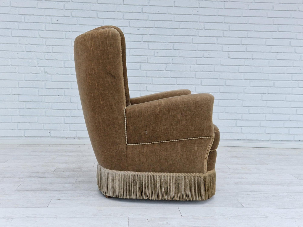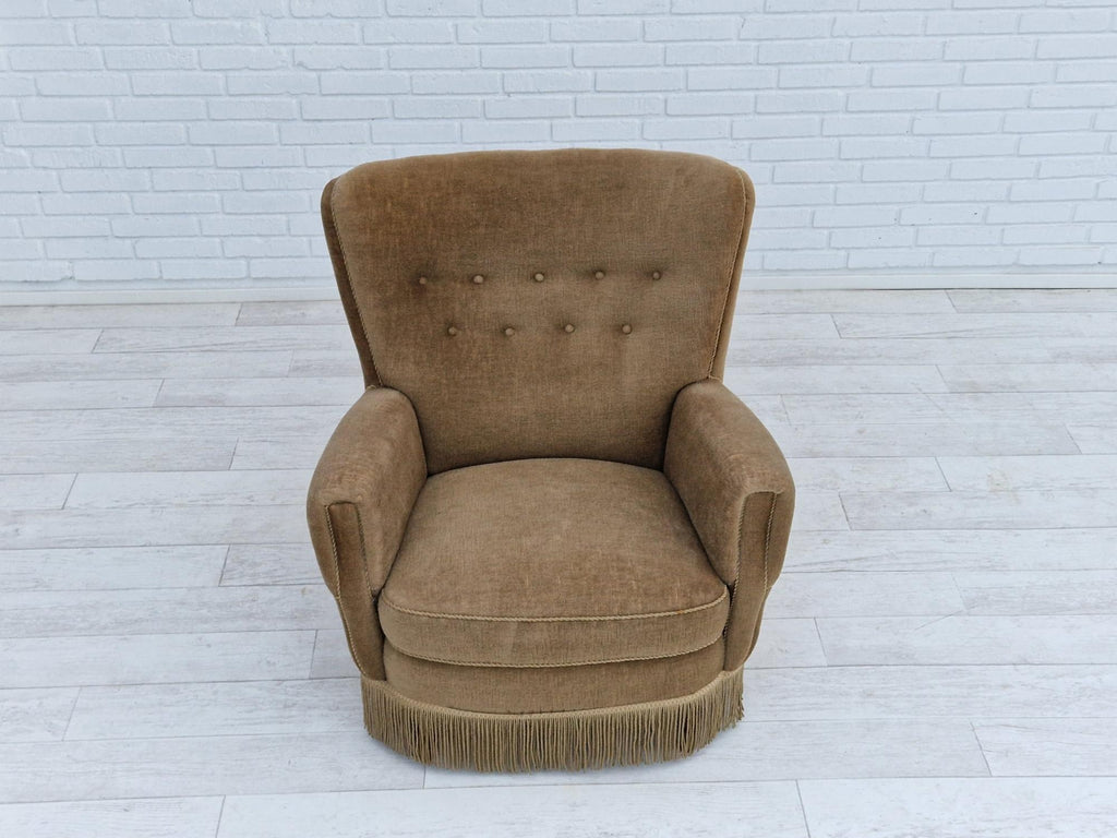 1970년대 덴마크 라운지 체어. 연한 녹색 벨루어 소재의 오리지널 커버, 매우 좋은 상태. 너도밤나무 다리, 좌석 스프링. 냄새가 없습니다. 아주 편안한. 1970년경 덴마크 가구 제조업체에서 제작했습니다.