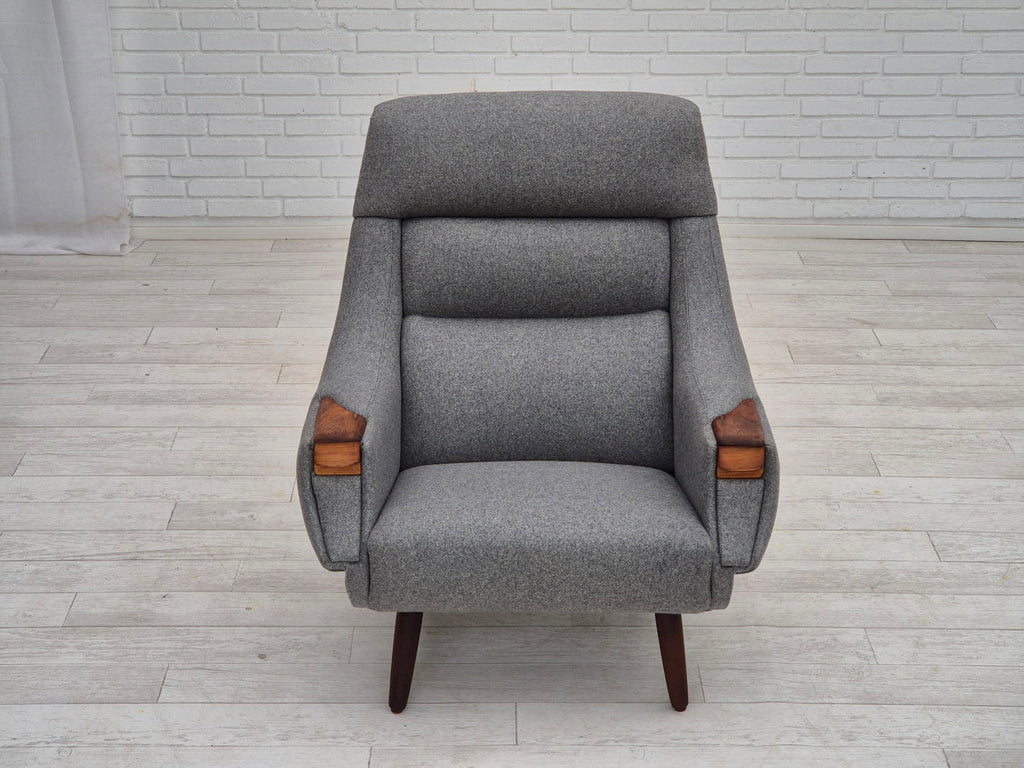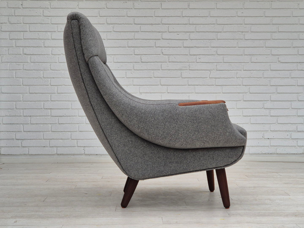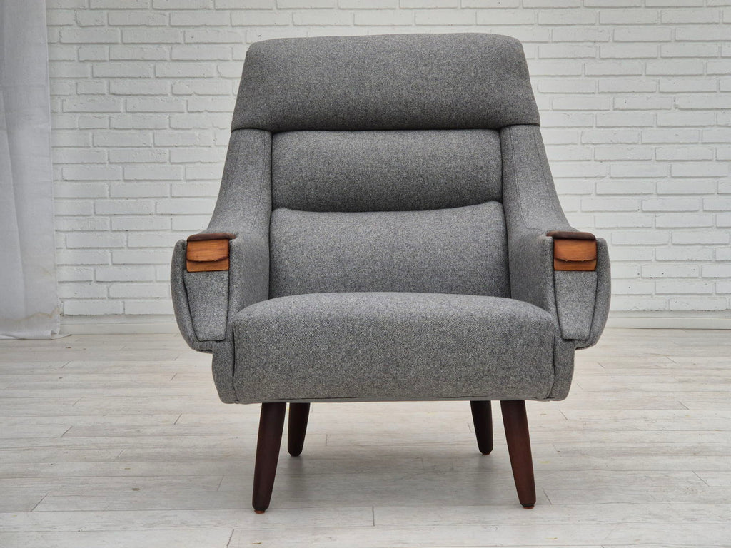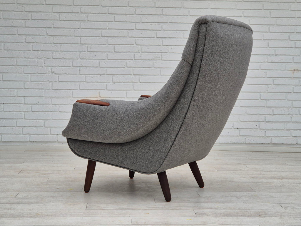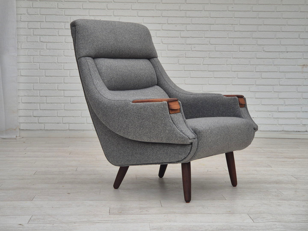 1970년대, HWKlein의 덴마크 디자인. 고품질 Nevotex 가구 울 "Margrethe 13 Stone"으로 완전히 개조 및 덮개를 씌운 리클라이너. 새로운 실내 장식품. 새로워진 티크 다리, 로즈우드 못, 재떨이. 시트의 원래 스프링은 그대로 유지됩니다. 덴마크 가구 제조사 Bramin Møbler가 제작한 제품입니다. 1970. Retro Møbler Galleri에서 전문 가구 장식가이자 장인이 개조 및 재포장했습니다. 원래 디자인에 따른 리노베이션.