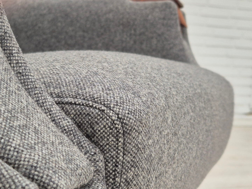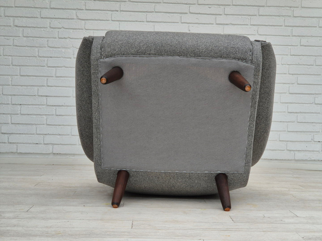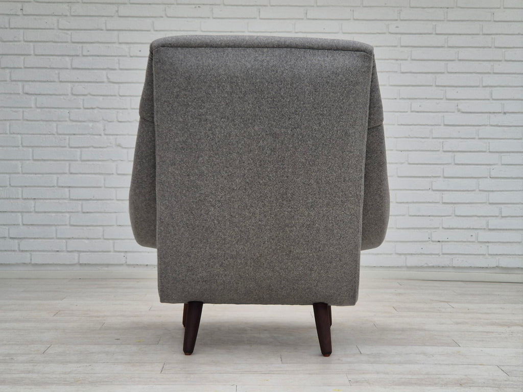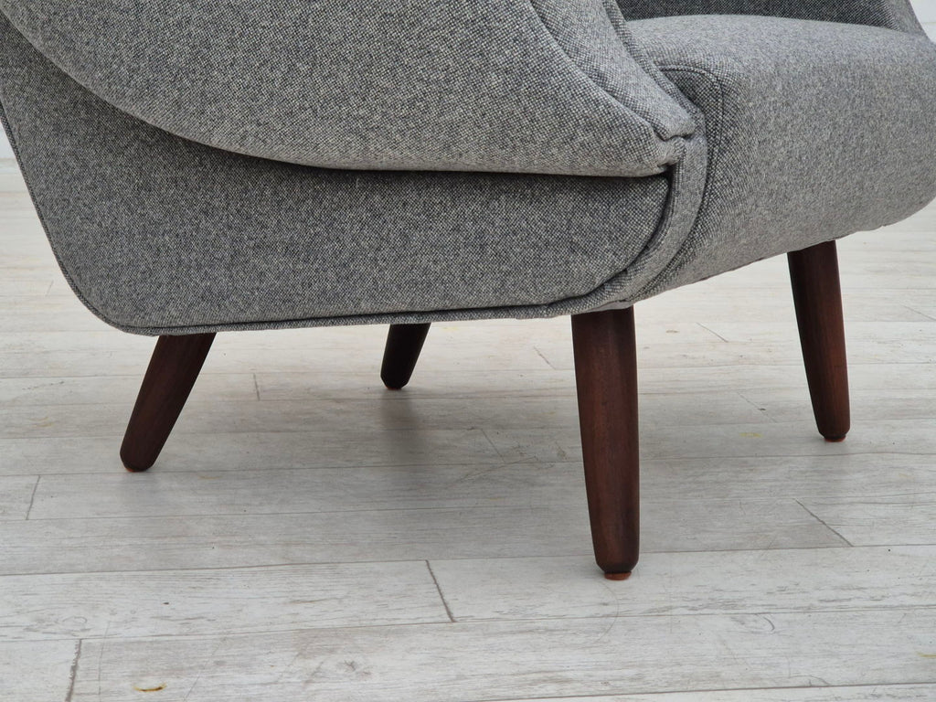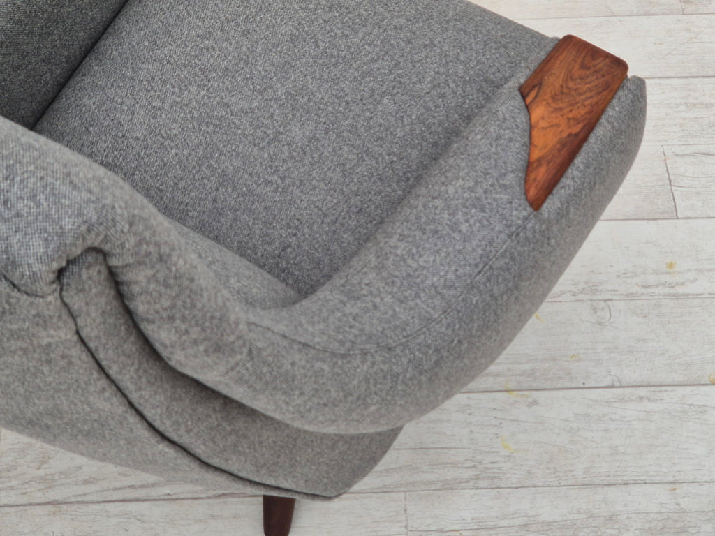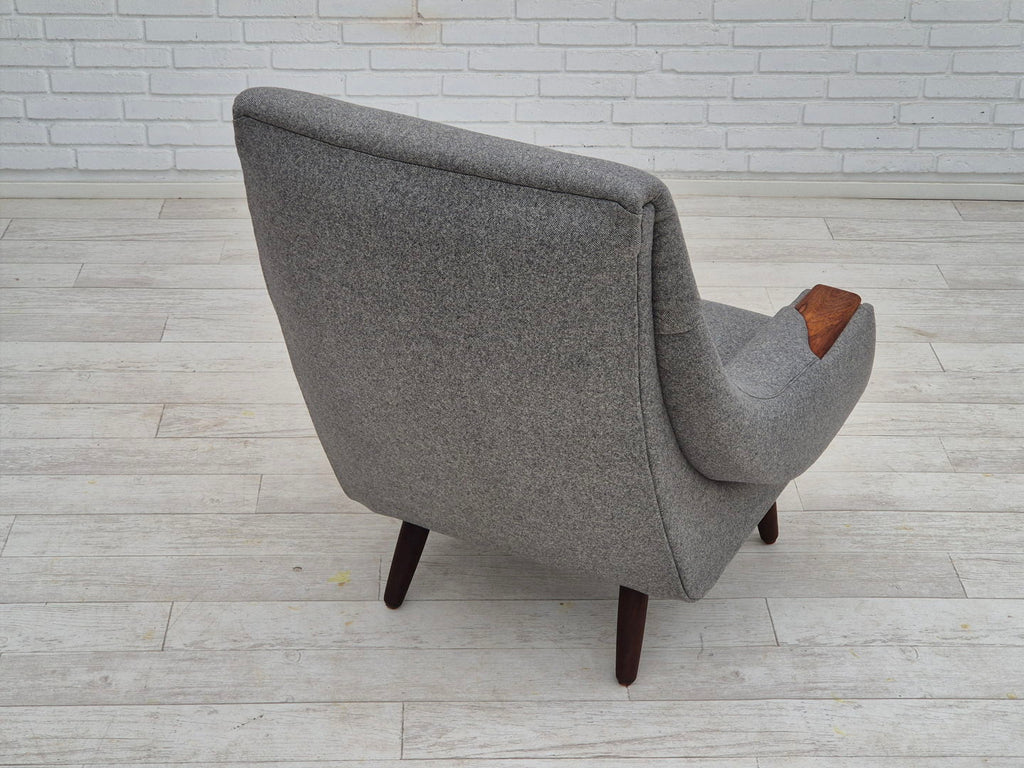 1970년대, HWKlein의 덴마크 디자인. 고품질 Nevotex 가구 울 "Margrethe 13 Stone"으로 완전히 개조 및 덮개를 씌운 리클라이너. 새로운 실내 장식품. 새로워진 티크 다리, 로즈우드 못, 재떨이. 시트의 원래 스프링은 그대로 유지됩니다. 덴마크 가구 제조사 Bramin Møbler가 제작한 제품입니다. 1970. Retro Møbler Galleri에서 전문 가구 장식가이자 장인이 개조 및 재포장했습니다. 원래 디자인에 따른 리노베이션.