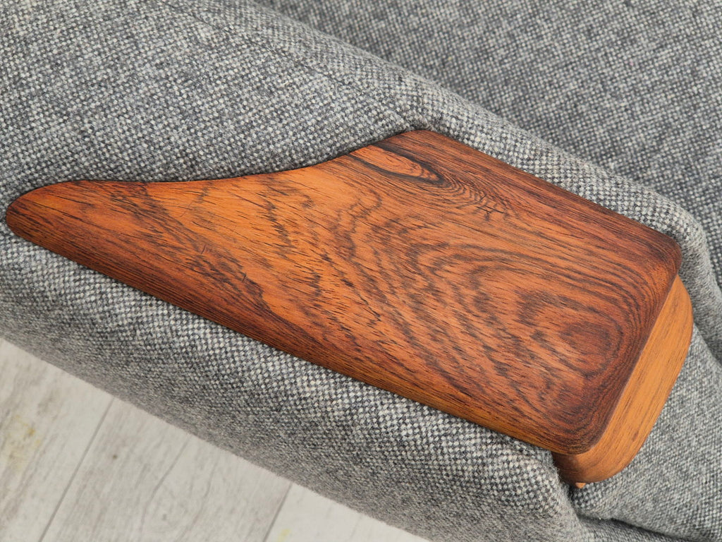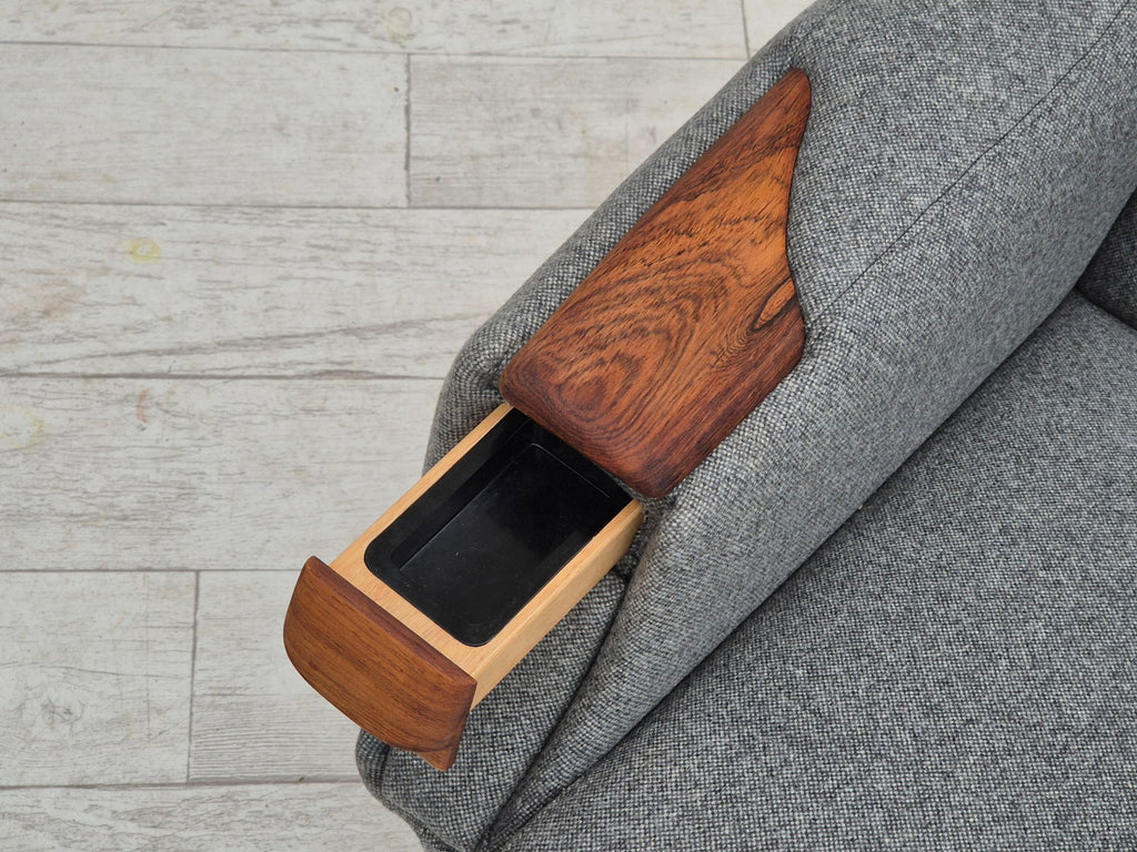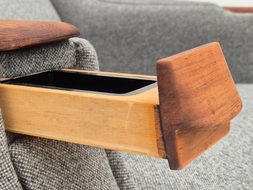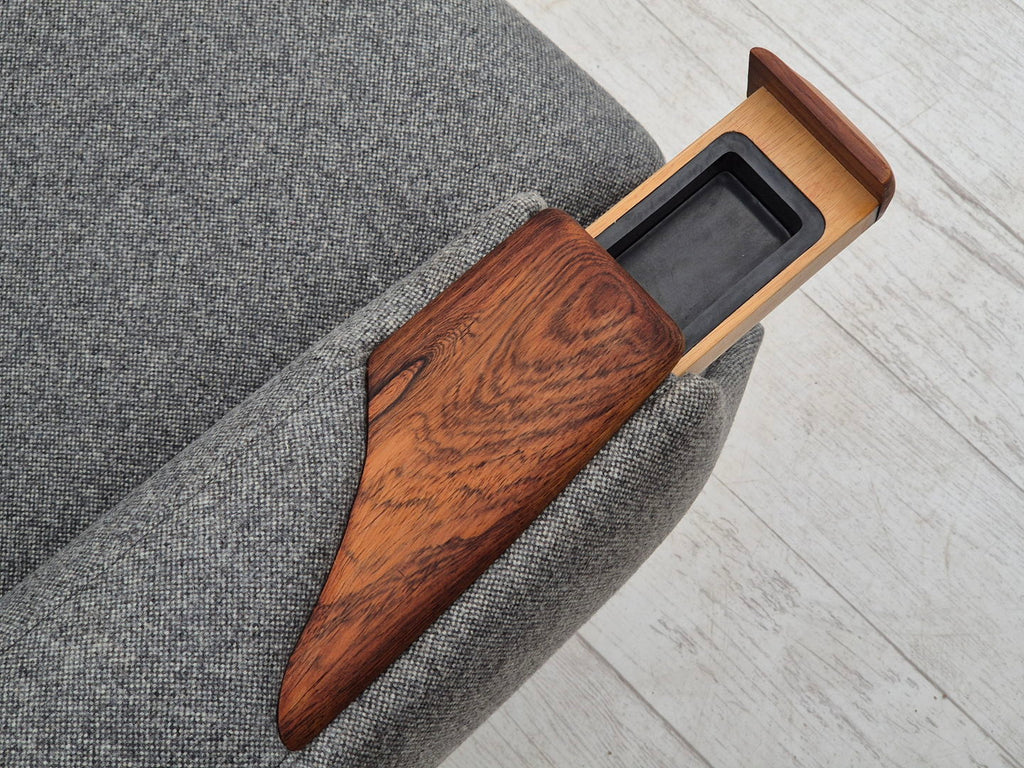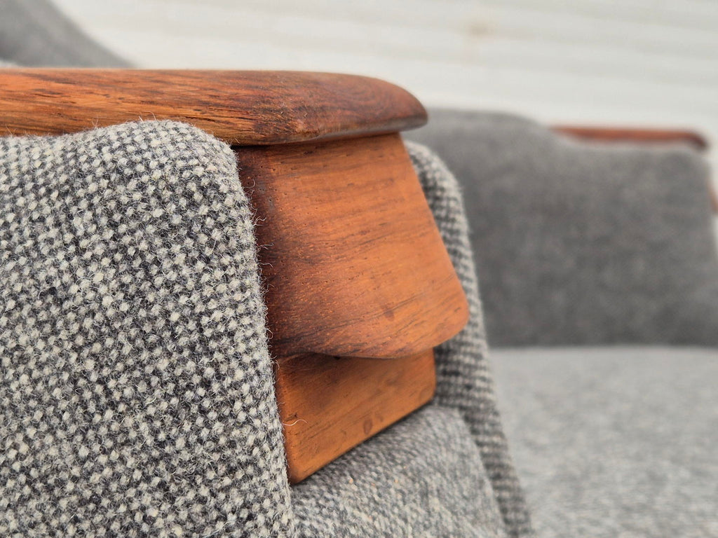 1970년대, HWKlein의 덴마크 디자인. 고품질 Nevotex 가구 울 "Margrethe 13 Stone"으로 완전히 개조 및 덮개를 씌운 리클라이너. 새로운 실내 장식품. 새로워진 티크 다리, 로즈우드 못, 재떨이. 시트의 원래 스프링은 그대로 유지됩니다. 덴마크 가구 제조사 Bramin Møbler가 제작한 제품입니다. 1970. Retro Møbler Galleri에서 전문 가구 장식가이자 장인이 개조 및 재포장했습니다. 원래 디자인에 따른 리노베이션.
