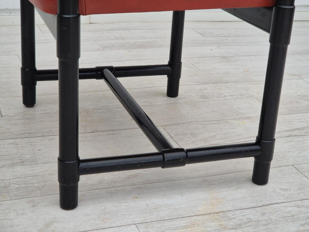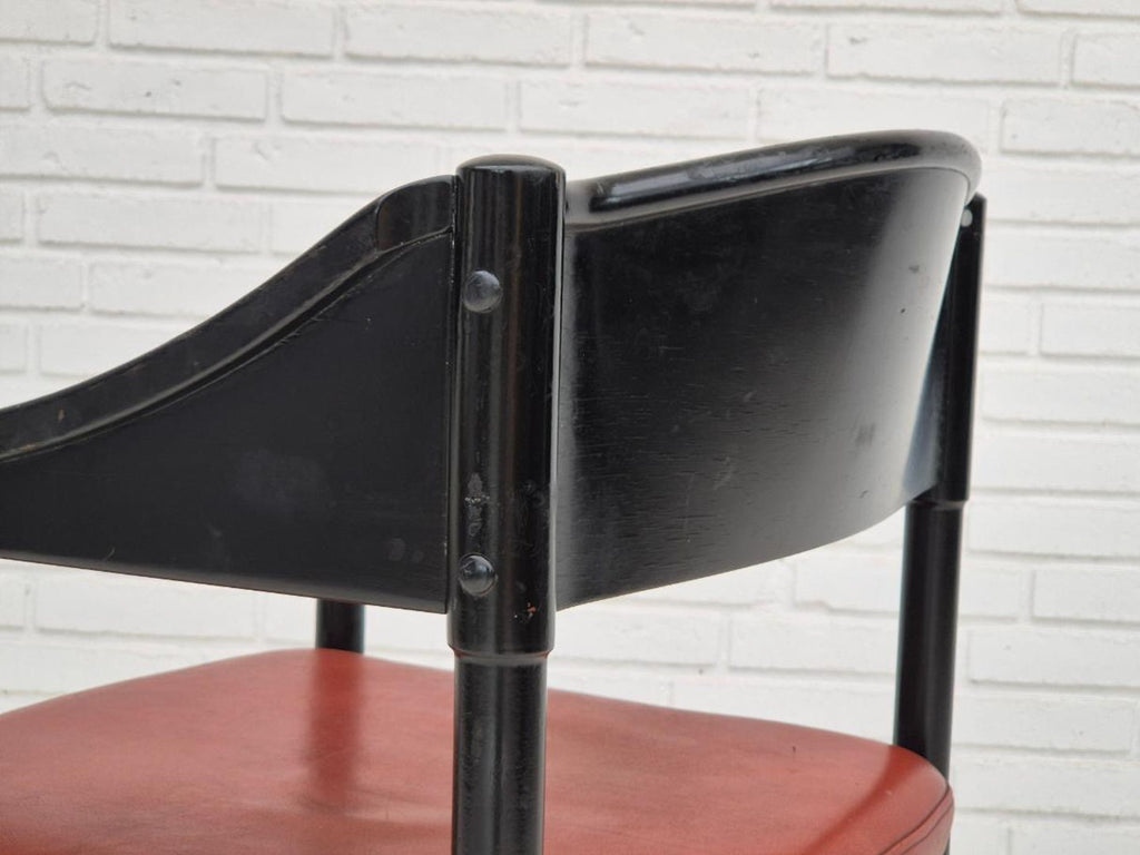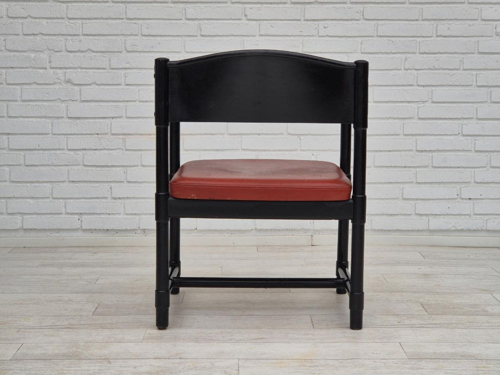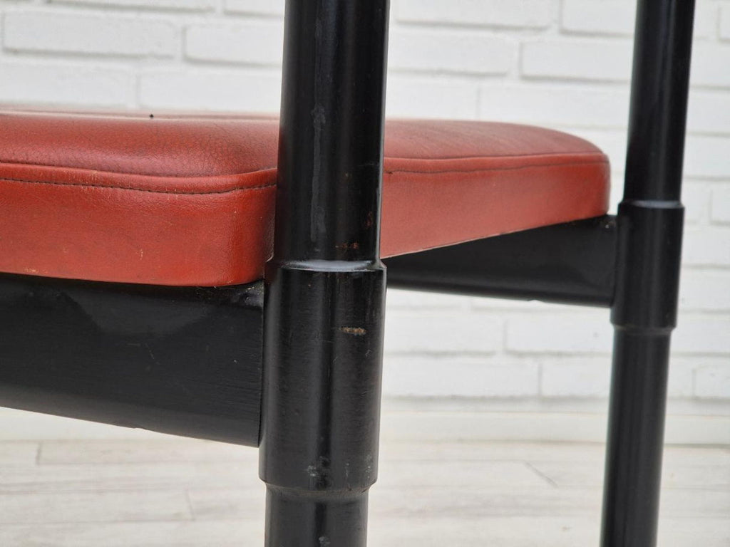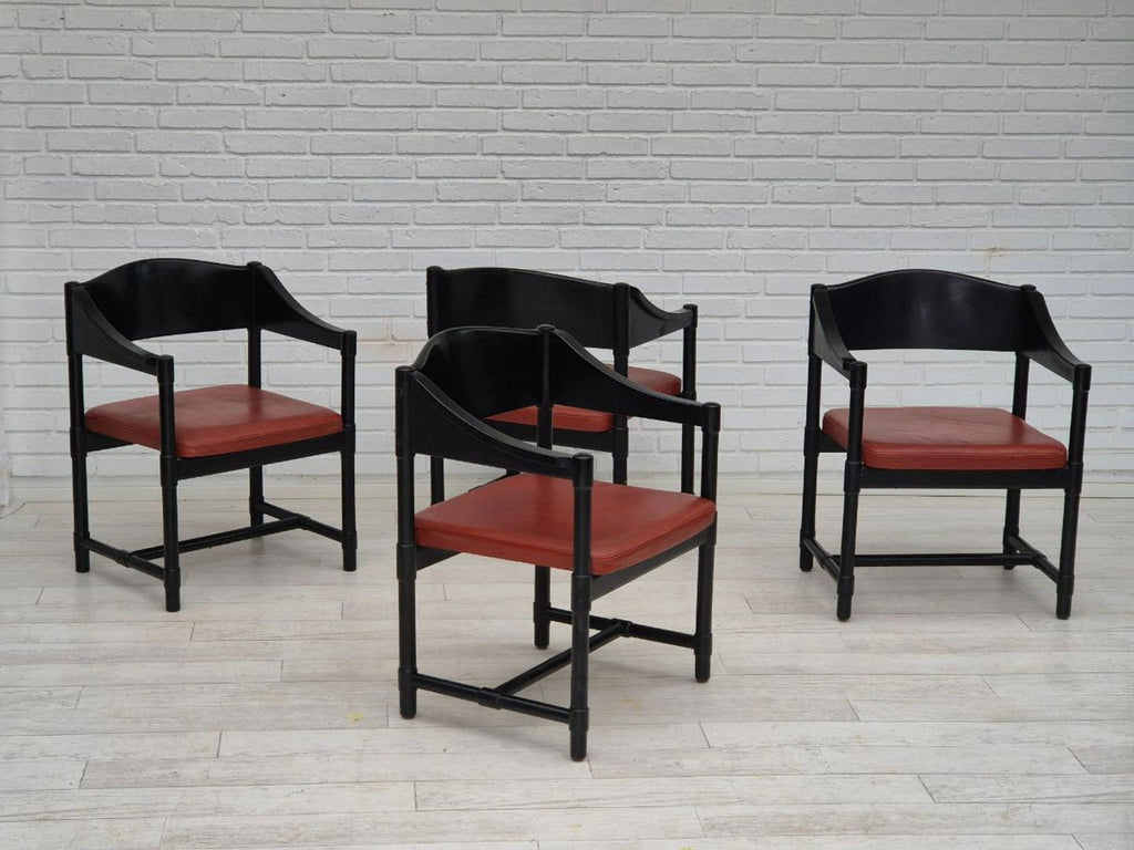 1970년대, 레포칼루스토(Lepokalusto)의 핀란드 디자인. 안락의자 4개 세트입니다. 원래 상태 양호함: 냄새 없음, 얼룩 없음. 블랙 래커 자작나무, 브라운 가죽. 1970~75년대 핀란드 가구 제조사 Lepokalusto가 제조한 제품입니다.