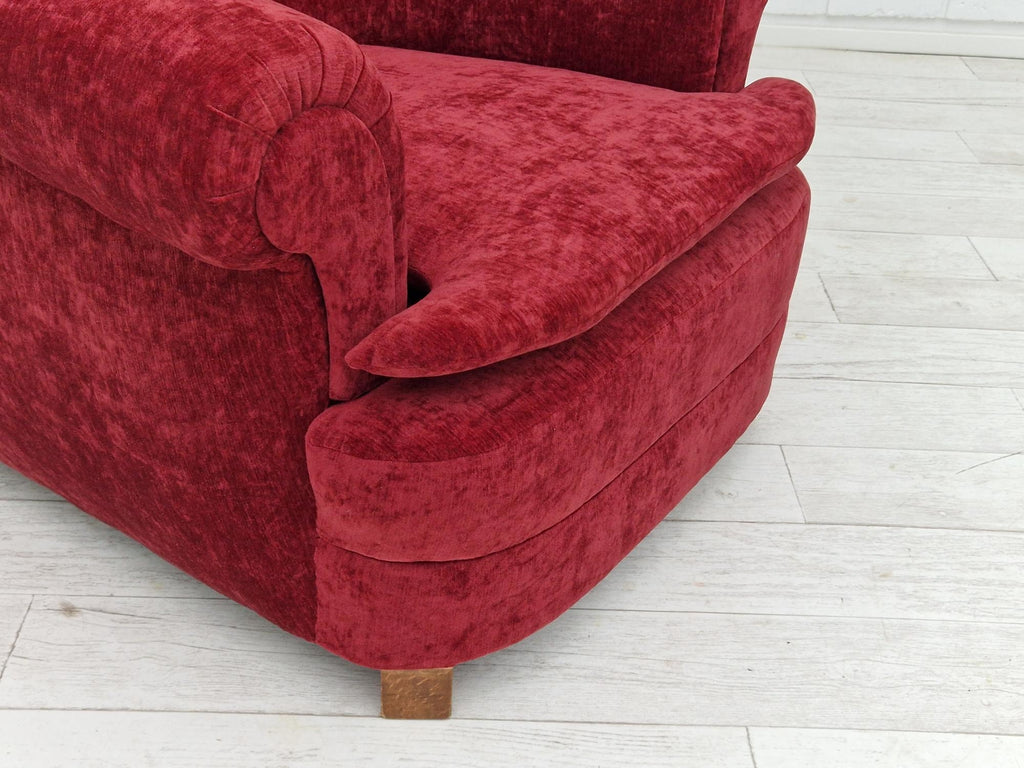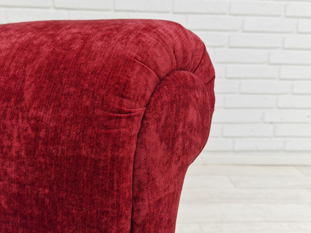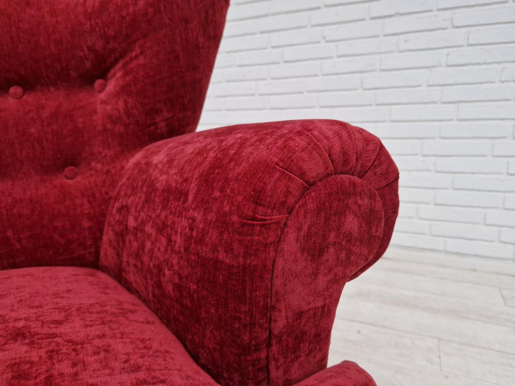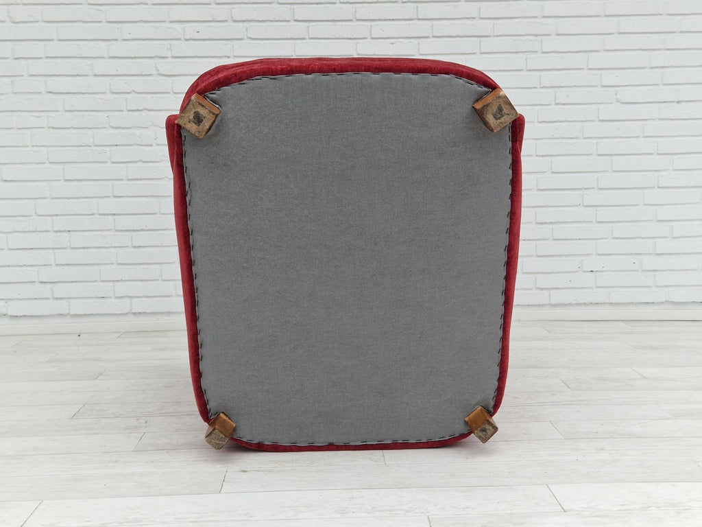 50년대, 단추가 달린 리퍼브 업홀스터드 덴마크 안락의자. 품질 진한 빨간색 빈티지 벨루어. 시트와 등받이의 오리지널 황동 스프링은 그대로 유지됩니다. 새로운 느슨한 좌석 쿠션. 너도밤나무 다리. 1950-55년경에 덴마크 가구 제조업체에서 제조했습니다. 전문 업홀스터러, 장인이 리퍼브했습니다.