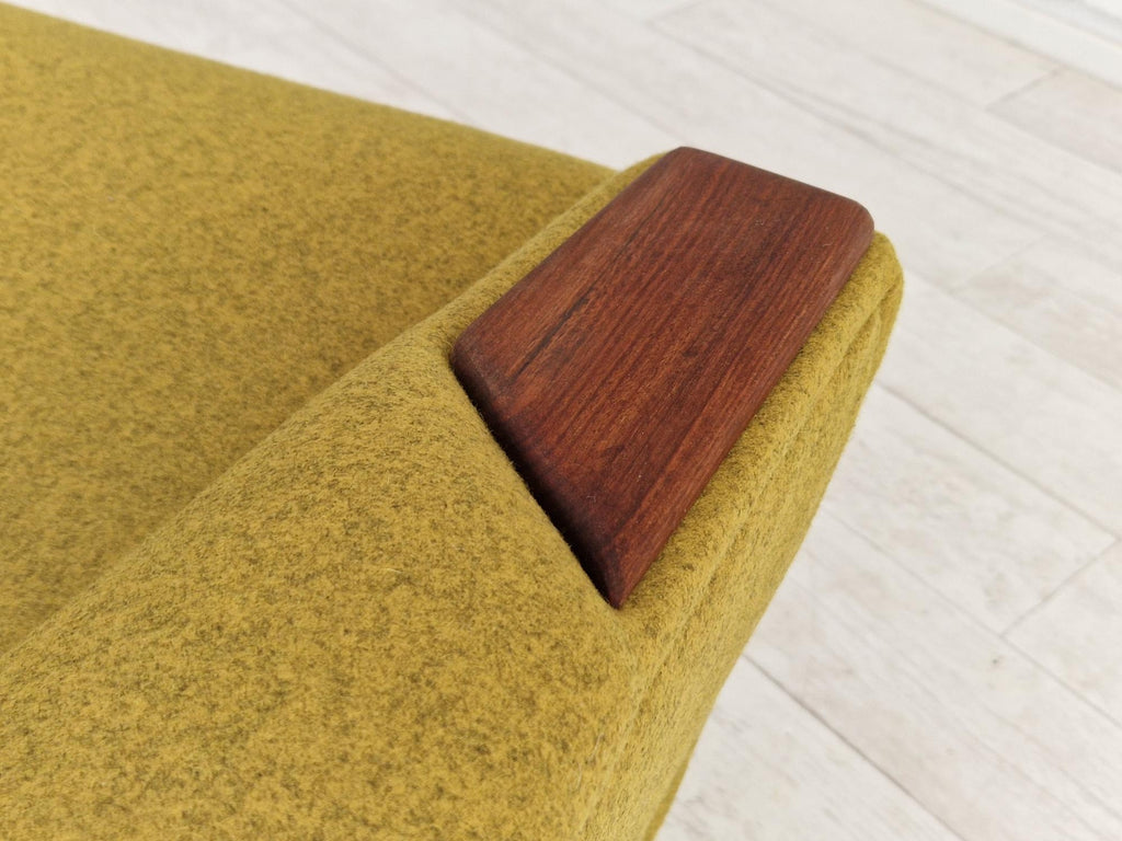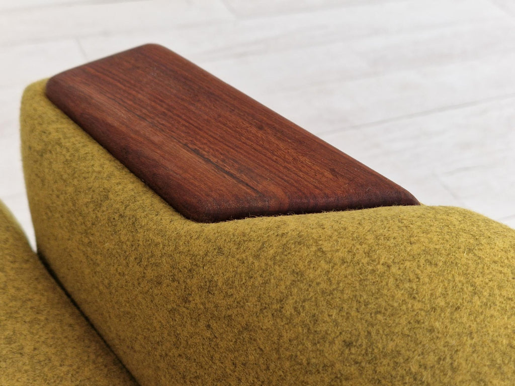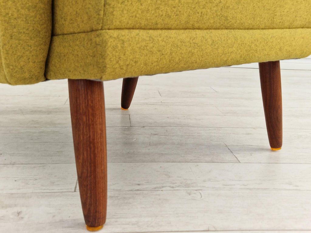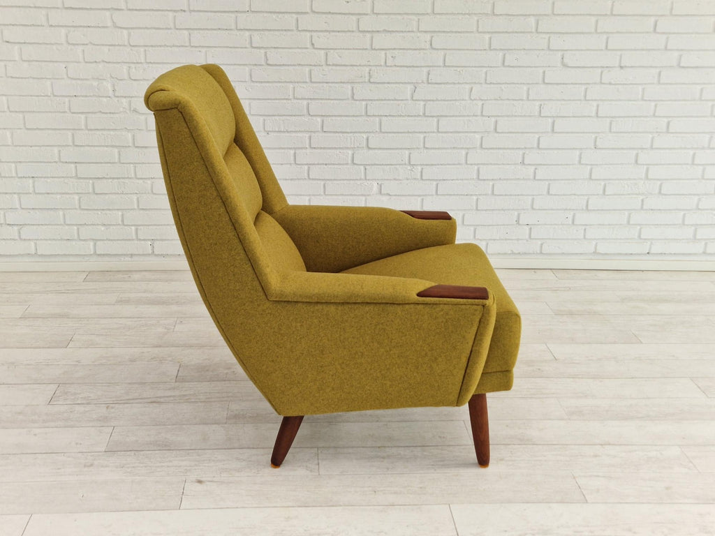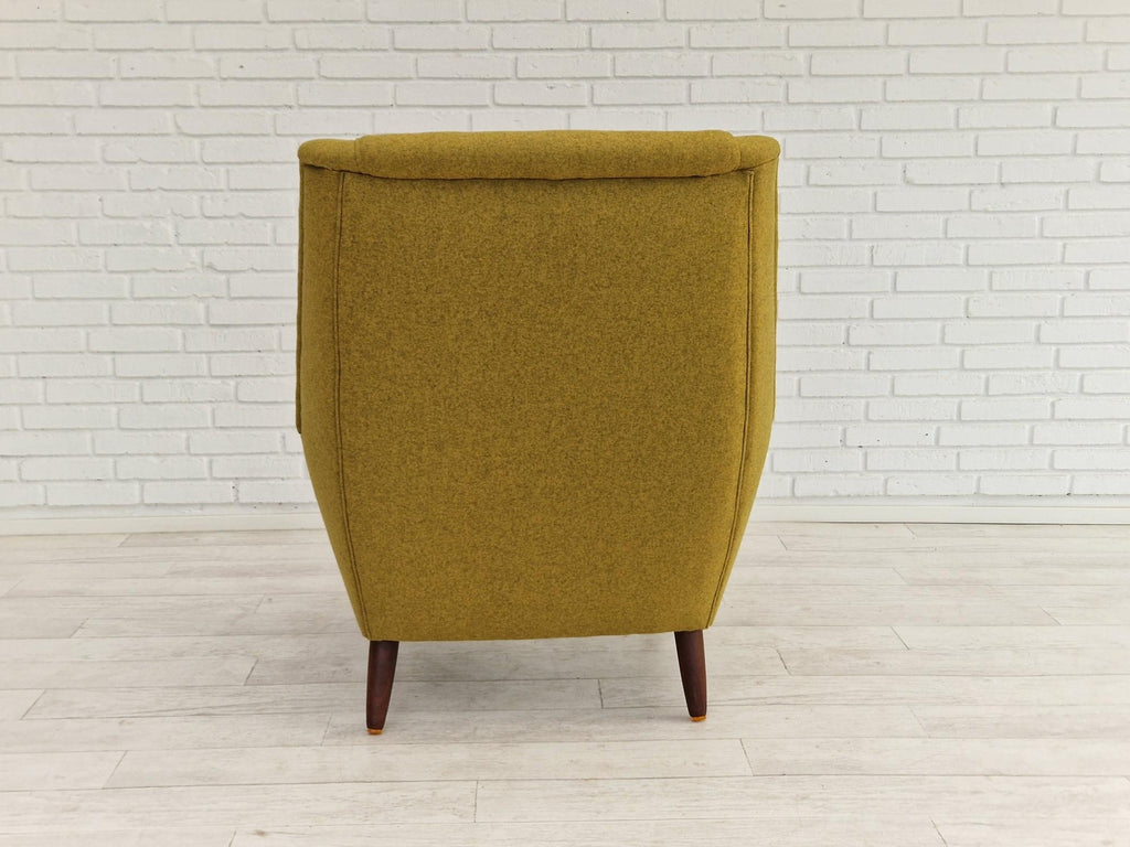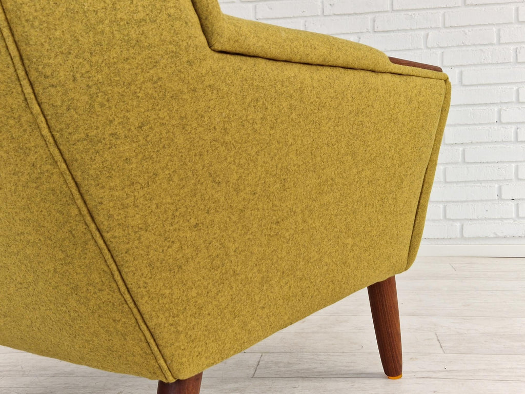 70년대, 덴마크 디자인. 완전히 개조된 리포스터드 하이백 암체어. 품질 캐리 옐로우 펠트 가구 양모. 새로운 가구. 티크 나무로 만든 다리와 못. 시트의 원래 스프링은 그대로 유지됩니다. 1970년경 덴마크 가구 메이커에서 제조.