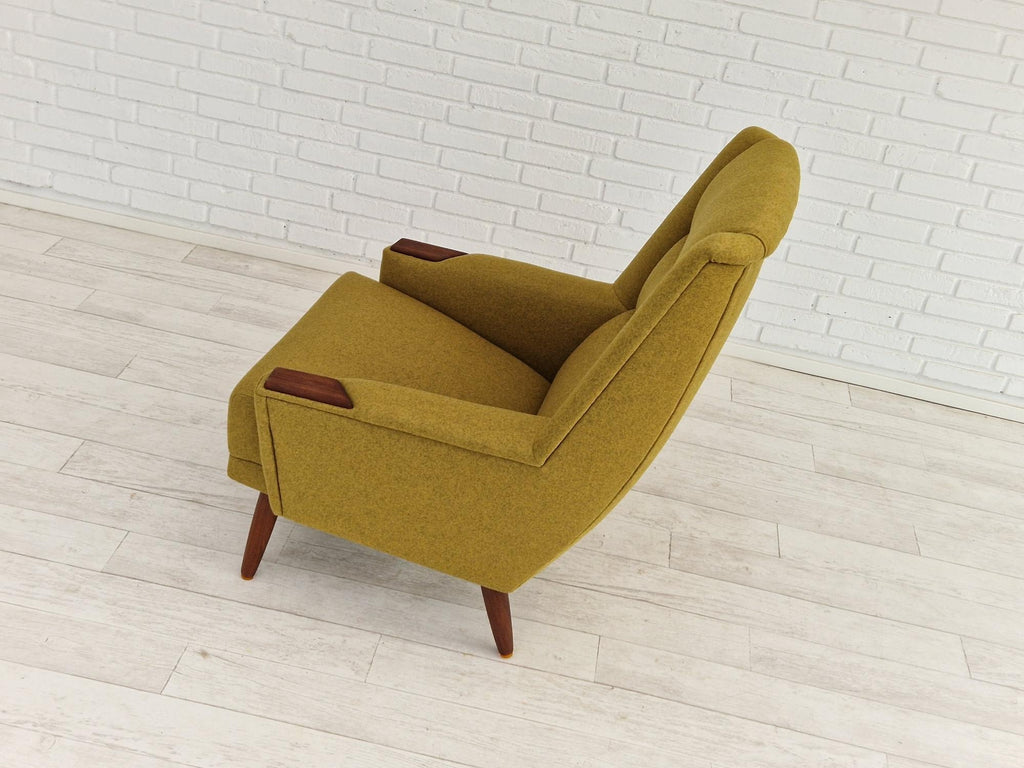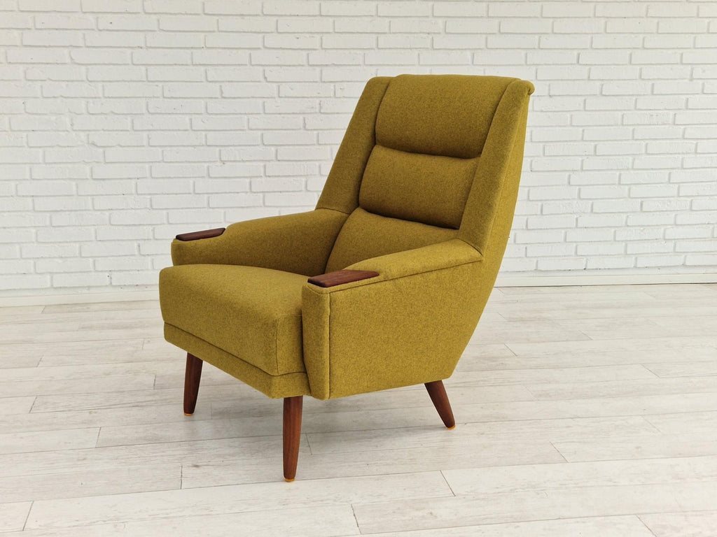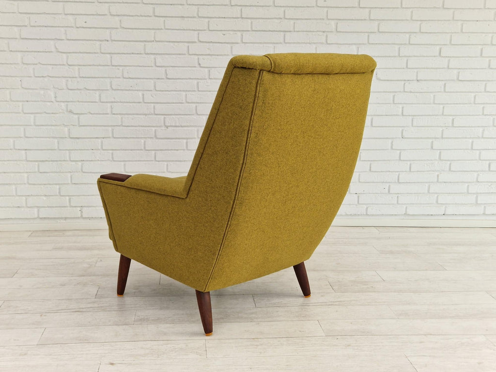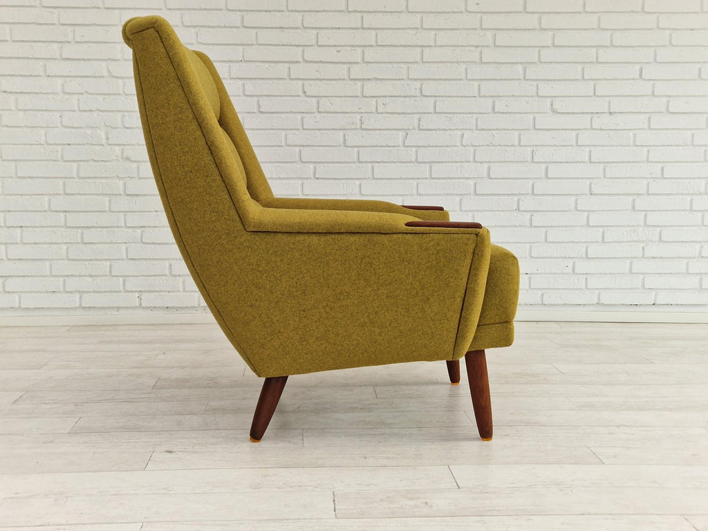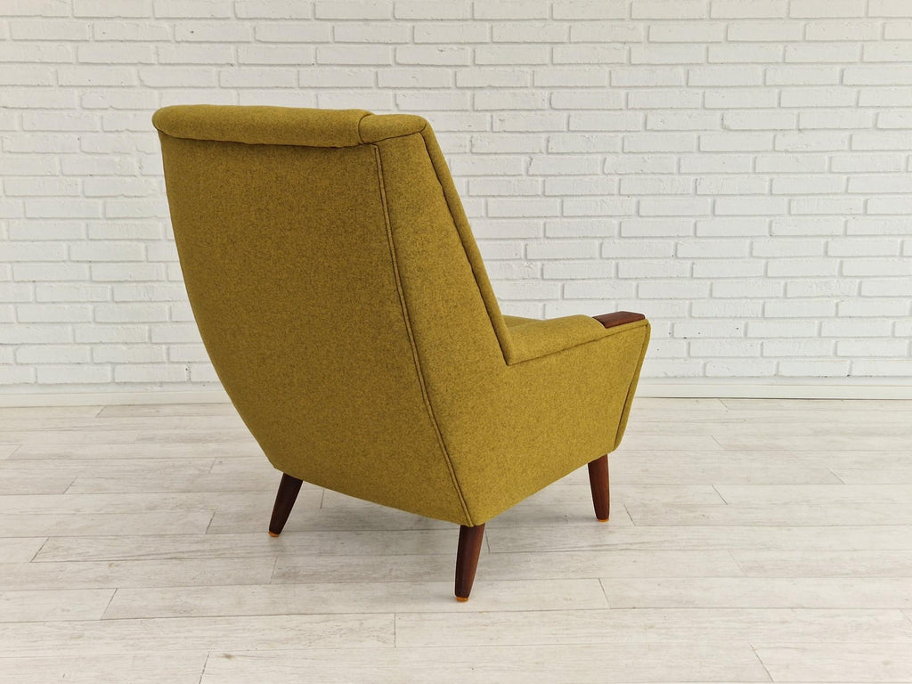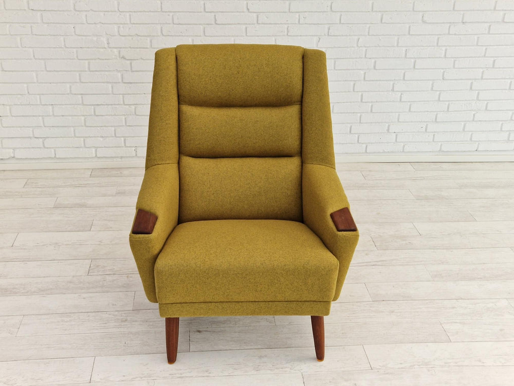 70s, Danish design, refurbished high-back armchair, furniture wool, teak wood