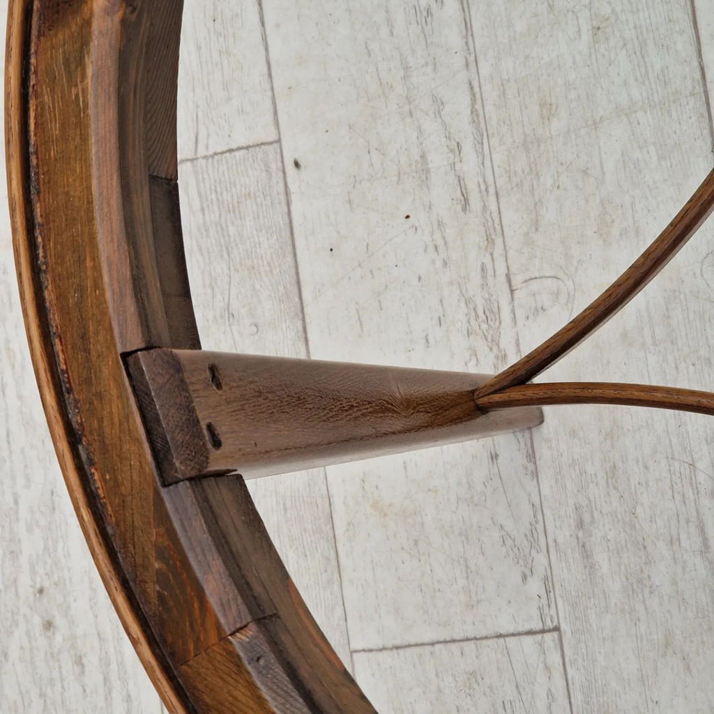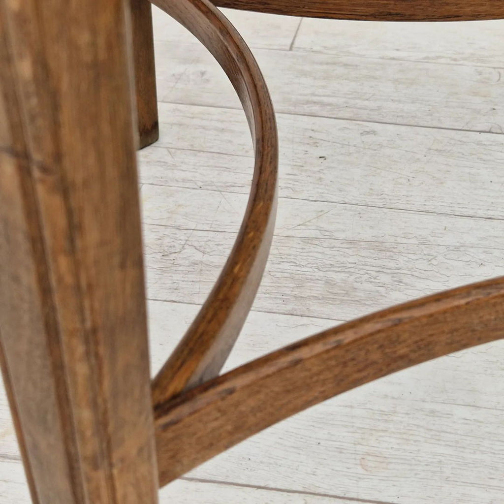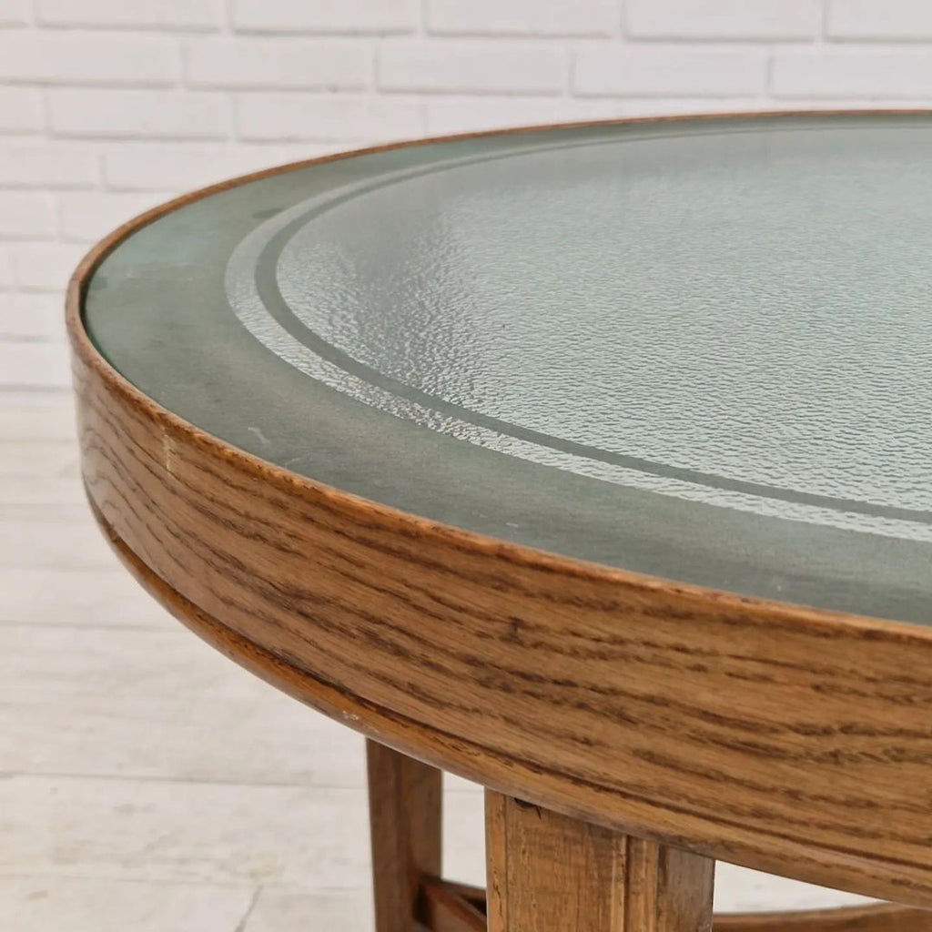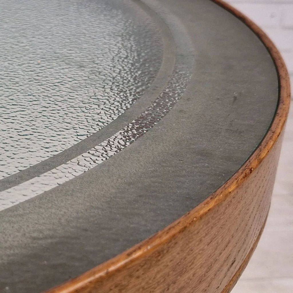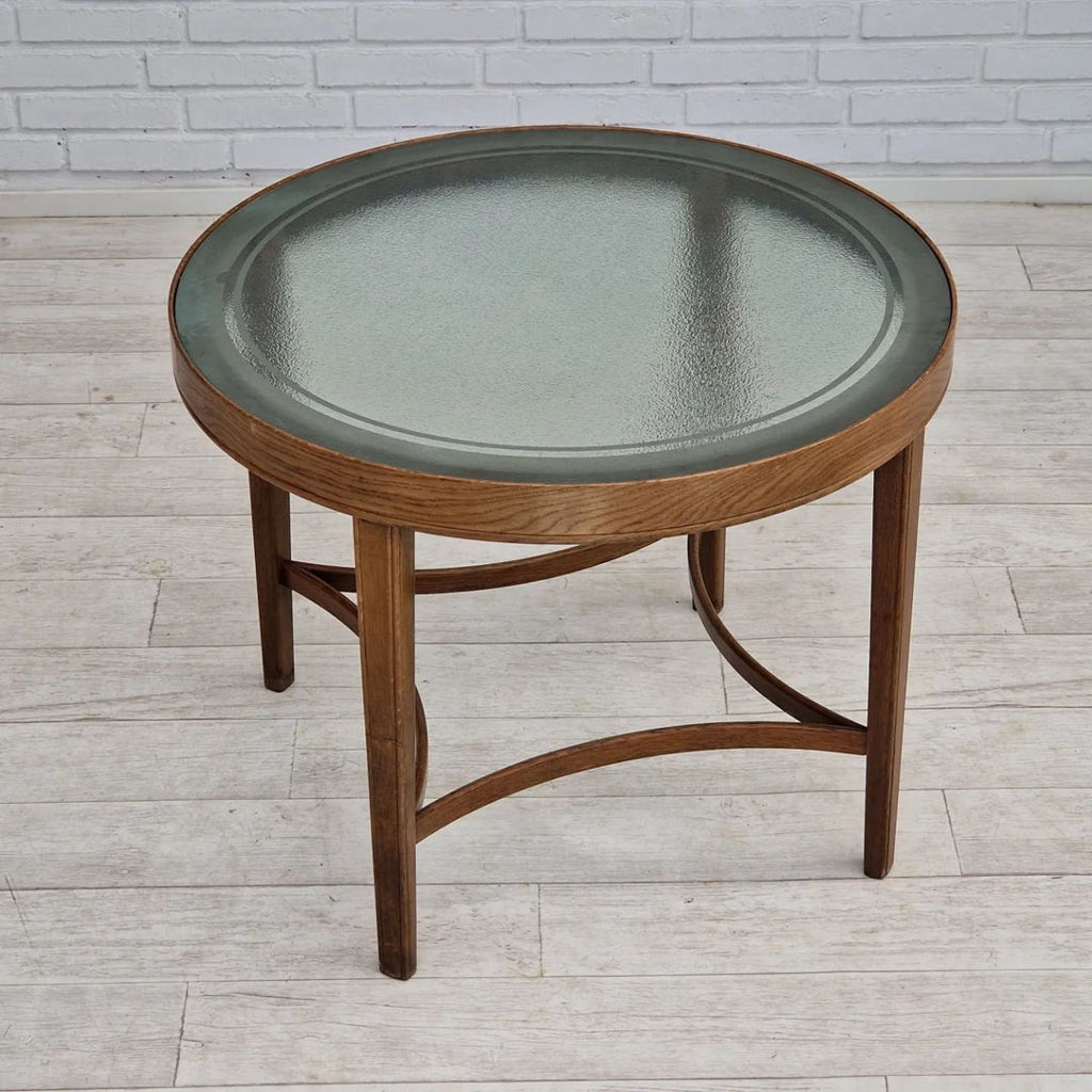 1950s, Danish design. Round coffee table. Glass top shaded edges. Oak wood, bent oak wood. Very good condition: no smells and no stains.