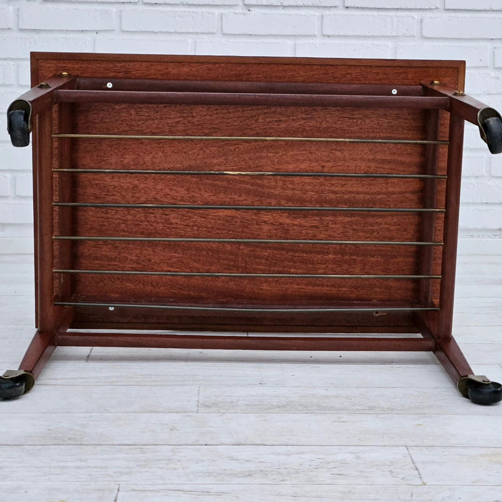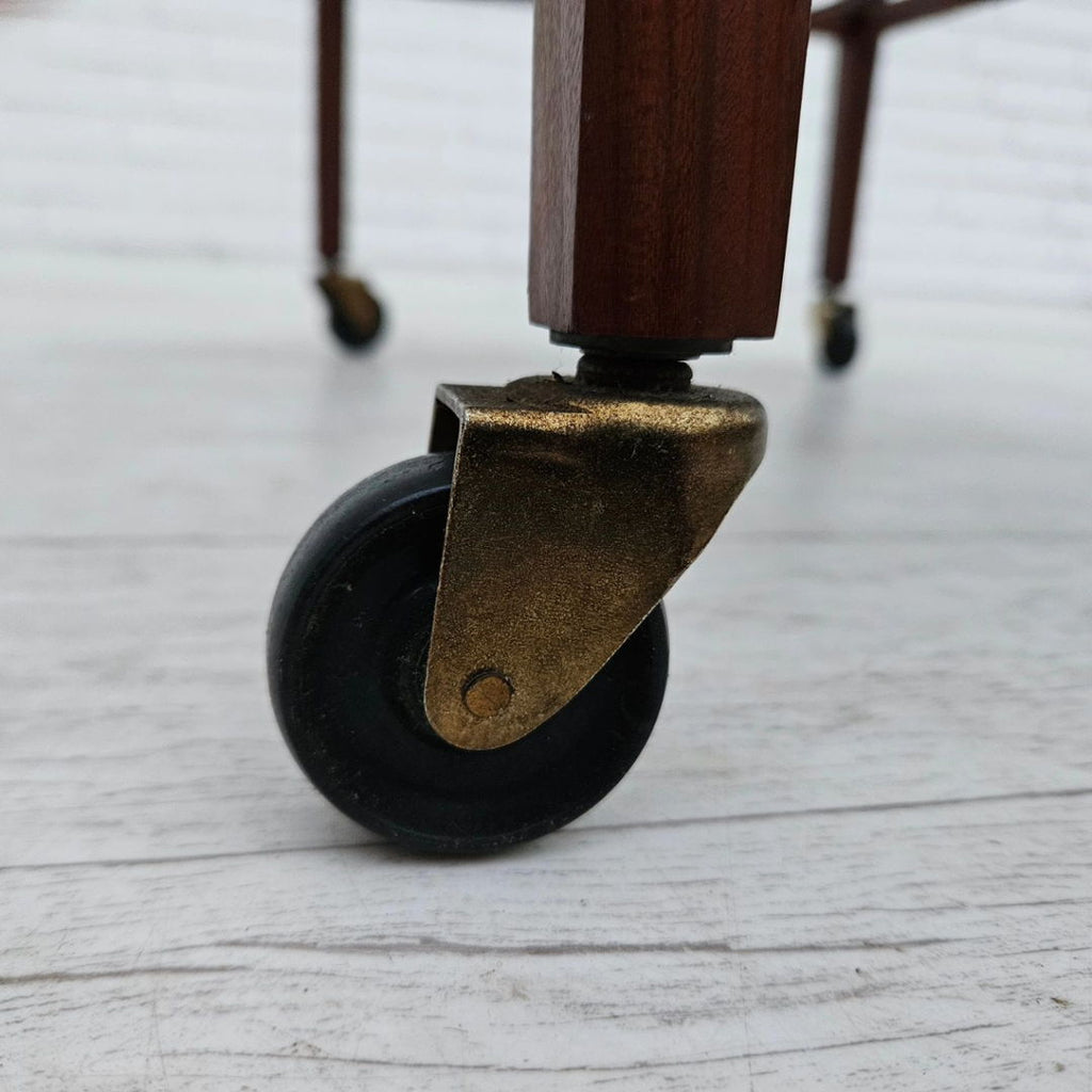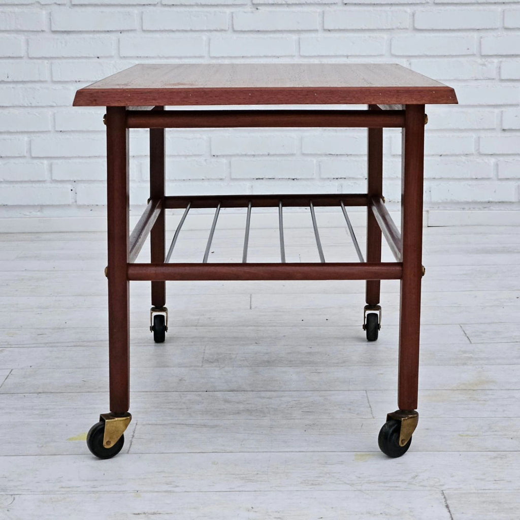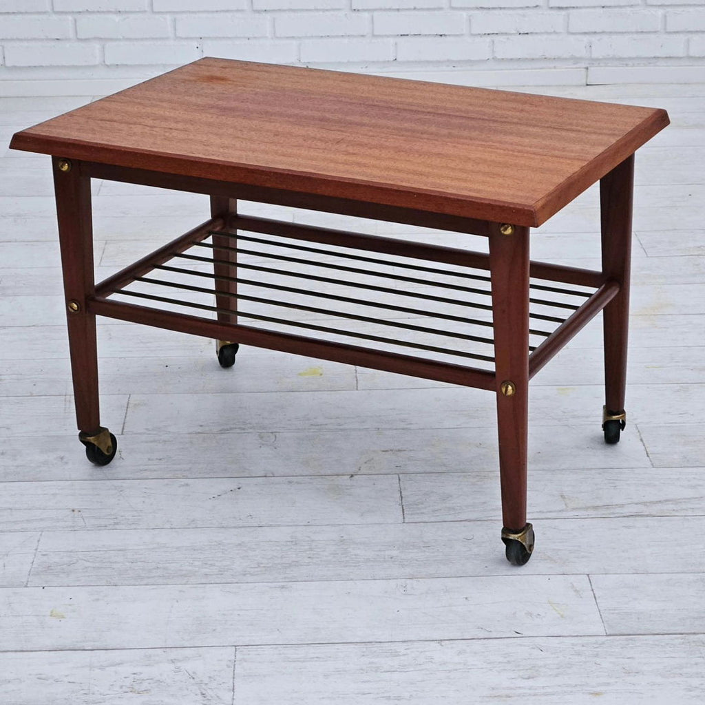 1970년대, 덴마크 바퀴 달린 커피 테이블. 티크재, 황동 막대가 있는 선반. 원래 상태 좋음.