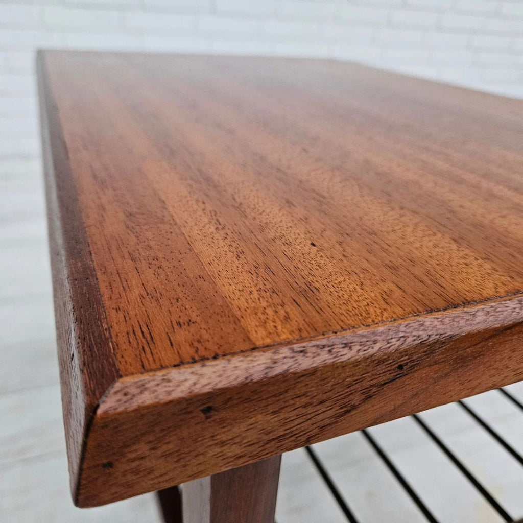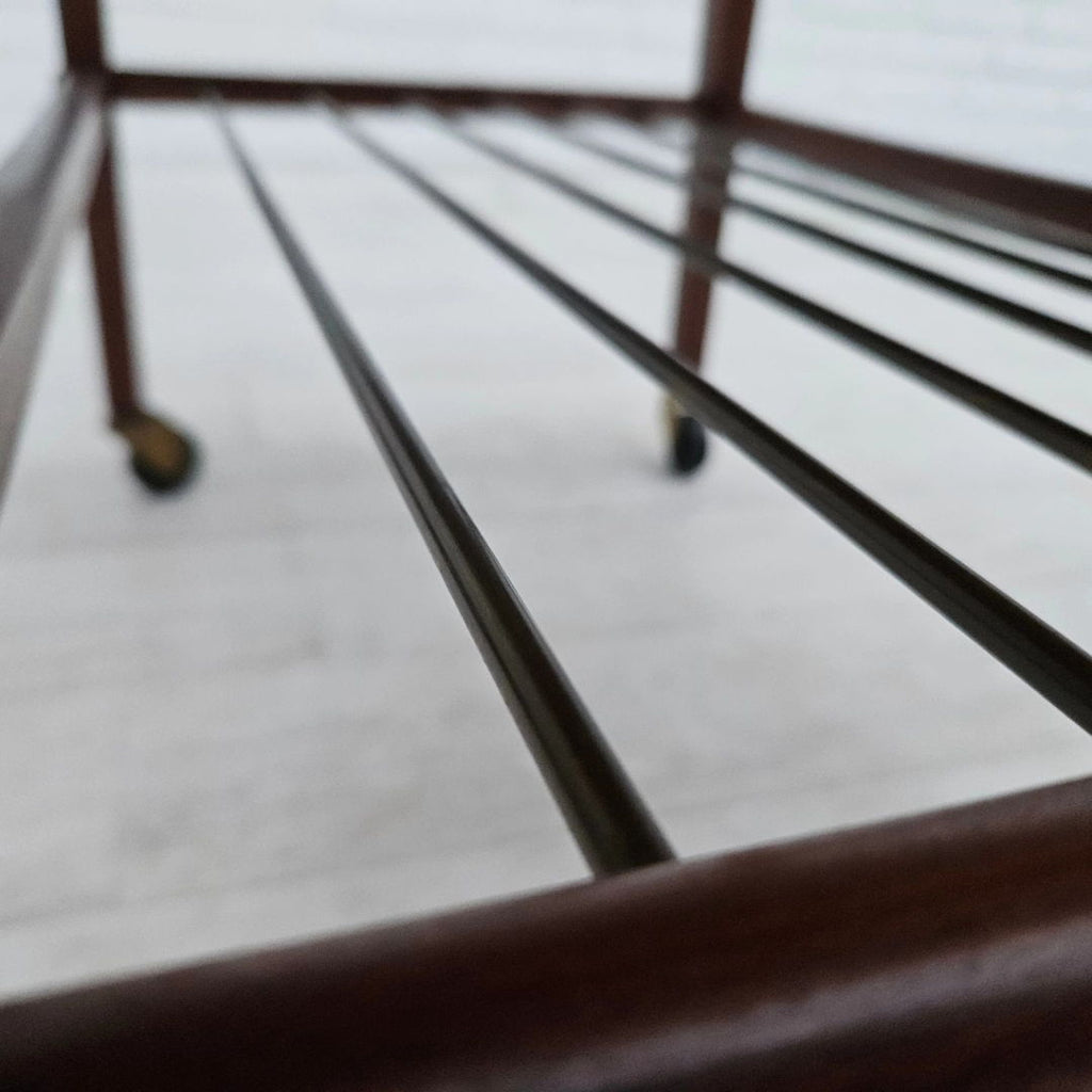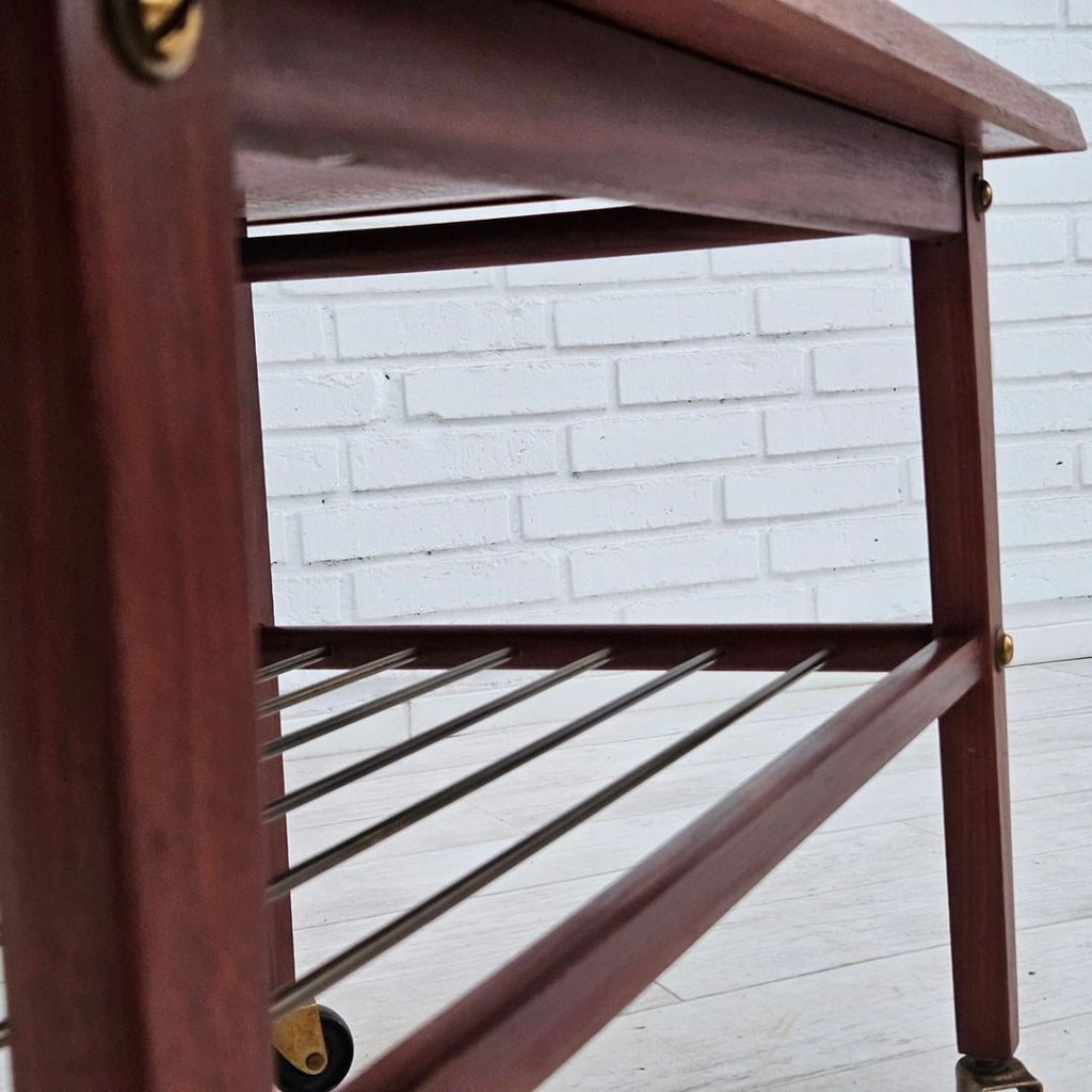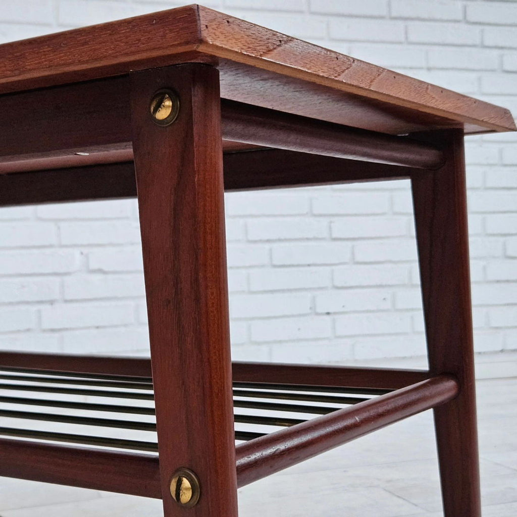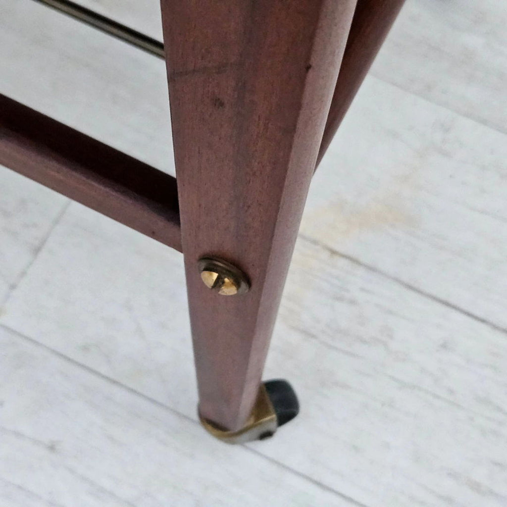 1970년대, 덴마크 바퀴 달린 커피 테이블. 티크재, 황동 막대가 있는 선반. 원래 상태 좋음.