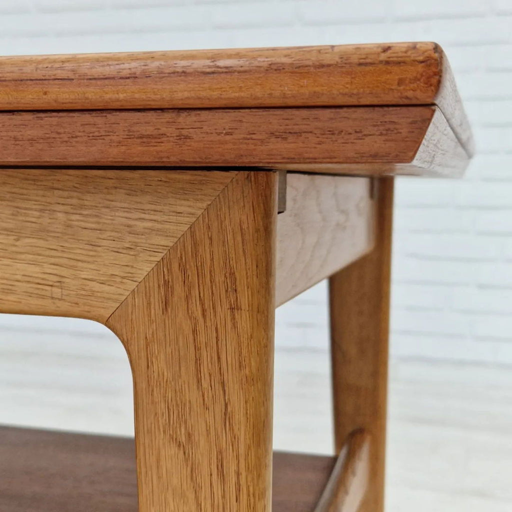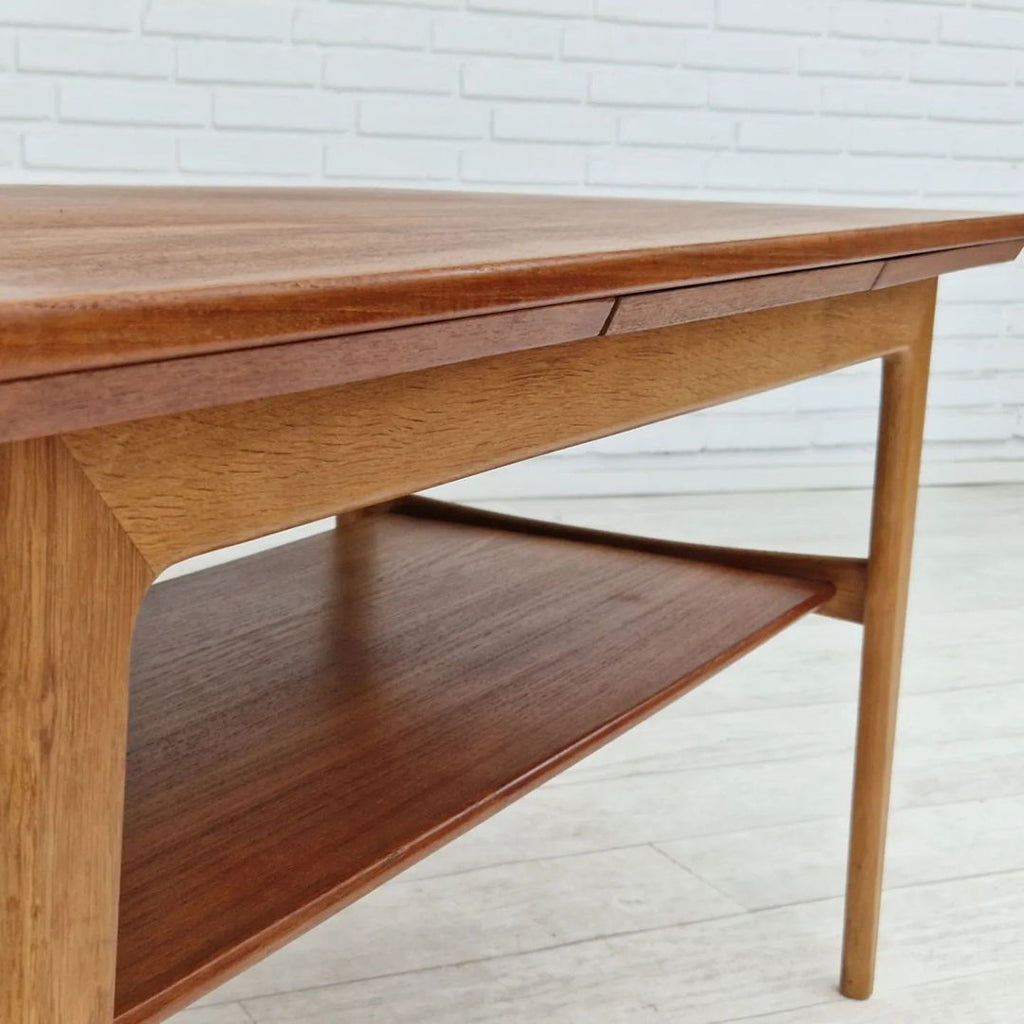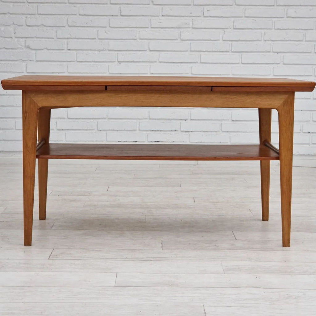 1970년대 덴마크 디자인. 접이식 소파 테이블. 티크재와 참나무. 상판은 티크재, 다리는 참나무로 제작되었습니다. 티크목재 선반. 원래 매우 좋은 상태: 냄새도 없고 얼룩도 없습니다. 접은 후 100cm + (2×33cm).