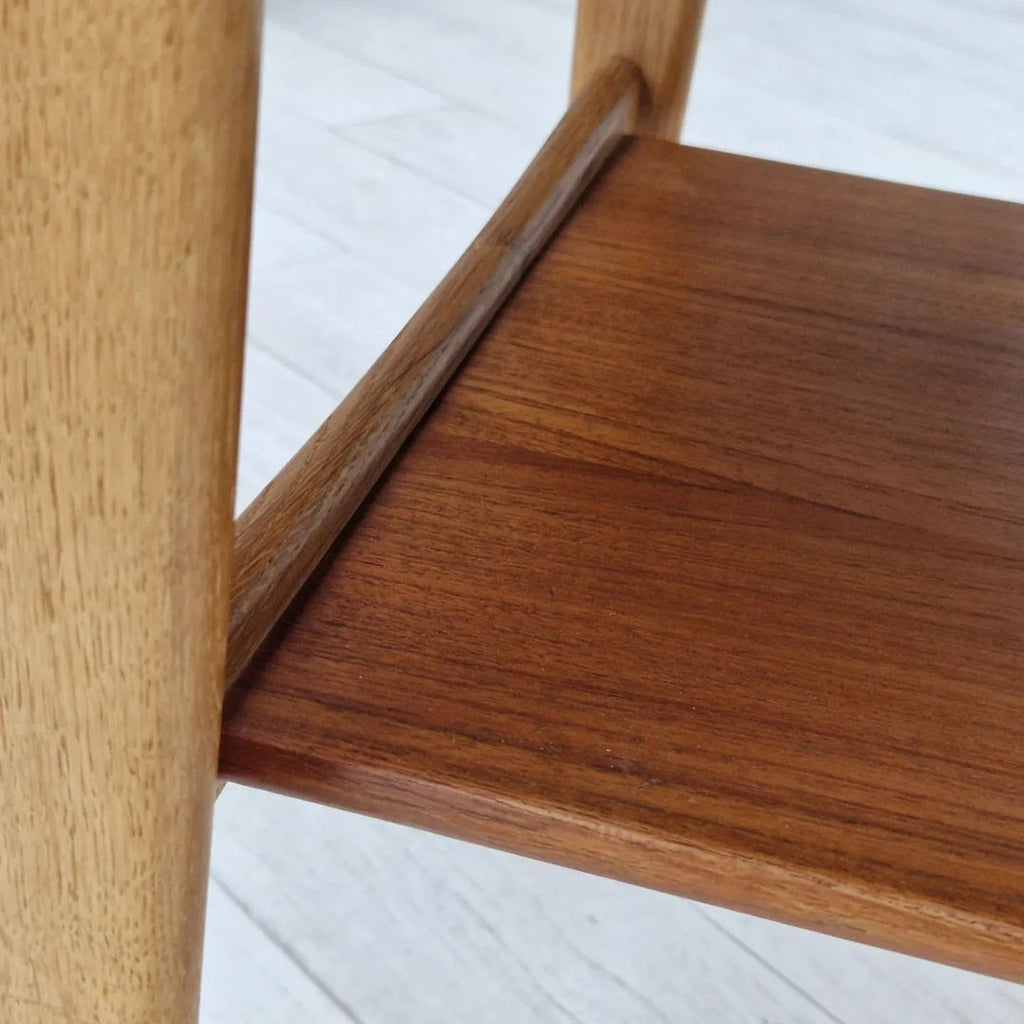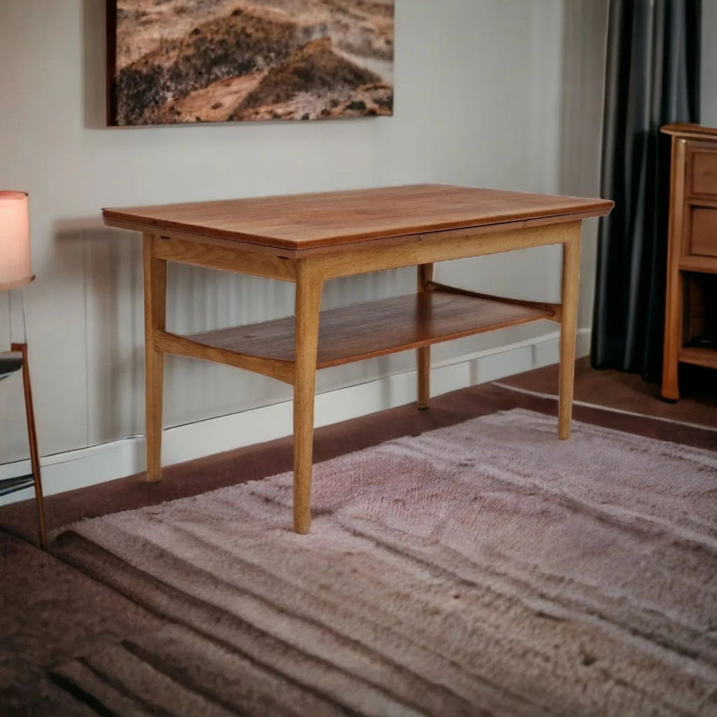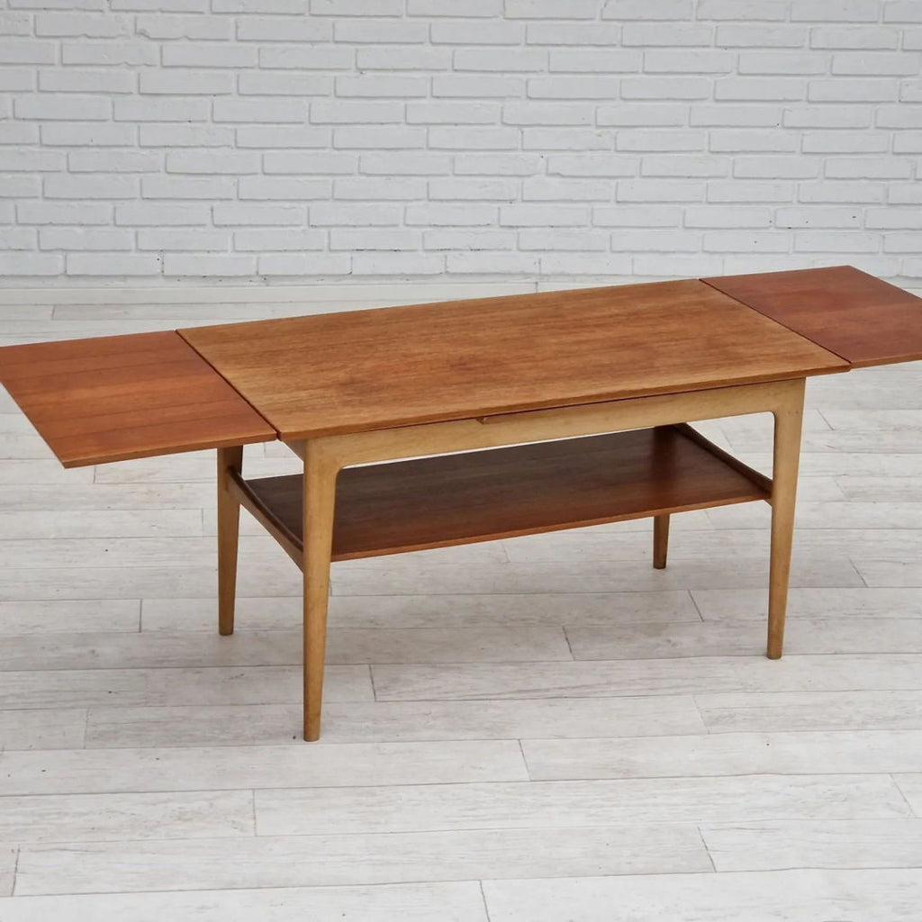 1970년대 덴마크 디자인. 접이식 소파 테이블. 티크재와 참나무. 상판은 티크재, 다리는 참나무로 제작되었습니다. 티크목재 선반. 원래 매우 좋은 상태: 냄새도 없고 얼룩도 없습니다. 접은 후 100cm + (2×33cm).