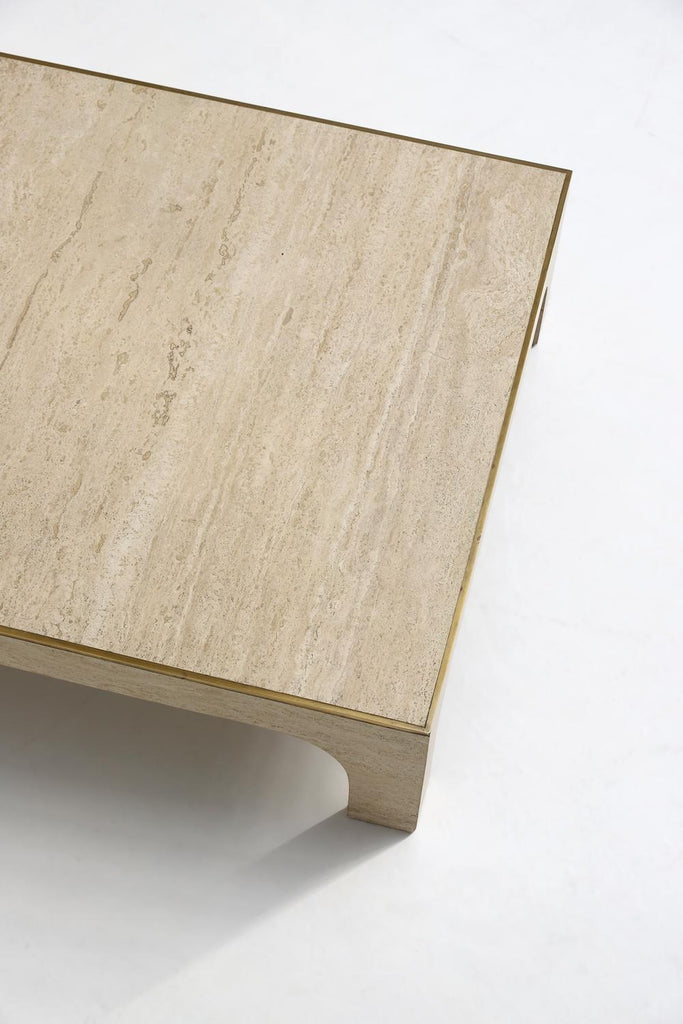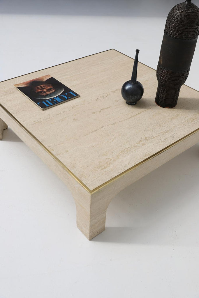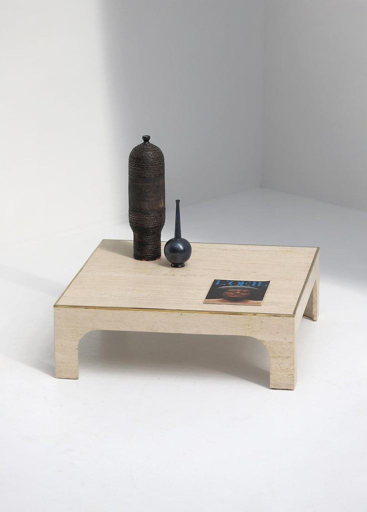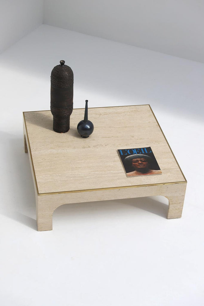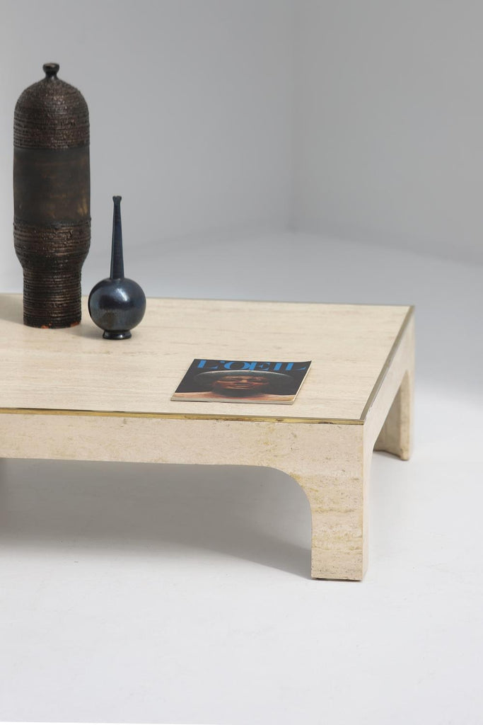 1970년대 Willy Rizzo 트래버틴 커피 테이블. 이 모델은 완전히 트래버틴으로 만들어졌으며 황동 라인으로 디테일합니다. 커피 테이블은 균열이나 자국 없이 아주 좋은 상태를 유지하고 있습니다.
